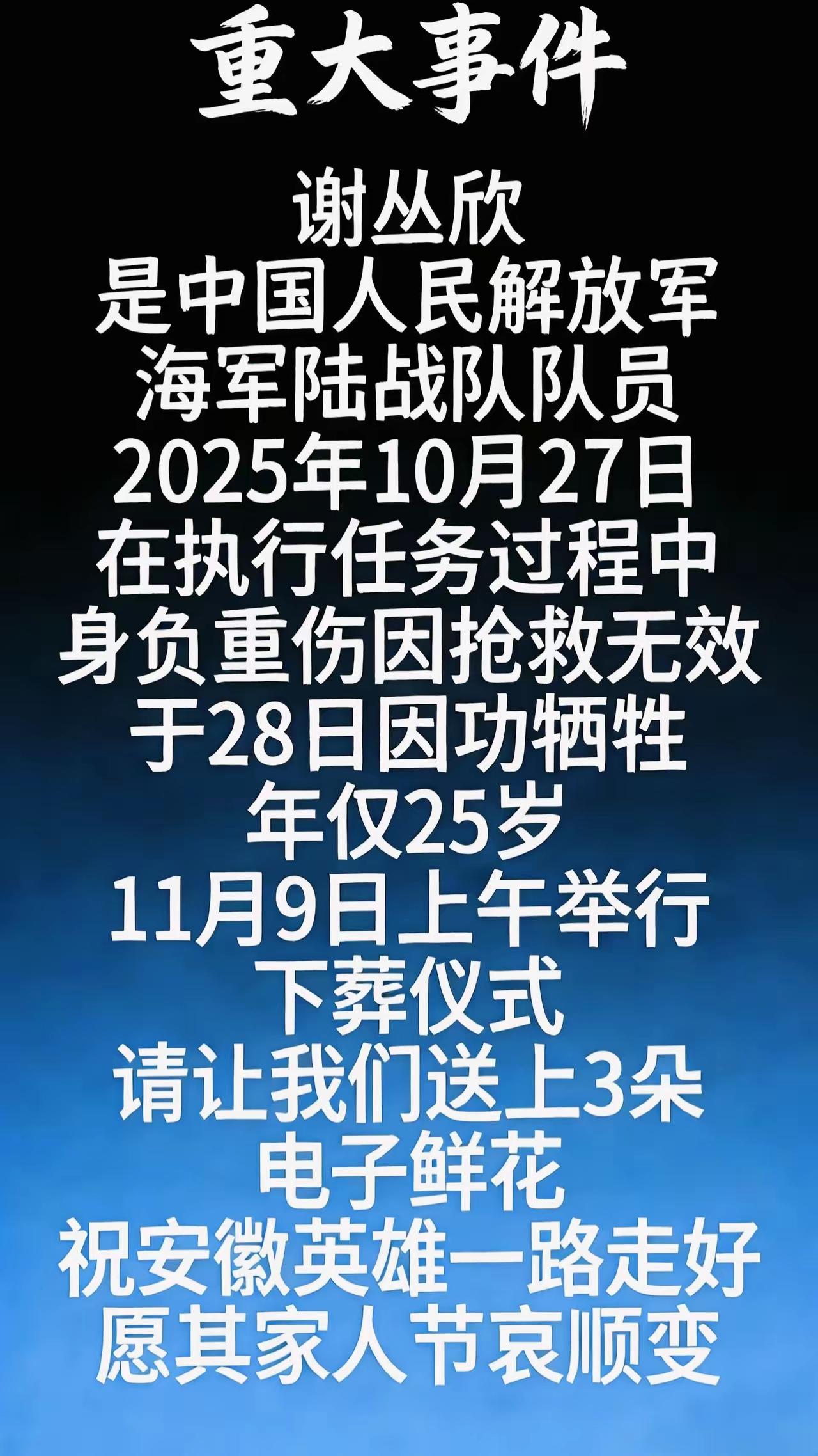 25岁的青春,永远定格在执行任务的瞬间 海军陆战队战士谢丛欣,安徽蒙城的好儿郎,7枚军功章是他留给祖国的勋章,却再也回不到家乡的怀抱。 25岁啊,正是爹妈还盼着他回家吃口热饭的年纪,正是同龄人还在琢磨去哪玩、怎么闯的年纪。他却把最好的年华,都交给了那片深蓝的海,交给了一身藏不住荣光的迷彩。 谁也不知道他在执行任务时经历了什么,只知道他从来没在信里跟家里喊过苦。训练场上摸爬滚打,烈日下晒脱几层皮,风浪里练到吐,他都咬着牙扛过来。7枚军功章,哪一枚不是拿汗水甚至血水换来的。那是对他本领的认可,是对他忠诚的嘉奖,更是他用青春写就的答卷。 他是安徽蒙城的骄傲,是街坊邻里嘴里那个懂事又争气的娃。小时候听着军营的故事长大,心里早就埋下了当兵报国的种子。长大后果断穿上军装,告别爹娘,一头扎进海军陆战队这个尖刀部队。他知道这身军装的重量,知道肩上扛着的是万家灯火的平安。 他走了,走得那么突然,把青春永远定格在冲锋的瞬间。再也不能陪爸妈唠唠家常,再也不能回故乡看看熟悉的田野,再也不能和战友们并肩站在甲板上看日出。可他留下的,何止是7枚军功章。是刻在骨子里的忠诚,是军人的铁血担当,是让我们能安稳过日子的底气。 哪有什么岁月静好,不过是有人替我们负重前行。这些年轻的战士,把自己的生死置之度外,用血肉之躯筑起一道坚不可摧的防线。谢丛欣这个名字,会被我们记在心里。他是英雄,是安徽蒙城的好儿郎,是祖国永远的好战士。 我们享受着和平的阳光,可不能忘了,这份和平是多少人用生命换来的。他们的青春定格在了最美的年华,却让更多人的青春能肆意绽放。这份恩情,我们永远不能忘。 各位读者你们怎么看?欢迎在评论区讨论。