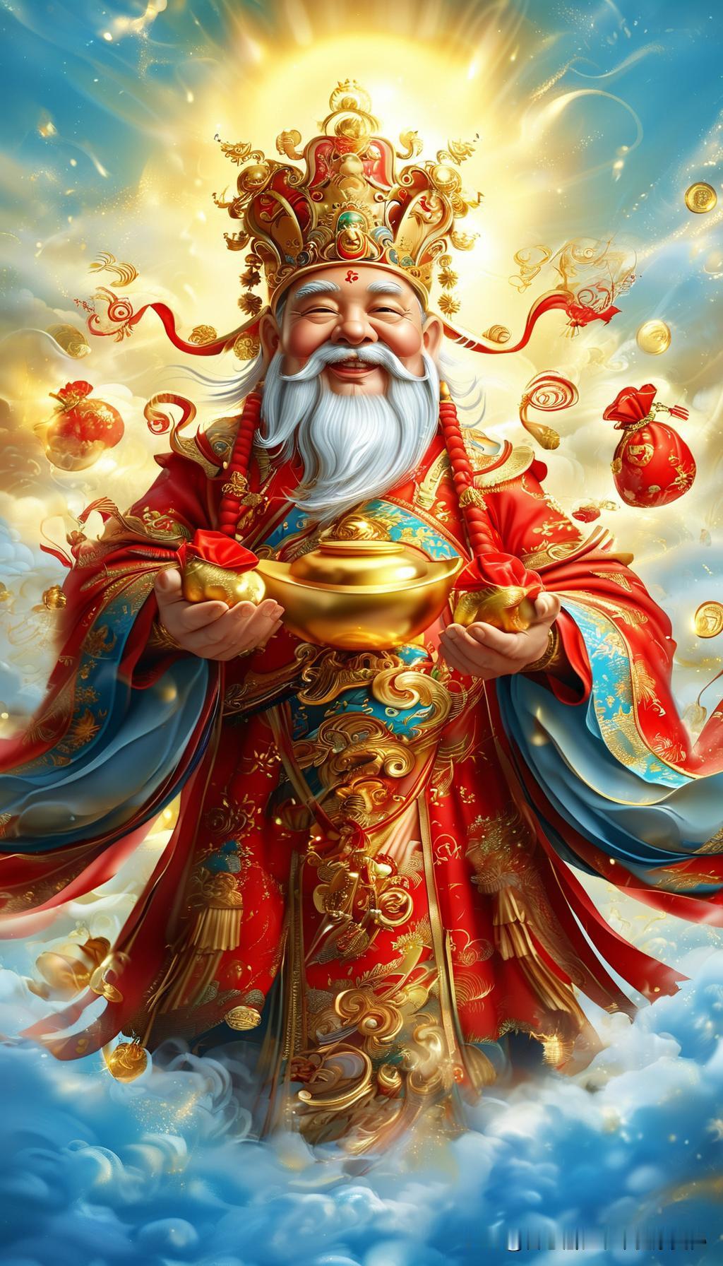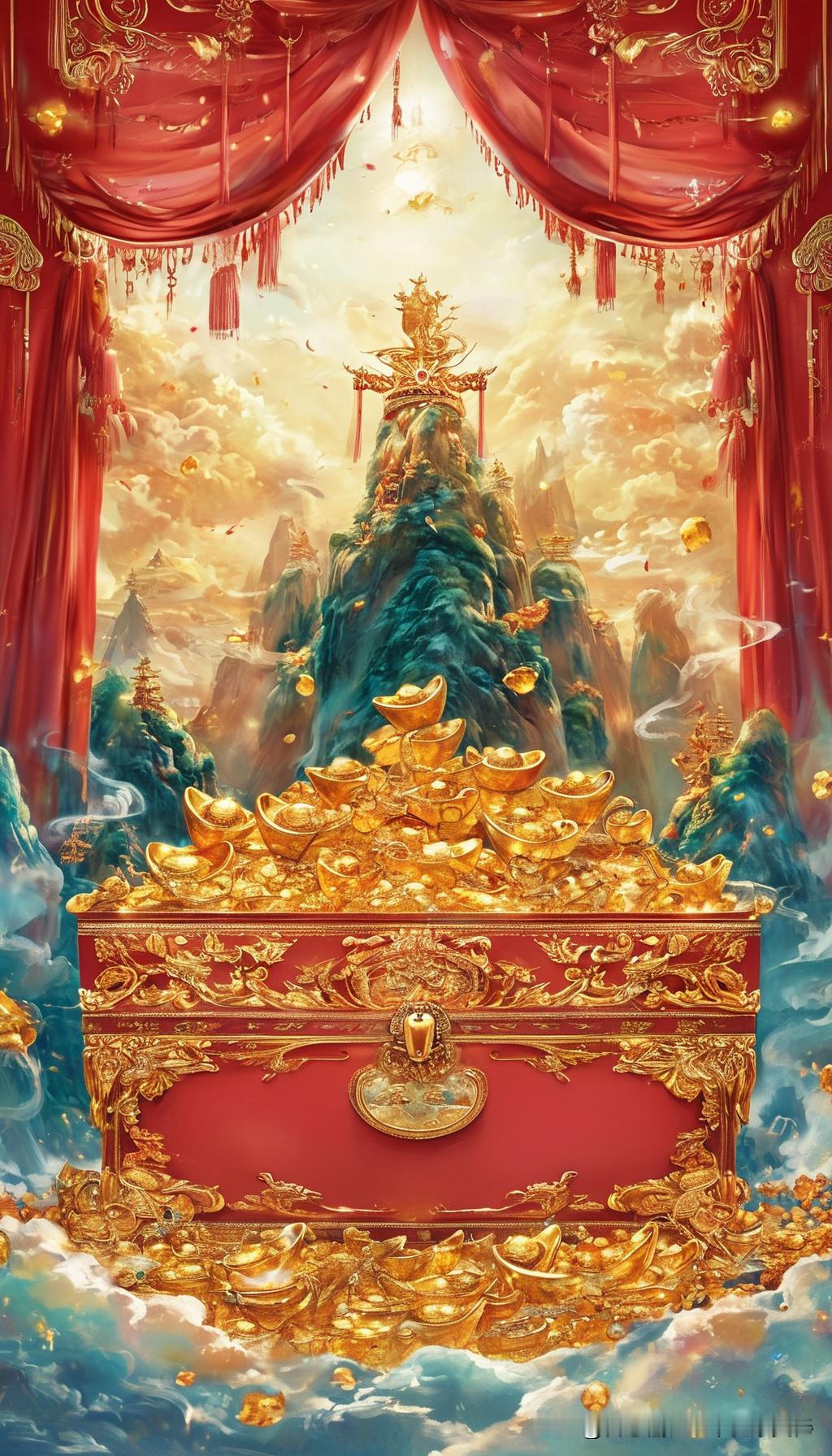 早安!吉祥!我来送宝了,接住哦:一幅金色光辉的财宝堆积在华丽的宝箱中,周围飘散着