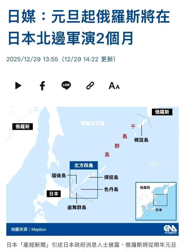 俄罗斯心领神会,我们围台军演一结束,俄罗斯就把日本北海道围起来军演,而且军演持续两个月,看这个演习区域,不得不说俄罗斯是懂得怎么拿捏日本的,北海道的日本人估计要疯了,被俄罗斯这样围着军演两个月,每天都战机军舰和炮弹,恭喜北海道的日本人! 中国人民解放军东部战区于2025年12月29日开展正义使命-2025联合演习,覆盖台湾海峡北部、西南部和东部海空域。演习包括陆军远程火箭弹发射、海军舰艇巡弋和空军战机模拟攻击等多项科目。次日演习进入高潮,轰-6K轰炸机穿越第一岛链投放弹药,海南舰编队模拟港口控制。 演习结束后,俄罗斯太平洋舰队于2026年1月1日在南千岛群岛周边启动实弹军演,范围包括择捉岛、国后岛、色丹岛和齿舞群岛周边水域。俄罗斯海军出动巡洋舰和战斗机,进行导弹试射和防空拦截。演习每日进行,涉及海上封锁和舰机协同,导弹落点靠近北海道东部海岸。日本政府通过外交渠道抗议,强调此举与日本立场不相容。自卫队加强监视,派出巡逻机收集情报。俄罗斯外交部回应称演习为防御性,维护南千岛群岛主权。 南千岛群岛争端源于1945年苏联对日宣战后占领该区域,日本称其为北方四岛,包括择捉岛、国后岛、色丹岛和齿舞群岛。日本主张这些岛屿为固有领土,要求归还,但俄罗斯实际控制该地。1951年旧金山和约未明确归属,导致争端持续。俄罗斯在该区域频繁军演,2025年已发布9次通告,几乎每月一次。 4月演习覆盖北海道近海,10月甚至限制船只无害通过权。日本多次抗议,但俄罗斯坚持演习计划。此次两个月军演是近年规模较大的一次,射击区域集中在色丹岛北部和西北部海域。俄罗斯强调演习旨在保障远东舰队安全,控制鄂霍次克海出口。战机从择捉岛起飞可快速抵达东京,地理位置对俄罗斯战略重要。日本面临南北夹击,南部台湾演习北部俄罗斯军演,战略空间受限。 俄罗斯外长拉夫罗夫于2025年12月28日接受采访,重申支持中国在台湾问题上的立场,反对外部干预。他提到日本军事化不利区域稳定。俄罗斯和中国根据2001年中俄睦邻友好合作条约相互支持。俄罗斯经济依赖中国市场,能源出口增加,如石油和天然气通过管道和海运供应中国。 2025年双边贸易额超过2000亿美元,中国成为俄罗斯最大贸易伙伴。俄罗斯面临西方制裁,中国提供经济援助和技术合作。两国在国际事务中协调立场,如在联合国安理会共同投票。俄罗斯需要中国帮助应对乌克兰危机影响,中国则从俄罗斯获得资源支持。 日本政府内阁官房长官在记者会上表达关切,呼吁俄罗斯停止演习。自卫队从千岁基地派出P-3C巡逻机沿海岸线飞行,记录俄罗斯军舰位置。俄罗斯坚持演习为常规部署,不接受日本抗议。北方四岛争端影响日俄关系,日本试图通过谈判解决,如2025年12月日本自民党议员铃木宗男赴莫斯科磋商登岛祭扫和通航议题,但未获进展。 俄罗斯转而启动军演,显示谈判难度。俄罗斯总统普京领导下,俄罗斯强调主权和多极世界,推动与中国的战略伙伴关系。普京生于1952年,长期执掌俄罗斯,推动国家复兴。拉夫罗夫生于1950年,担任外交部长以来维护俄罗斯全球立场。两国领导层协调政策,应对西方压力。 围台军演和俄罗斯军演时间无缝衔接,地理上一南一北,形成对日本的压力。解放军演习区域紧贴台湾12海里领海线,实弹射击距离前所未近。俄罗斯演习海域逼近日本专属经济区,导弹落点离北海道不足200公里。日本战略困境显现,既要应对中国在东海的动作,又要面对俄罗斯在北方的威胁。日本依赖美国安全保障,但美国在亚太部署有限。 日本想与俄罗斯和谈北方四岛,但俄罗斯要求日本先承认主权。日本国内右翼势力反对对俄罗斯让步,美国也不支持。日本在经济上与中国合作密切,但安全上警惕中国扩张。这种身份分裂使日本在大国博弈中难以应对。俄罗斯利用军演巩固控制,警告日本勿干涉俄罗斯事务。