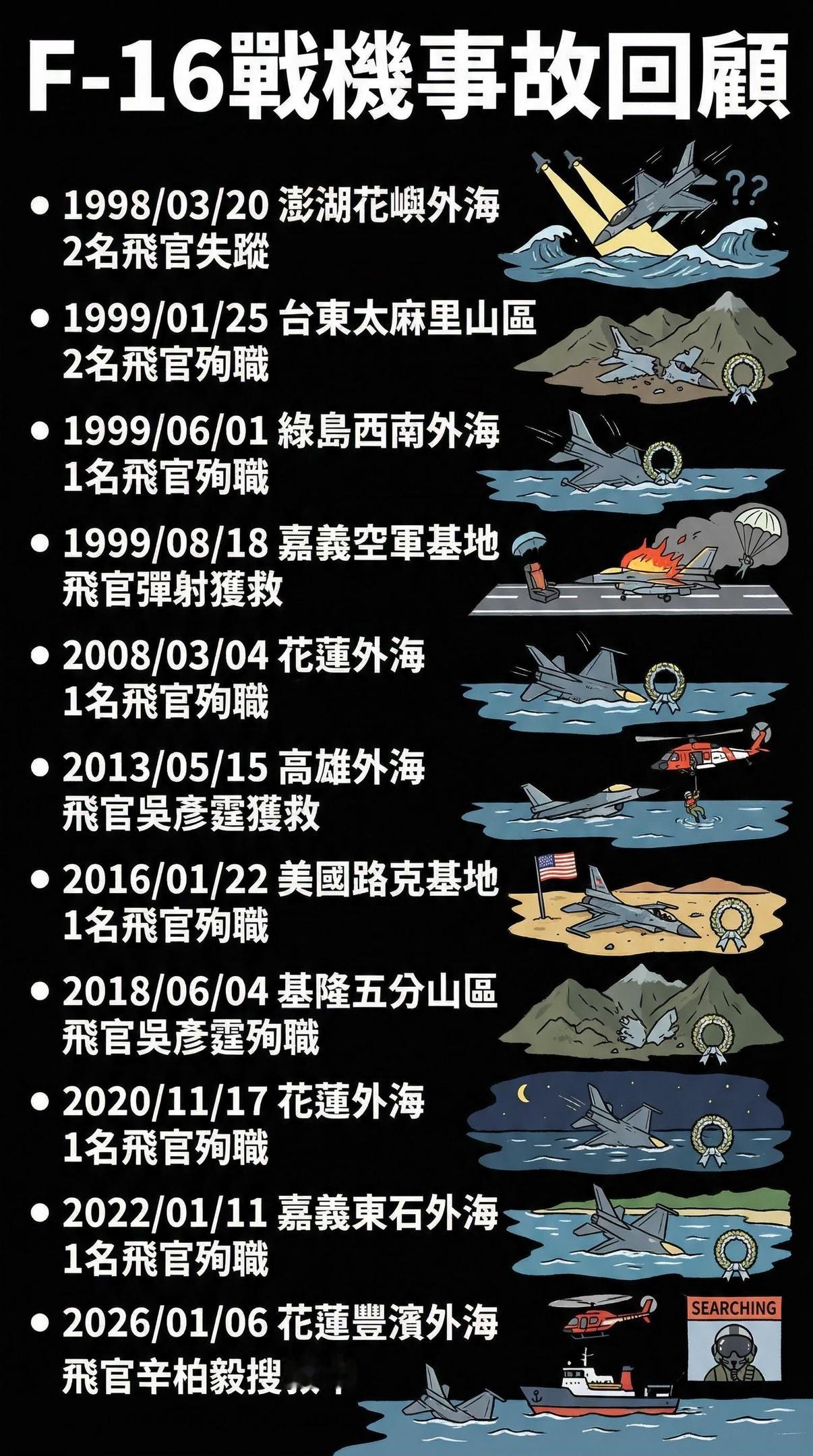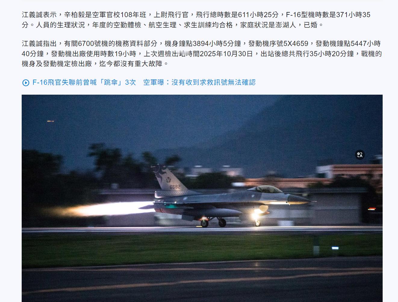 #台军F16战机训练时失事#【台媒:台军一架F-16战机夜间训练时失事,飞行员疑