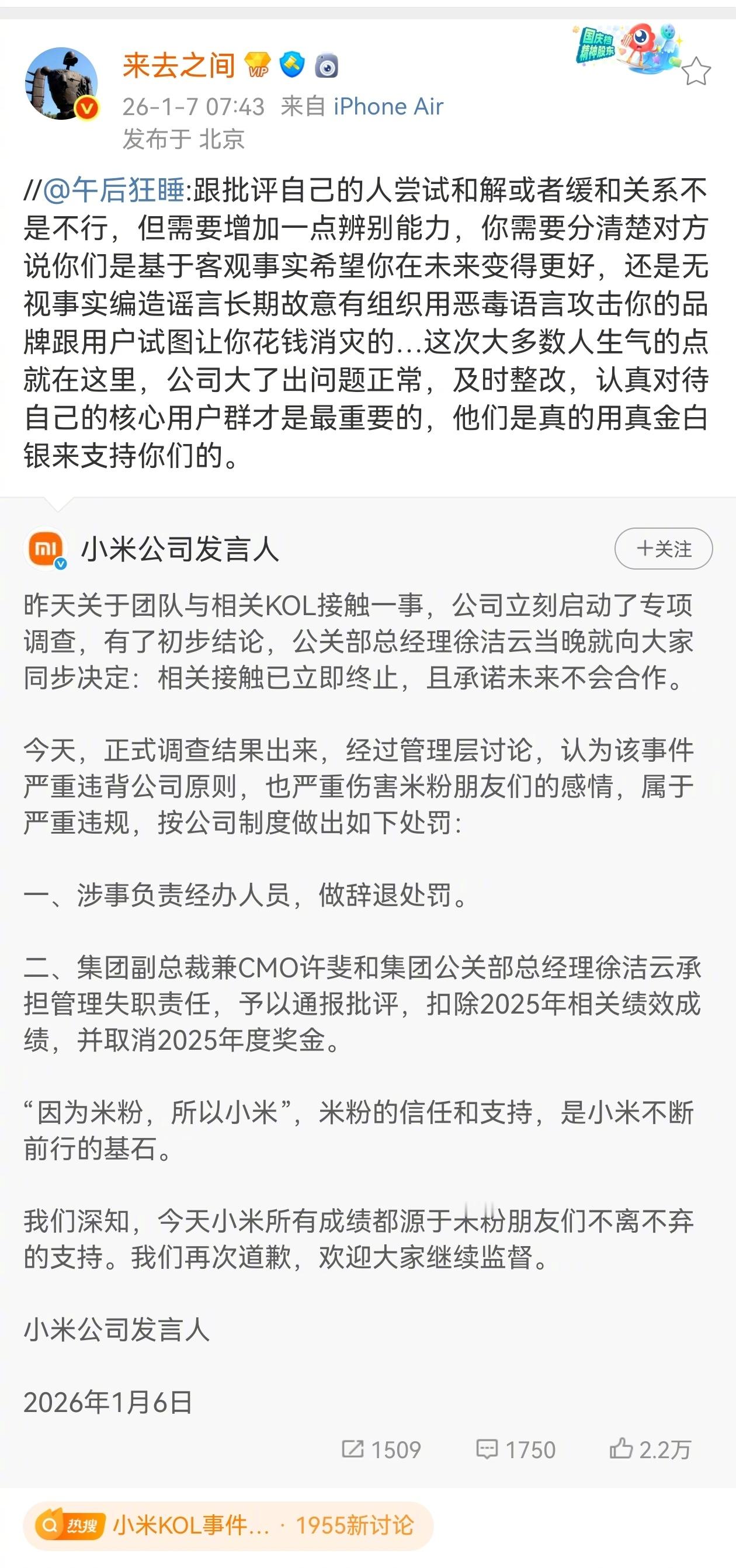 小米KOL事件经办人员被辞退许斐徐洁云2025年度奖金被取消这事闹得很大上了热搜
