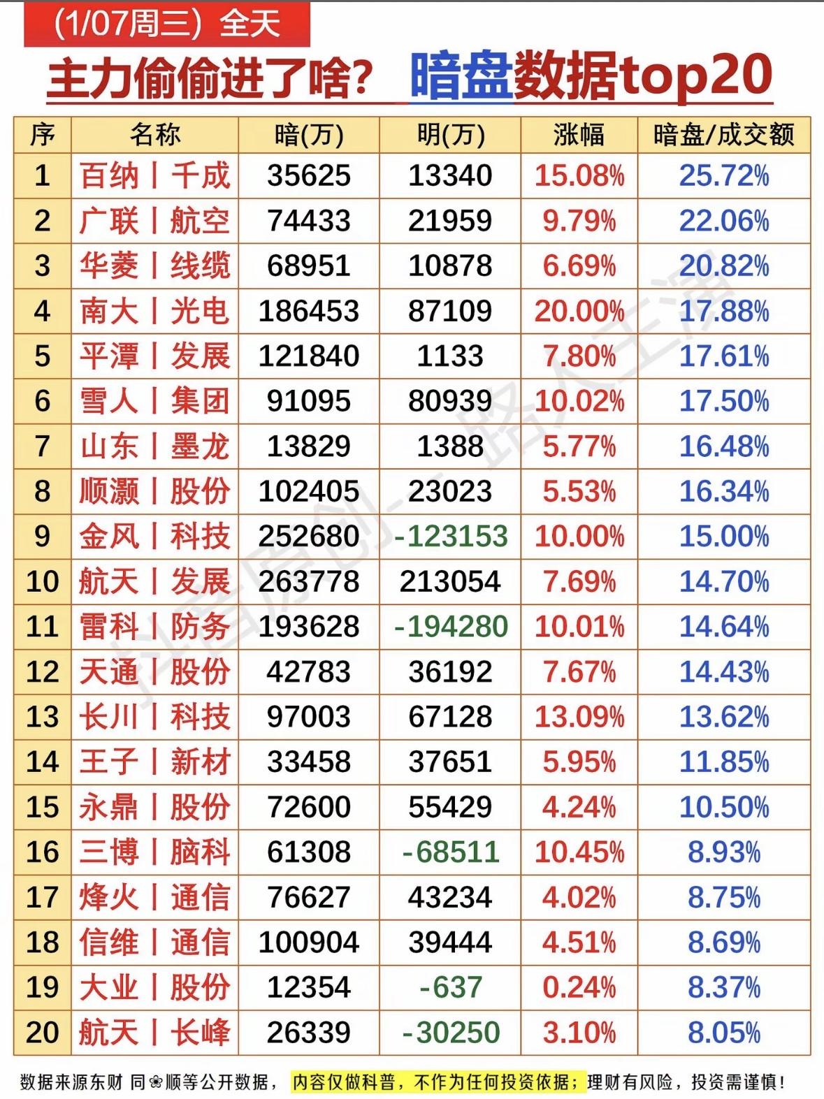 1月7日收盘暗盘数据显真章,市场风云变幻间。 暗盘异动!主力悄悄布局航空、光电、线缆等板块,多股涨幅亮眼。投资需谨慎,数据仅供参考。