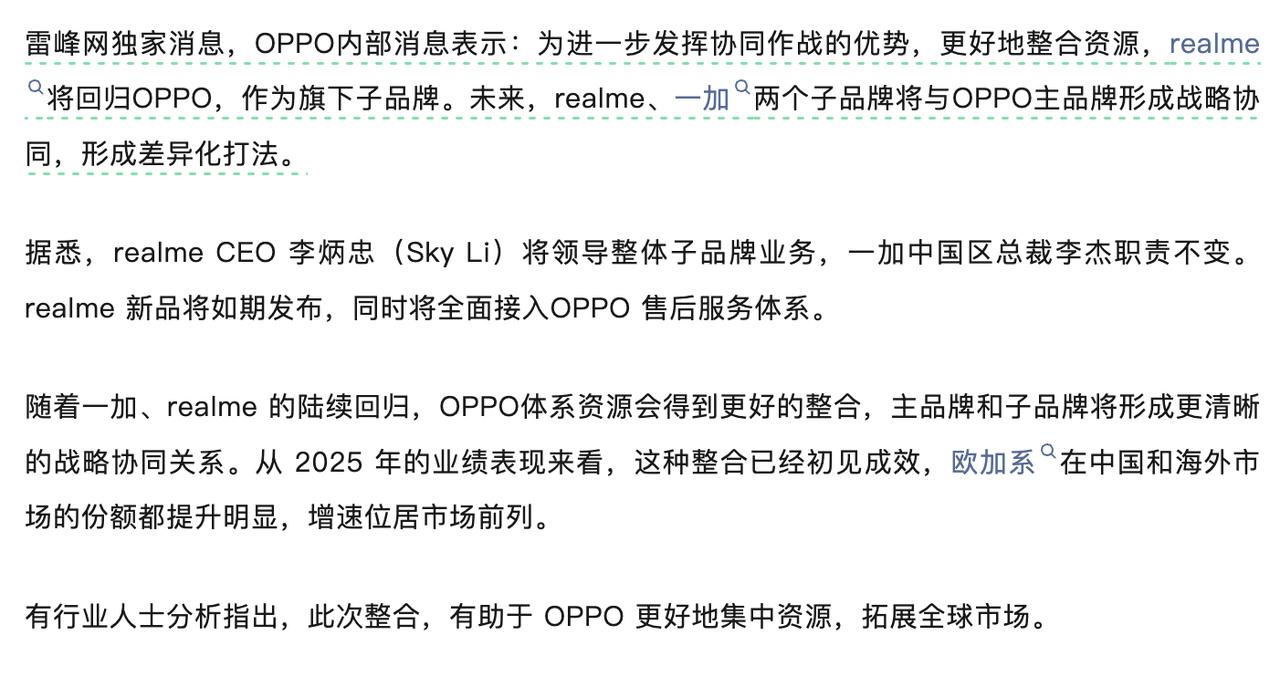前些天就有网传的消息,这会看来,是真的,realme手机将回归OPPO 。 资源的整合,回归之后realme也会重新接入OPPO的售后服务体系。不知道算不算冷知识,之前有一段时间realme也是在O的服务体系里面的,不过没多久还是作为独立运营。不过这会回归的话,对于realme来说售后服务体系又重新有优势了,挺好。之前realme被不少人担忧的一点是售后渠道的地方,这样就又完美解决了。 现在整个的行业都很卷,作为整体去运营,资源利用更好一些。主品牌和子品牌也需要更清晰的战略协同,同时这一步应该也是为了更好应对全球市场。 只是不知道,这样的一来接下去两个子品牌,会有怎样的分工。斗胆猜测一下,OPPO整体努力向上冲击高端市场,一加负责性能方向猛攻,realme负责在大众普及的影像路线,继续是越级方向,将一些更超前的技术做市场的试探和普及? 这样一来,各自之间也不会有冲突,同时也是更加细分面向人群的打法。