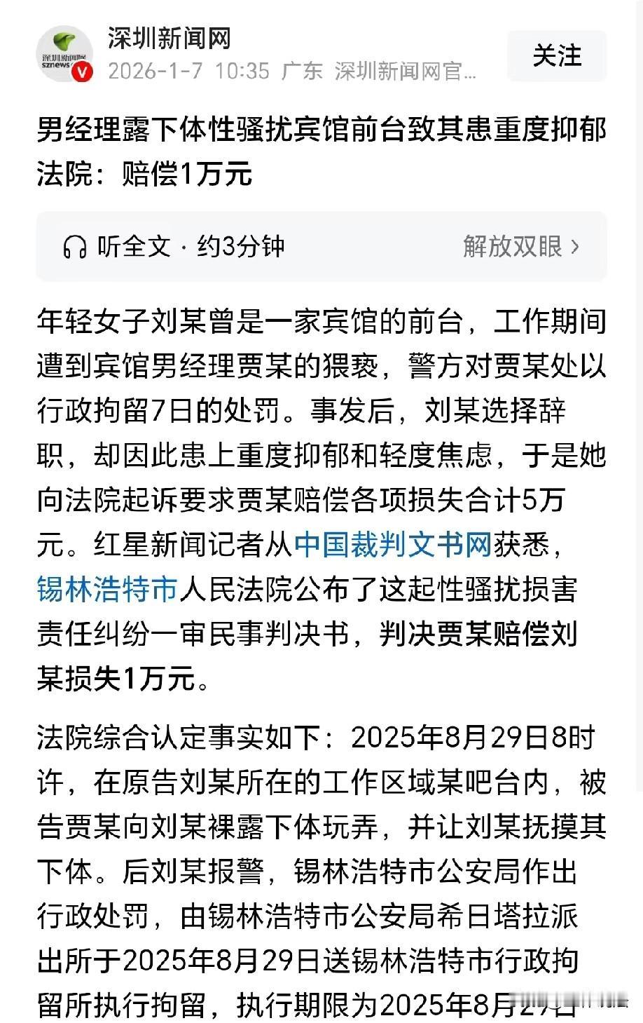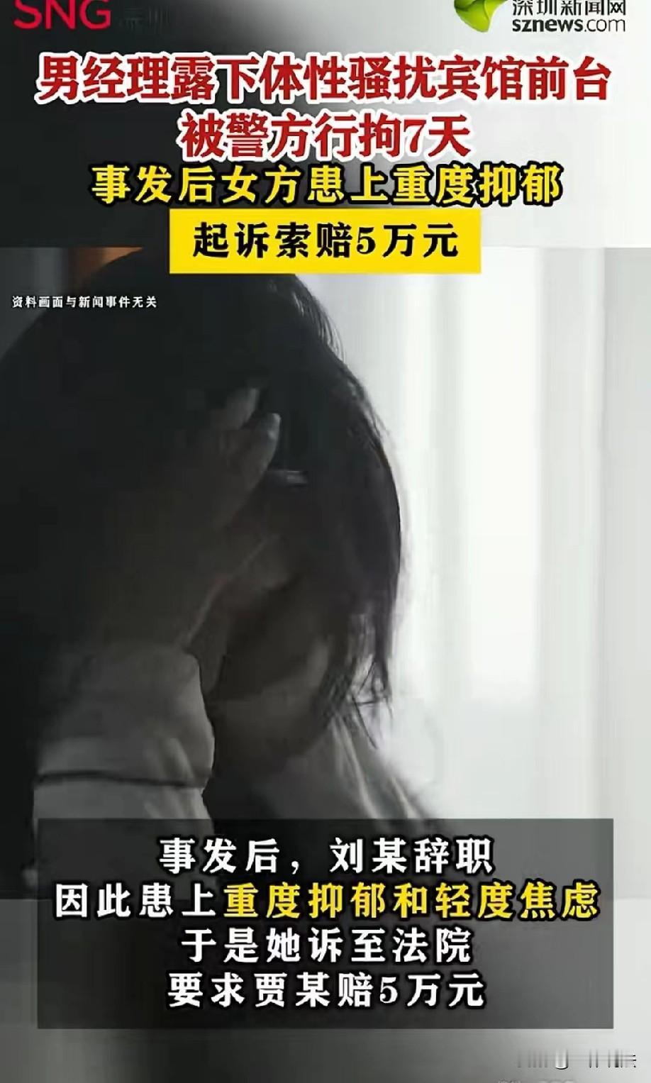 内蒙古锡林浩特,女子入职一家宾馆,成为前台工作人员,上司男经理看到女子年轻漂亮,居然色心大发,故意在女子工作的吧台裸露下体玩弄,还让女子抚摸他的下体。女子报警后,男经理仅仅被公安机关行政拘留7天,但女子却因此患上重度抑郁。她气不过,把男经理告上法庭,索要5万元的各项损失赔偿,法院判了! 刚刚步入社会的刘女士,没有什么工作经验,只能在一家宾馆找了份前台的工作。 入职后,她只想着踏实干好本职,积累点工作经验,万万没想到,这份看似简单的工作,却成了她挥之不去的噩梦。 刘女士年轻漂亮,性格也温和,入职后认真负责,可这却让她的上司贾某动了歪心思。 贾某作为宾馆经理,本该以身作则,却见刘女士孤身在外、涉世未深,逐渐滋生了不轨之心。 贾某每次看向刘女士的眼神,总带着一种让人不适的打量,只是一开始他没敢有过分举动。 2025年8月29日早上8点多,宾馆里还没迎来太多客人,刘女士正在吧台前整理单据,贾某突然走进了工作区域。 她以为经理是来安排工作,刚想主动问好,却被贾某接下来的行为吓得浑身僵硬。 只见贾某突然当着她的面裸露下体,还肆无忌惮地玩弄,甚至丧心病狂地要求刘女士伸手抚摸。 那一瞬间,刘女士吓傻了,恐惧和羞耻感瞬间淹没了她。她强忍着恶心和颤抖,拼命摇头拒绝,等反应过来后,立刻挣脱着躲开,抓起手机就报了警。 警察很快赶到现场,调取了监控取证,贾某的恶行被当场证实。 依据《治安管理处罚法》第四十四条规定:猥亵他人的,或者在公共场所故意裸露身体,情节恶劣的,处五日以上十日以下拘留。 公安机关认定,贾某在宾馆吧台裸露下体并要求刘女士抚摸,属于典型的猥亵行为,违背他人意愿且发生在工作场所这一公共场所,情节恶劣。 没过多久,公安机关就依法作出了行政处罚,将贾某送往行政拘留所执行7天拘留。 可这不痛不痒的7天拘留,根本无法抚平刘女士受到的创伤。 那件事之后,刘女士再也不敢回到那个充满阴影的工作岗位,不得不选择辞职。 但噩梦并没有就此结束,那段屈辱的经历像魔咒一样缠着她,让她夜不能寐、食不下咽,白天精神恍惚,晚上总被噩梦惊醒,甚至开始自我怀疑、极度自卑。 家人察觉到她的异常后,赶紧带她去医院检查,诊断结果让所有人都心疼不已,刘女士患上了重度抑郁和轻度焦虑。 好好的一个姑娘,因为经理贾某的恶行,彻底陷入了心理困境,不仅没法正常工作生活,还得长期接受心理治疗。 刘女士越想越气,贾某只被拘留7天就没事了,可她却要承受一辈子的心理创伤。 为了维护自己的权益,她在家人的支持下,终于拿起法律武器,将贾某告上法庭,要求他赔偿医疗费、心理治疗费、误工费等各项损失合计5万元。 法院查明,贾某利用职务便利,在工作场所对刘女士实施猥亵,不仅违反了社会公序良俗,更严重侵犯了刘女士的人格尊严和身心健康。 尤其是刘女士刚步入社会,心智还不够成熟,贾某的恶行对她的心理造成了不可逆转的伤害,这种损害远比身体伤害更深远。 依据《民法典》第一千零一十条规定:违背他人意愿,以言语、文字、图像、肢体行为等方式对他人实施性骚扰的,受害人有权依法请求行为人承担民事责任。 贾某在工作场所对刘女士实施裸露下体并要求抚摸的肢体性骚扰,违背其意愿,构成对人格尊严与身心健康的侵害。 刘女士的索赔权,不受行政或刑事处罚影响,行政拘留给付不免除民事赔偿义务,因此刘女士有权主张赔偿。 《民法典》第一千一百八十三条规定:侵害自然人人身权益造成严重精神损害的,被侵权人有权请求精神损害赔偿。 贾某的性骚扰导致刘女士重度抑郁、轻度焦虑,属于“严重精神损害”。 司法实践中,法院通常会综合过错程度、行为情节、损害后果及当地生活水平,判决相应的赔偿。 最终,法院综合考虑贾某的行为及造成的伤害,依法判决贾某赔偿刘女士各项损失共计1万元。
