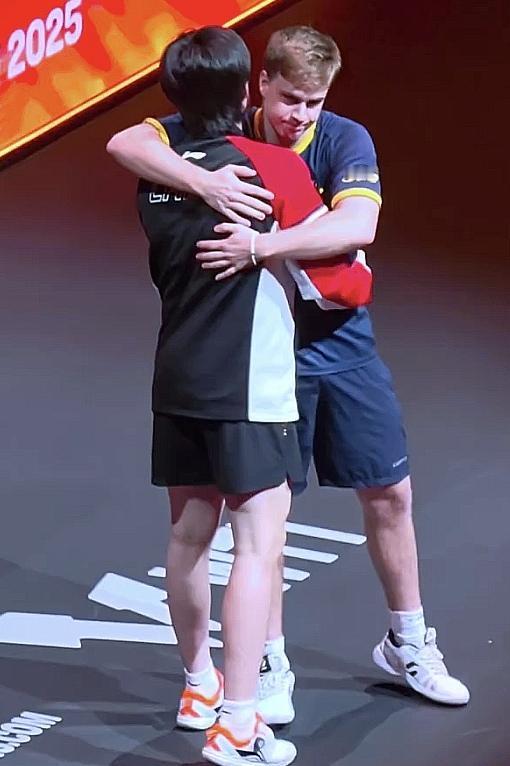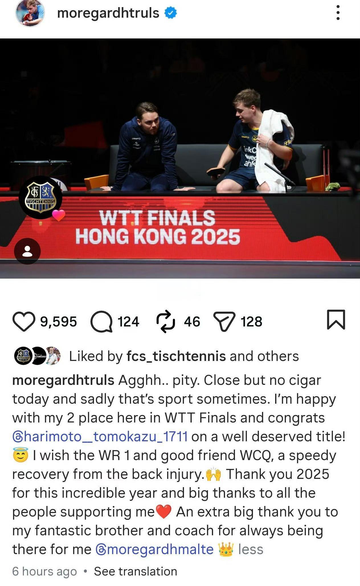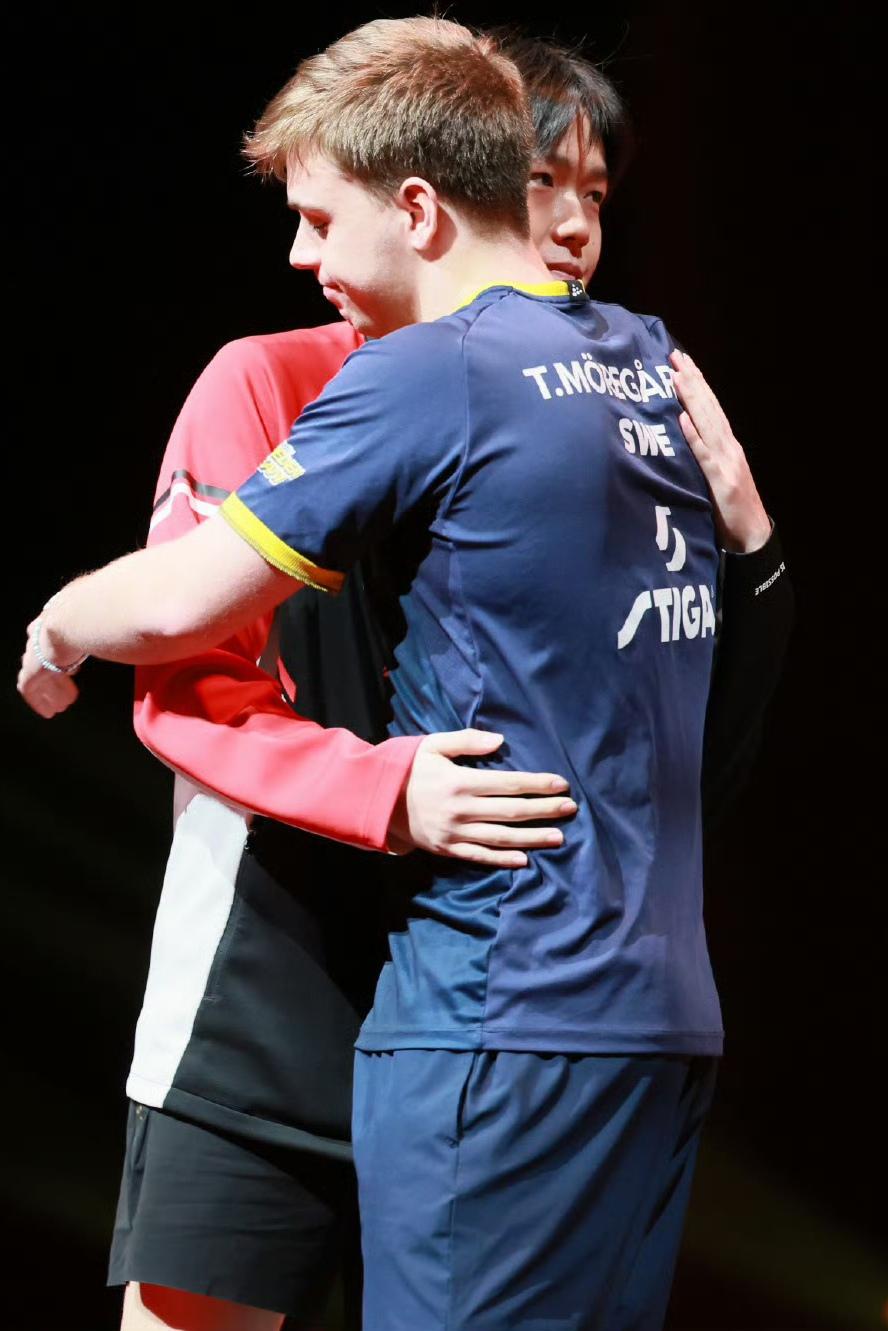 【王楚钦】来自对手的祝福!12月14日,WTT香港总决赛男单半决赛上王楚钦因伤退赛。赛后对手莫雷加德发文: “祝好朋友王楚钦背伤早日康复!” 王楚钦 王楚钦因伤退赛 王楚钦VS莫雷加德 莫雷加德拥抱王楚钦