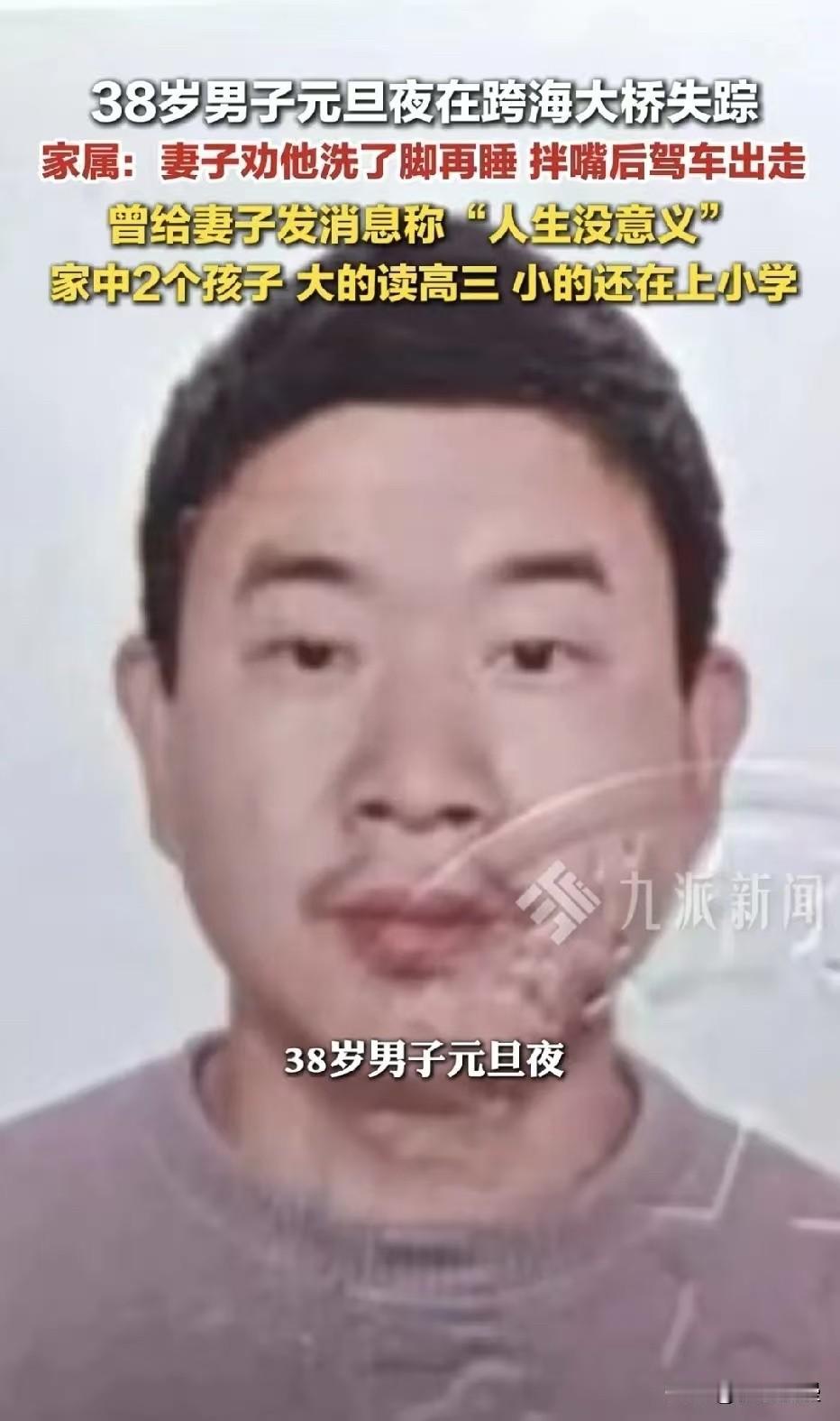 这事儿发生在元旦当晚,本来该是个团圆高兴的日子,结果福建石狮那个38岁的男人,却因为一句“先洗个脚再睡”,跟老婆拌了两句嘴,直接摔门而出,把车扔在跨海大桥上,人没了踪影。 在外人看来,这就是个鸡毛蒜皮的小事,甚至有人会觉得这男的太矫情,太脆弱,一句重话都听不得。但咱们要是真往深了想,这哪是冲着洗脚去的?这分明是积压了太久的委屈、疲惫和无力感,在那一瞬间彻底崩了盘。 这男的从河南出来,在石狮干了整整20年,那是实打实的苦日子熬过来的。他是家里的顶梁柱,老婆孩子都在老家,他一个人在这边挣钱,图啥?图的就是以后能全款买个房,让老婆孩子过上好日子。这种“留守模式”,看着是有存款了,有希望了,可心里的空洞谁来填? 他白天累得跟狗一样,晚上就想倒头就睡,结果回家连个理解都得不到,还得被挑剔这被挑剔那。那一刻他感受到的,可能不是关心,而是一种被控制、被指责的窒息感。 咱们现在的社会,对中年男人的要求太苛刻了。要求他赚钱养家,要求他情绪稳定,要求他像个机器一样永远不坏。他不能喊累,不能诉苦,一旦表现出一点脆弱,就会被说“没出息”、“矫情”。所以他们习惯了把事儿都憋在心里,自己消化。 可人毕竟不是机器,心里的垃圾堆多了,总得找个地方倒,要是找不到出口,那就只能把自己给淹了。 夫妻之间,别总拿对方的付出当理所当然,别总拿琐事去消耗仅剩的感情。一句无心的话,可能就是压垮对方的最后一根稻草。 咱们都以为来日方长,但有时候,一次摔门而出,可能就是永别。 那个在桥上亮着双闪的车,就像一个无声的控诉。控诉着成年人世界的不容易,控诉着那些被忽略的情绪和被压抑的崩溃。 希望这事儿能让人警醒一点,多给身边人一点理解和包容,少一点指责和挑剔。毕竟,活着,才是最大的意义。 各位读者你们怎么看?欢迎在评论区讨论。