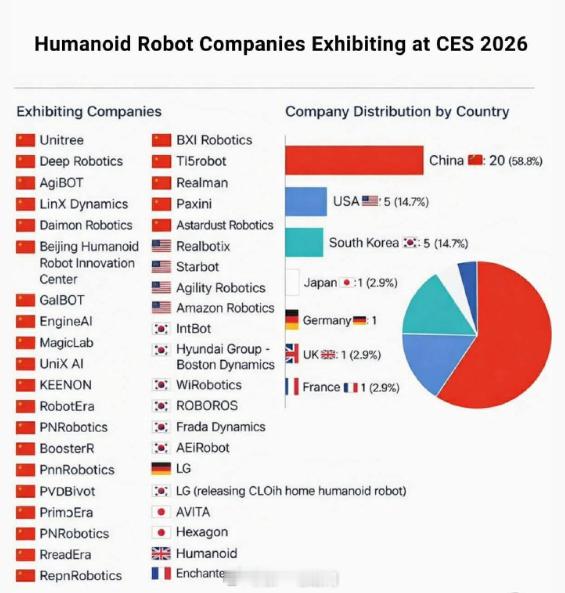 看到一个这次CES2026 参展的机器人公司,吓了一跳,中国有20个公司,占比58.8%,果然一旦确认了产业方向,就要有碾压式的优势,就和现在的智能汽车一样 人工智能AI机器人