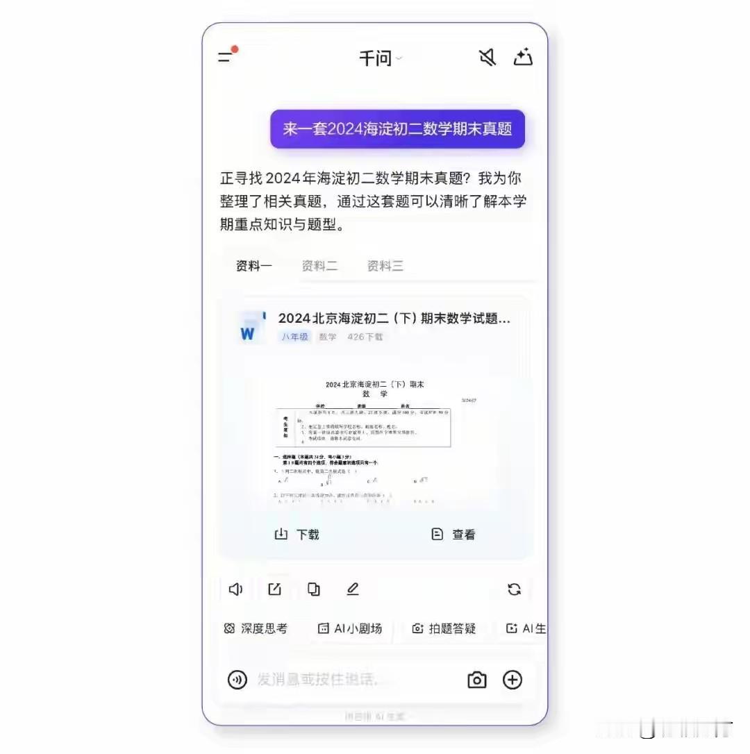 千问 app上线找卷子功能,这让部分乐于“帮助”孩子努力学习的家长如获至宝,当然也遭到了学生党的强烈吐槽,我们该不该把代表未来的高科技技术拿来强化内卷? 或许家长可以反向思考一下,AI都这么强大了,还有什么必要让孩子勤学苦练?吃多少苦能强过计算机的算力?当然,家长也可以用一个笑话来反驳:在野外遭遇狗熊攻击,你不需要快过狗熊,只需要快过自己的同伴。[笑哭]千问ai