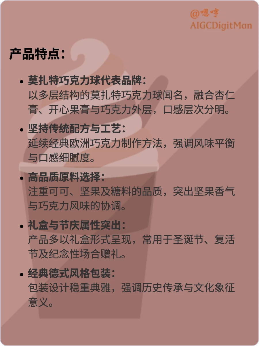 莫扎特巧克力球代表品牌: 以多层结构的莫扎特巧克力球闻名,融合杏仁膏、开心果膏与巧克力外层,口感层次分明。