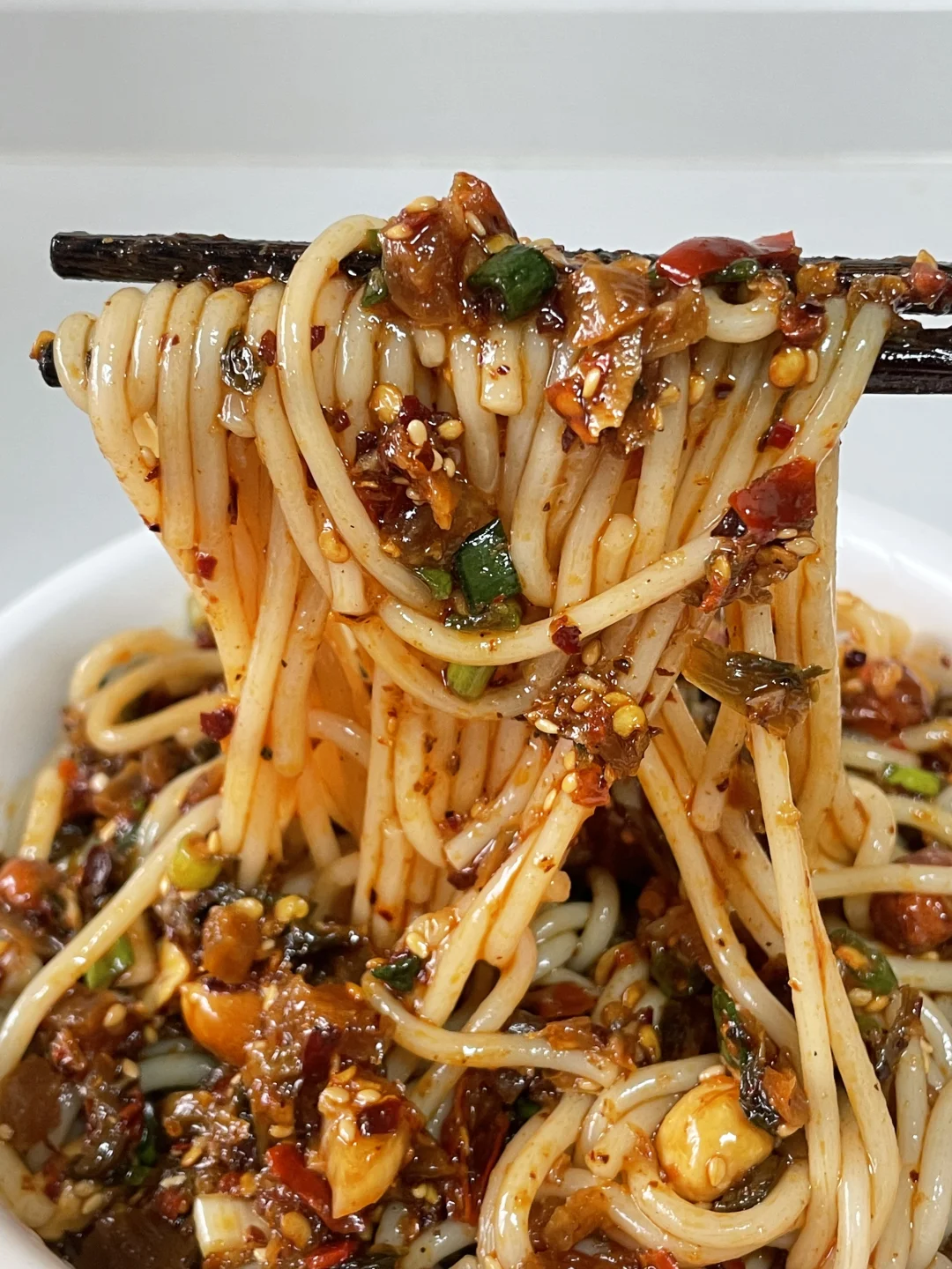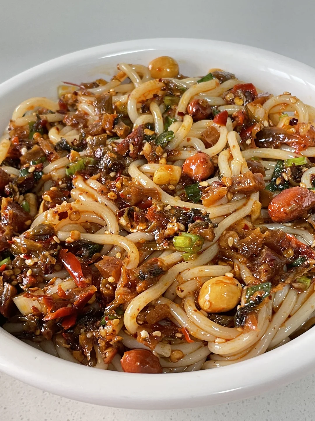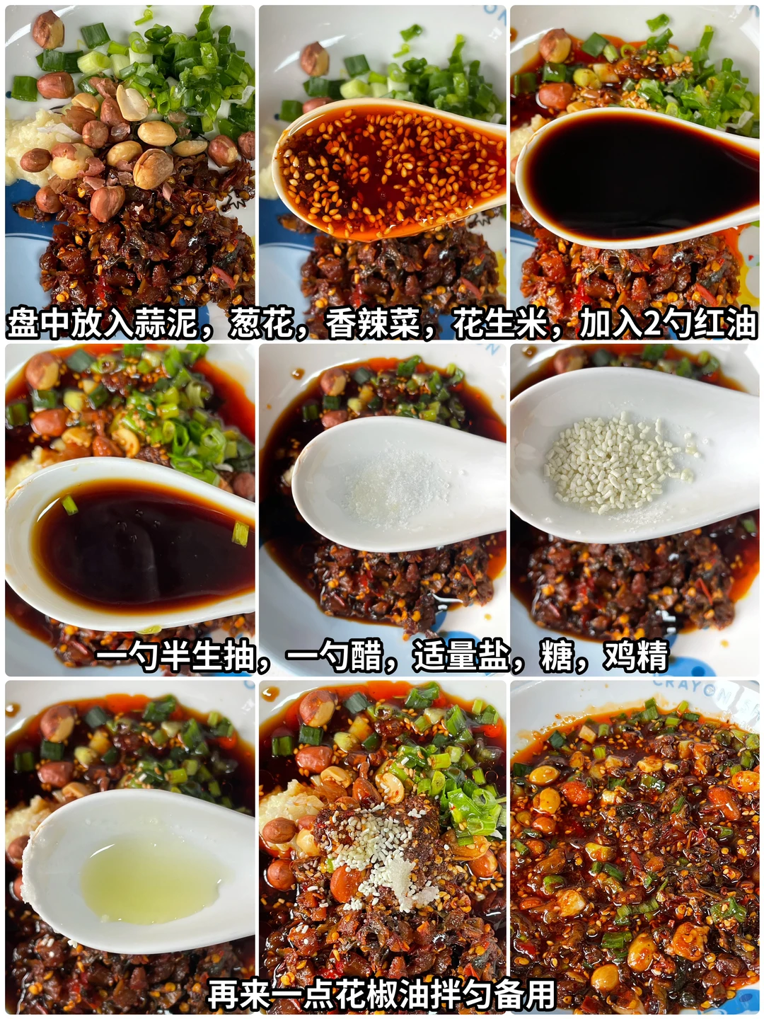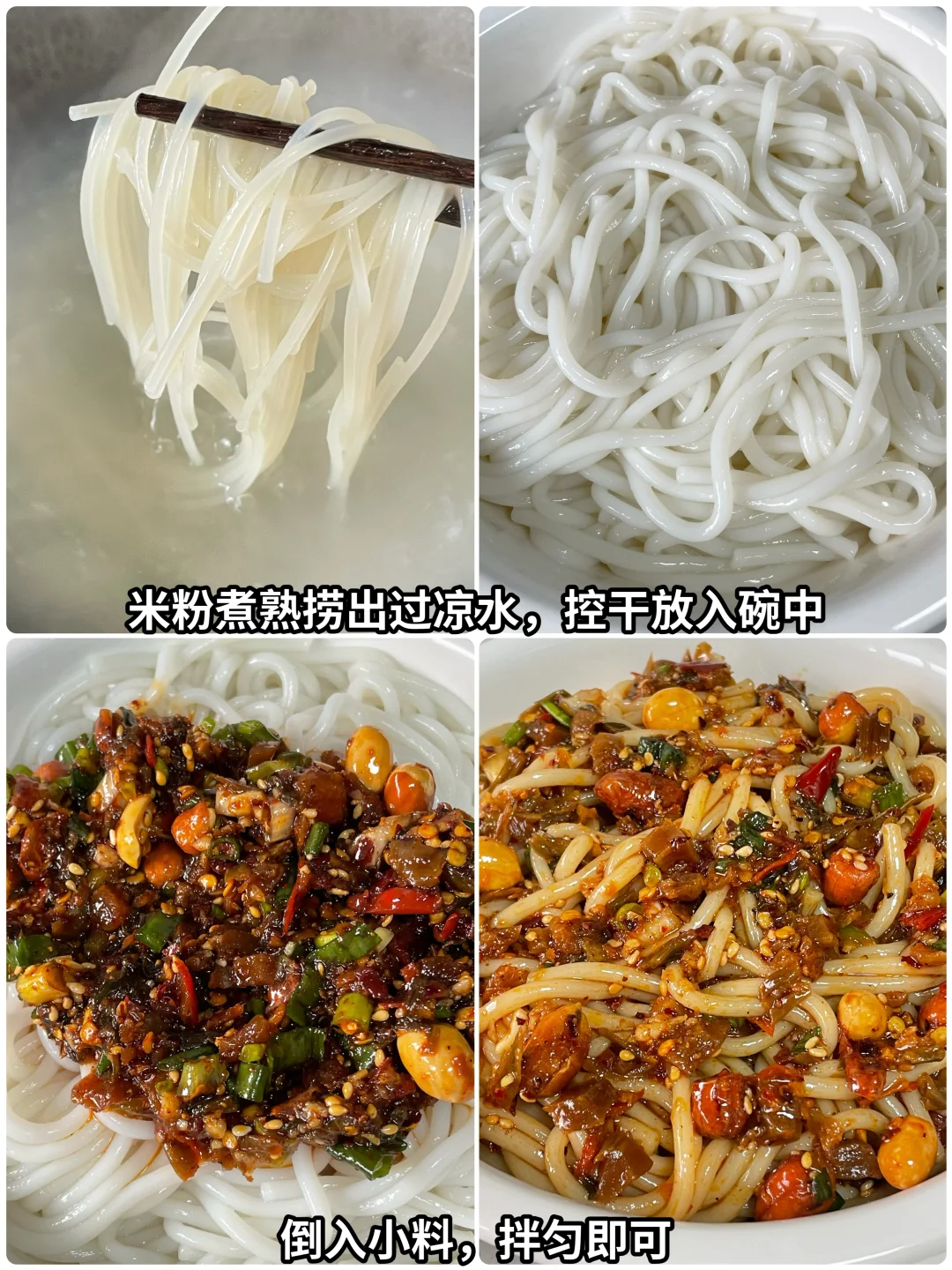 求你去做,真的好吃到破防❗️两人吃了一盆 姐妹们,今天给大家出个拌粉,喜欢嗦粉的姐妹们一定要试试,真的巨好吃。 🌶️食材:米粉 👩🍳做法: 1⃣️我们先来调一个拌粉料,盘中放入蒜泥、葱花、花生米和香辣菜。然后加入两勺红油,我还是用的远老味钵钵鸡调料当红油,因为只有这个红油才能出来这个味儿,然后放入一勺半生抽,一勺醋,适量的盐、糖,鸡精,再放一点花椒油,拌匀备用。 2⃣️水开放入米粉煮熟,捞出过凉水。然后倒入我们的拌料,拌匀即可开吃,这一口下去,真的不要太满足了。喜欢的姐妹试试吧。