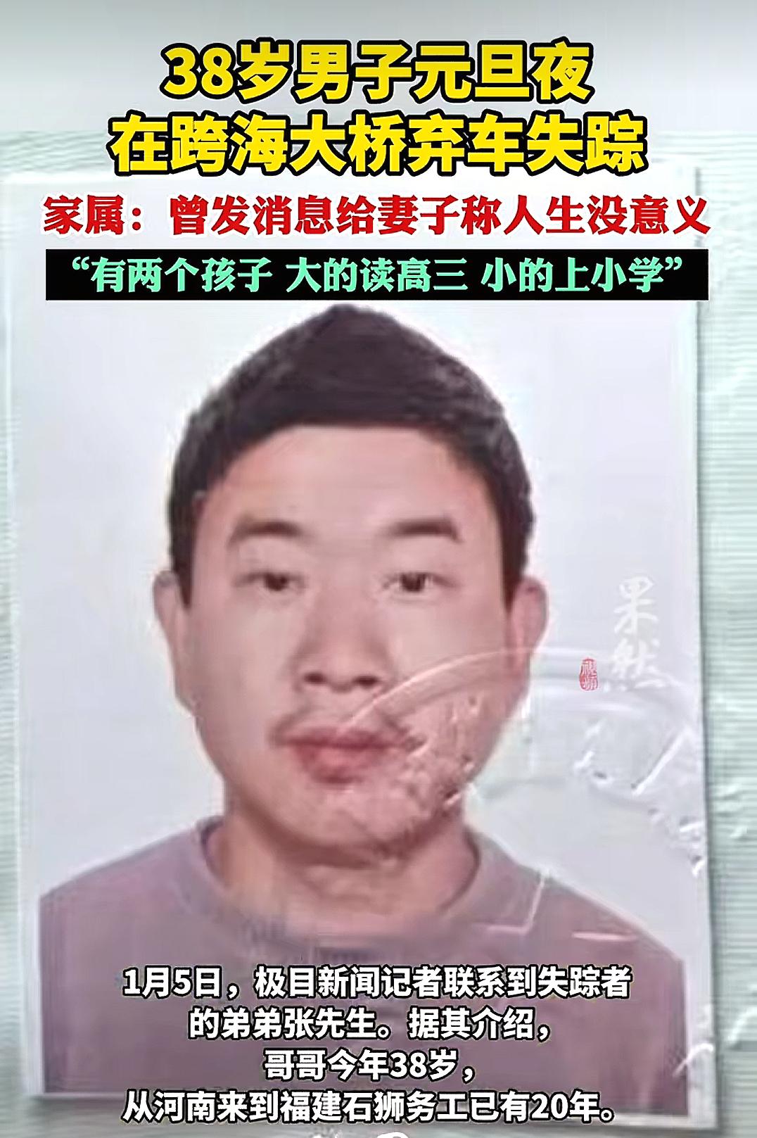 福建石狮,一38岁男子外出回家后,妻子劝他洗一个脚再睡,本来只是很寻常的一句话,可没想到男子竟然和妻子发生了争执,然后转身就摔门离开了家,妻子以为他就是心情不好出去透透气,也就没在意,可谁知,当晚男子给妻子发了一条“人生没意义”的消息后,就没了踪影。 这事就发生在2026年元旦晚上,地点是石狮的一间出租屋里。 这个男人是河南来的,在福建打工都整整二十年了,三十好几的人,人生最好的那些年,全耗在异乡打拼上了。 家里有两个孩子,大的马上要高考,小的还在念小学,都留在河南老家靠父母照顾,他跟老婆就在石狮挣钱,撑起整个家。 那天晚上他从朋友家回来,身上带着酒气,看着就特别累。 老婆也是心疼他,随口说了句洗个脚再睡舒服点,谁能想到,就这么一句再普通不过的关心,居然让他瞬间炸了。 男人当场就控制不住情绪,跟老婆吵了起来,没说几句就气冲冲摔门走了,还开着自己的白色车离开了。 一开始他老婆真没太往心里去,觉得夫妻之间偶尔拌个嘴很正常,他就是心情差,出去散散心、透透气,说不定没多久就回来了。 可眼看着天越来越黑,男人一直没个消息,直到晚上十一点四十,老婆手机收到他发来的消息,就五个字:人生没意义。 看到这几个字,他老婆心里一下子就揪紧了,这才意识到事情不对劲。 赶紧发消息回复,一遍遍地打电话,可电话始终没人接,消息也石沉大海,再也没收到任何回应。 男人的弟弟听说这事,立马从无锡赶到石狮,远在河南的老父亲也连夜赶了过来,一家人到处打听联系,却怎么都找不到他。 他弟弟后来跟人说,其实家里条件不算差,不仅有存款,近两年还打算全款买房,根本没什么经济压力,平时哥哥也没表现出什么异常,从来没提过自己有烦心事。 在外人眼里,这日子过得挺安稳顺遂的,可谁能想到,一句家常话就戳破了他心里的绝望。 到了1月2号上午,联系不上男人都超过十个小时了,家里人实在没办法,赶紧报了警。 当天下午,高速交警就在泉州湾跨海大桥的应急车道上,找到了他开的那辆白色车。 车子打着双闪,车门好好的,车里的东西也摆得整整齐齐,手机就放在车上,唯独不见他的人,跟凭空消失了一样。 家里人赶过去后,第一时间就申请调大桥周边的监控,可无奈监控距离太远,画面模糊得很,根本看不清他往哪去了。 为了找他,家里人顶着刺骨的寒风,在桥下的小岛上一遍遍地搜,每个角落都不肯放过。 救援队也派了无人机,在大桥周边和附近海域仔细排查,就连早上六点就出海赶海的渔民,都主动帮忙留意,可找了好几天,一点线索都没有。 截止到现在,男人已经失踪五天了,警方还在继续调查,可他就像人间蒸发了似的,一点消息都没有。 有网友在网上说,1月2号凌晨三点左右路过那段路时,见过这辆打双闪的白色车,当时还以为是车子坏了,没注意车里有没有人,这成了目前仅有的一点间接线索。 其实从他停车特意开双闪就能看出来,这人骨子里是个替别人着想的人,就算自己心里已经崩溃到极点,也不想因为自己的事影响交通,给别人添麻烦。 都说男儿有泪不轻弹,可没人记得后半句是只是未到伤心处。 成年人的世界哪有容易的,那些藏在心里的委屈、疲惫和迷茫,那些说不出口的压力,往往就在某个不经意的瞬间,被一句不起眼的话压垮。 他在外打工二十年,一个人扛着养家的重担,还得牵挂千里之外的孩子和父母,这里面的辛苦和孤独,可能只有他自己知道,而那句劝洗脚的话,不过是压垮他的最后一根稻草。 大家都希望他只是一时想不开,找了个地方安静待着,希望他能早点想通,记得家里还有等着他的孩子,有为他担心得睡不着觉的老婆和亲人。 最新的情况是,到1月6号晚上,警方还在扩大搜索范围,重点查大桥周边的海域、废弃厂房和隐蔽的角落,同时也在尽力调取更多沿途监控,想找到他的行踪。 他老婆一直守在派出所等消息,不肯离开,家里人也没放弃搜寻,还在网上发了寻人信息,呼吁当晚路过的人如果有线索能提供一下。 网上很多网友也都留言祈福,希望他能平安回家,帮这个快撑不住的家庭渡过难关。 大家对此怎么看?欢迎评论区留下您的观点!