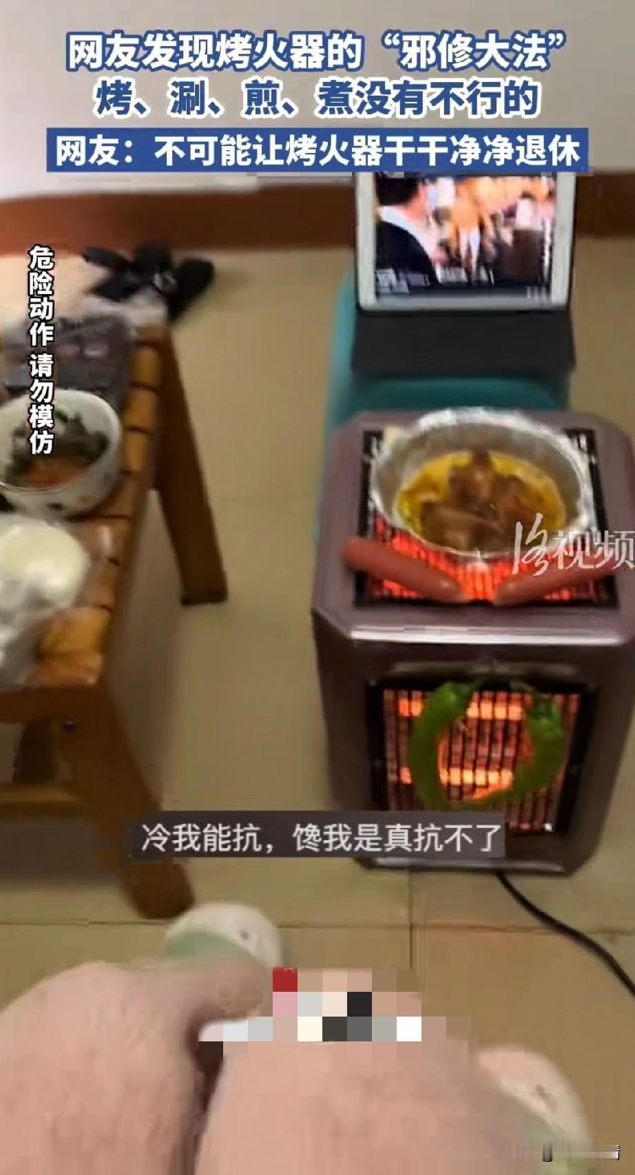 谁能想到烤火器还能这么用, 现在的年轻人可真是太会玩了, 云南的年轻人喜欢吃烤串和火锅, 由于家里没有设备, 于是就对烤火器产生了不一样的想法, 他们直接用锡箔纸放在了烤火机上面, 然后就将丸子,烤肠和蔬菜直接放了进去,烤火器将食材都给烤熟, 效率还非常的高, 不仅可以保暖,还可以做饭, 简直是一个邪修做法, 他们又尝试了用烤火器,吃火锅, 还别说也非常好用, 他们将这个有趣的经历分享给了网友, 也没有想到会这么的火, 网上到处流传着他们的传说, 就连生产烤火器的厂家也没想到, 他们的烤火器不仅可以取暖, 而且炒涮煎煮没有不行的, 以后烤火机的功能可能要更新了, 有网友表示不可能让烤火器干干净净退休的! 大家有没有想到过烤火器有这么大的用处? 烤火神器 南方烤火器 烤火器 家用烤火器 取暖烤火器