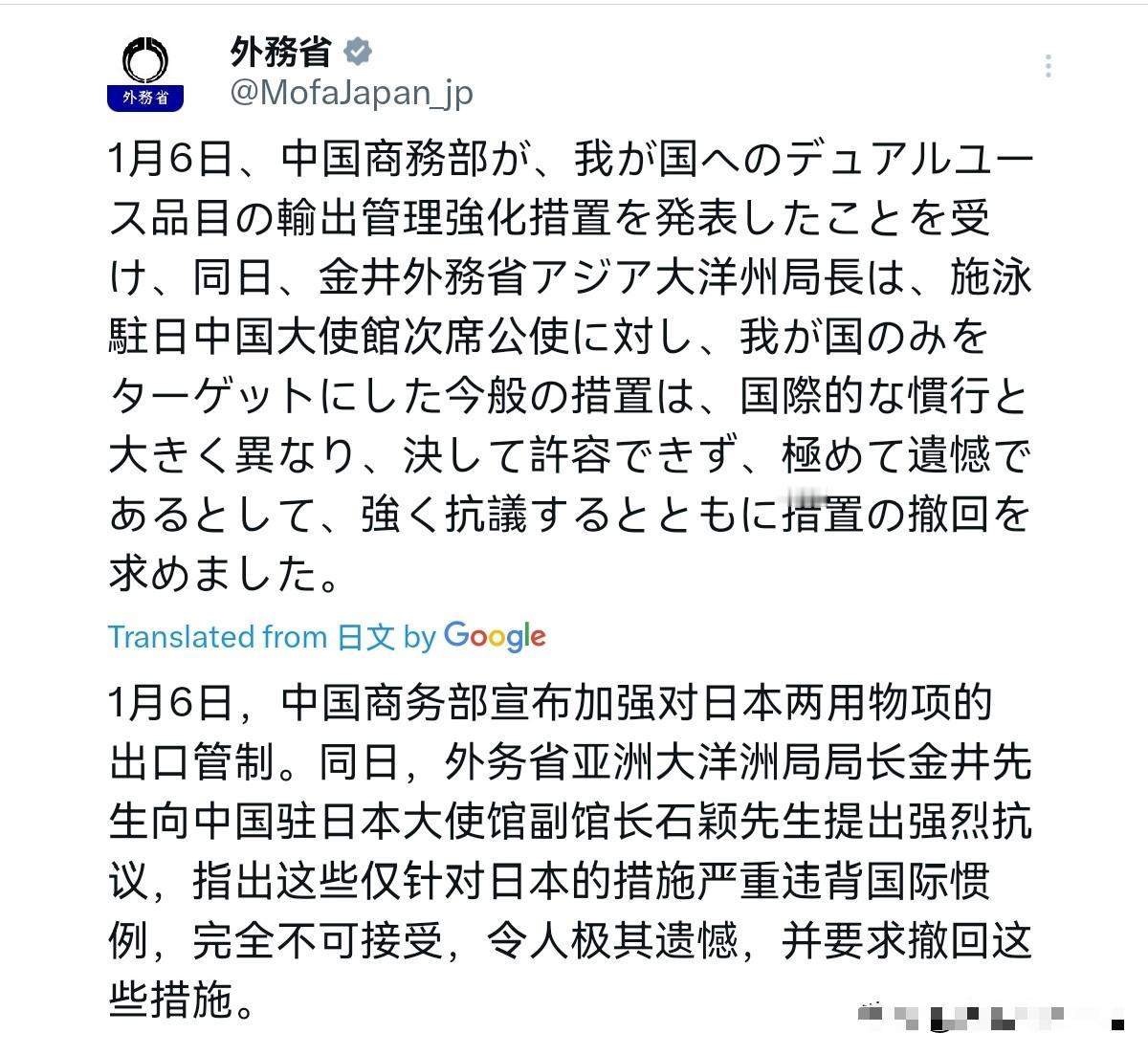 日本出来回应了,态度非常气愤!1月7日,日本外务省声称,1月6日,中国商务部宣布强化对日本两用物品的出口管制措施。同日,日本外务省亚洲大洋洲局局长金井向中国驻日大使馆公使衔参赞提出强烈抗议,称此次专门针对日本的管制措施与国际通行惯例严重不符,完全不可接受,对此深表遗憾,并要求中方撤回该措施。 1月7日,日本外务省的一番表态引发广泛关注,针对中国前一天公布的强化两用物项对日出口管制措施,日本外务省亚洲大洋洲局局长金井直接向中国驻日大使馆公使衔参赞提出强烈抗议,声称这是“专门针对日本”的措施,“与国际通行惯例严重不符”,完全不可接受,还要求中方撤回。 其实只要把事情的来龙去脉说清楚,大家就能明白,日本这番抗议根本站不住脚,中国的做法既合法合理,又符合国际惯例,完全是维护自身国家安全的正当举措。 可能很多人不清楚“两用物项”到底是什么,说白了就是那些既能用在民用领域,又能拿去搞军事、提升军事实力的货物、技术或者服务。 比如大家常听说的稀土,平时能用来做电动汽车的电机、手机的零部件,可到了军事上,就是制造导弹制导系统、雷达的核心原料;还有一些高精度芯片、特种钢材、碳纤维材料,民用上能用于航空航天、电子设备,军用里就能变成战机、军舰的关键部件。 这些东西不是普通商品,一旦被用于军事领域,可能会对他国安全造成威胁,所以世界上很多国家都会对这类物品的出口进行严格管控。 中国这次之所以出台这个管制措施,根本不是无缘无故针对日本,而是有明确的背景和法律依据。根据商务部的公告和新闻发言人的回应,近期日本领导人公然发表涉台错误言论,甚至暗示要武力介入台海问题,这明显是粗暴干涉中国内政,严重违背一个中国原则,性质非常恶劣。 台湾是中国不可分割的一部分,这是国际社会公认的事实,任何干涉中国内政、挑战一个中国原则的行为,中国都绝不会容忍。 为了维护国家安全和利益,同时履行防止这些敏感物品扩散的国际义务,中国才依据《中华人民共和国出口管制法》和《中华人民共和国两用物项出口管制条例》,出台了这项措施。 公告里说得很清楚,禁止的是所有两用物项对日本军事用户、军事用途,还有那些有助于提升日本军事实力的用途出口,并不是禁止所有对日贸易,正常的民用贸易只要经过合规审查、获得许可,还是可以正常开展的。 日本说中国的措施“与国际通行惯例严重不符”,这纯粹是睁着眼睛说瞎话。事实上,对两用物项实行出口管制是全球各国的普遍做法,不管是欧盟、美国,还是其他主要经济体,都有一套严格的出口管制体系。 比如欧盟有专门的《欧盟两用物项条例》,美国也有《出口管理条例》,都是为了维护自身安全和履行国际义务,限制敏感物品的军事用途出口。 中国的做法和这些国家本质上是一样的,都是通过规范出口来防范风险,怎么到了日本这里就成了“不符惯例”?至于日本声称是“专门针对日本”,更是站不住脚。 中国的管制针对的是“军事用途”这个行为,而不是某个特定国家,如果其他国家也做出危害中国安全的行为,中国同样会采取必要的管控措施。 日本之所以觉得“被针对”,本质上是因为他们近期的错误行径触及了中国的核心利益,而他们的军工产业和高端制造业又高度依赖中国的这些两用物项,担心自身利益受损而已。 说起来,日本对中国这些两用物项的依赖程度远比很多人想象的要高。有数据显示,2024年日本进口的稀土里,71.9%都来自中国,整体依赖度大概60%,尤其是制造高端武器必需的重稀土,依赖度更是高达80%。 像镓、锗这些关键材料,日本在加工环节的依赖度更高,而这些材料正是制造军用夜视仪、卫星组件、军工芯片的核心。 除此之外,日本汽车、机器人、半导体产业需要的石墨负极材料、特种钢材等,也大量依赖中国供应。 说到底,中国的出口管制措施,既是对日本干涉中国内政行为的合理反制,也是维护自身国家安全的正当权利,更是履行国际防扩散义务的负责任之举。 任何国家都不能一边干涉他国内政、挑战他国核心利益,一边还要求他国无底线地满足自己的利益诉求,日本显然是搞错了状况。 国际社会都清楚,出口管制是维护全球战略稳定的重要手段,中国的做法符合国际法和国际惯例,没有任何可以指摘的地方。 日本与其在这里强烈抗议,不如好好反思自己的错误言行,停止干涉中国内政,尊重中国的核心利益,只有这样,中日关系才能回到健康稳定的轨道上来。如果日本继续执迷不悟,坚持错误做法,未来可能还会面临更多反制措施,最终损害的还是他们自己的利益。