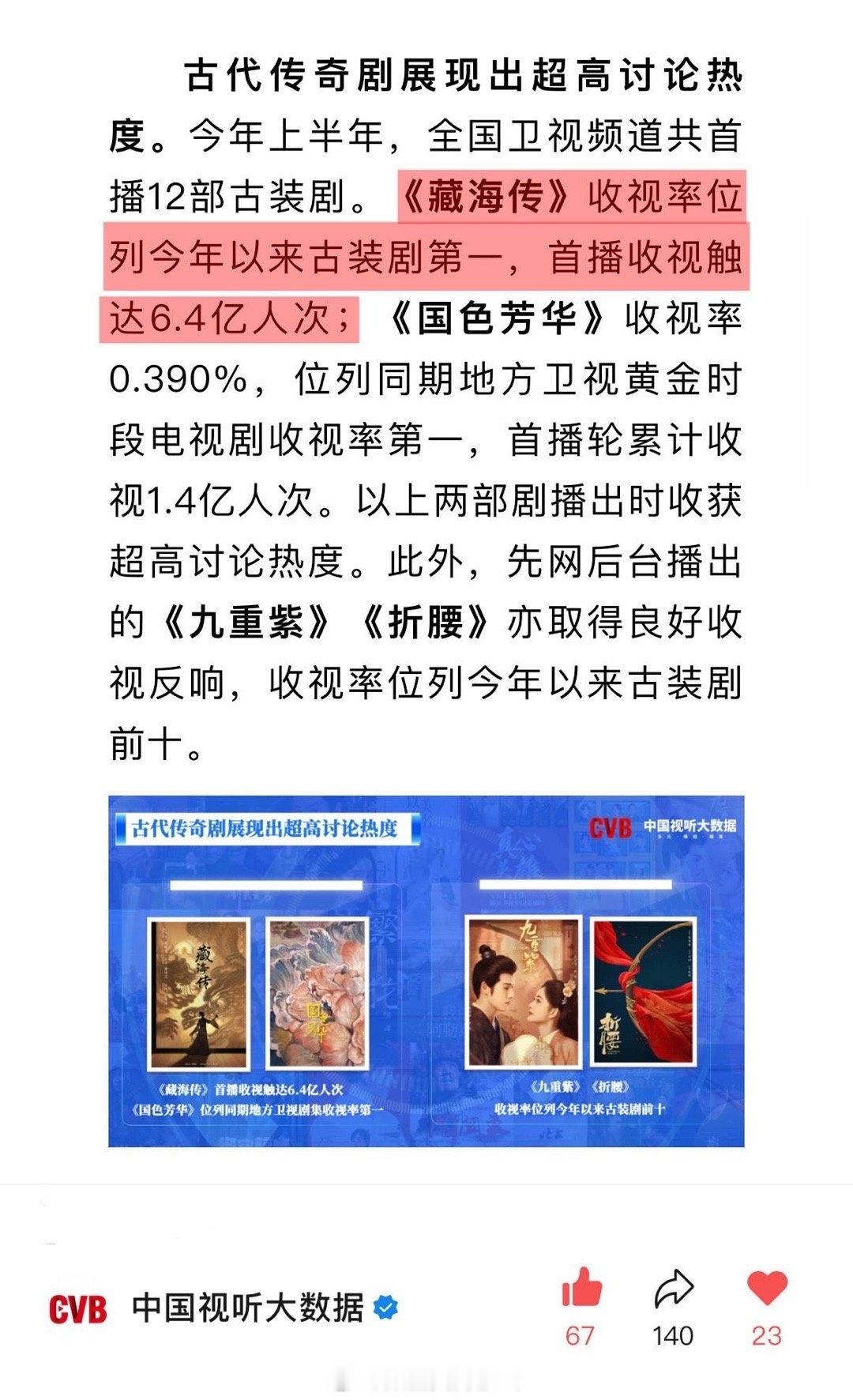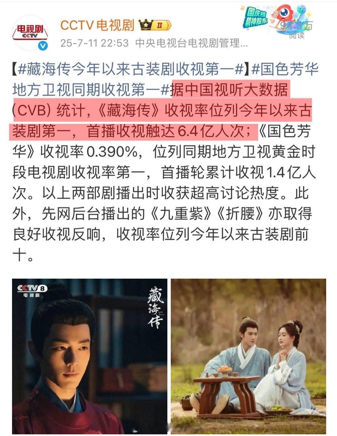 用户10xxx37 3 2026-01-08 13:15 央8发战报也知csm数据≠CVB数据,csm数据含水量高。央8如果用广电不买水的CVB数据,藏海传收视率为1.469%,央8近5年古装剧收视率第一的是张若昀的《庆余年2》。