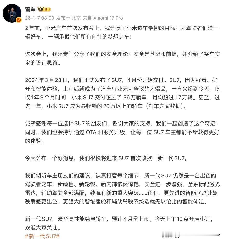 今天,小米CEO雷军突然发文,小米SU7在2024年3月发布以来迎来首次改款,带来新颜色、新轮毂、新内饰,安全进一步增强,将全系标配激光雷达,辅助驾驶全部满配,续航提升最高可达到902km,还有,更先进的智能底盘,更强大的智能座舱和辅助驾驶系统。 新一代SU7预售价22.99万元至30.99万元,预计4月份上市,今日上午10点已经开启小定,大家看完之后有心动的吗?