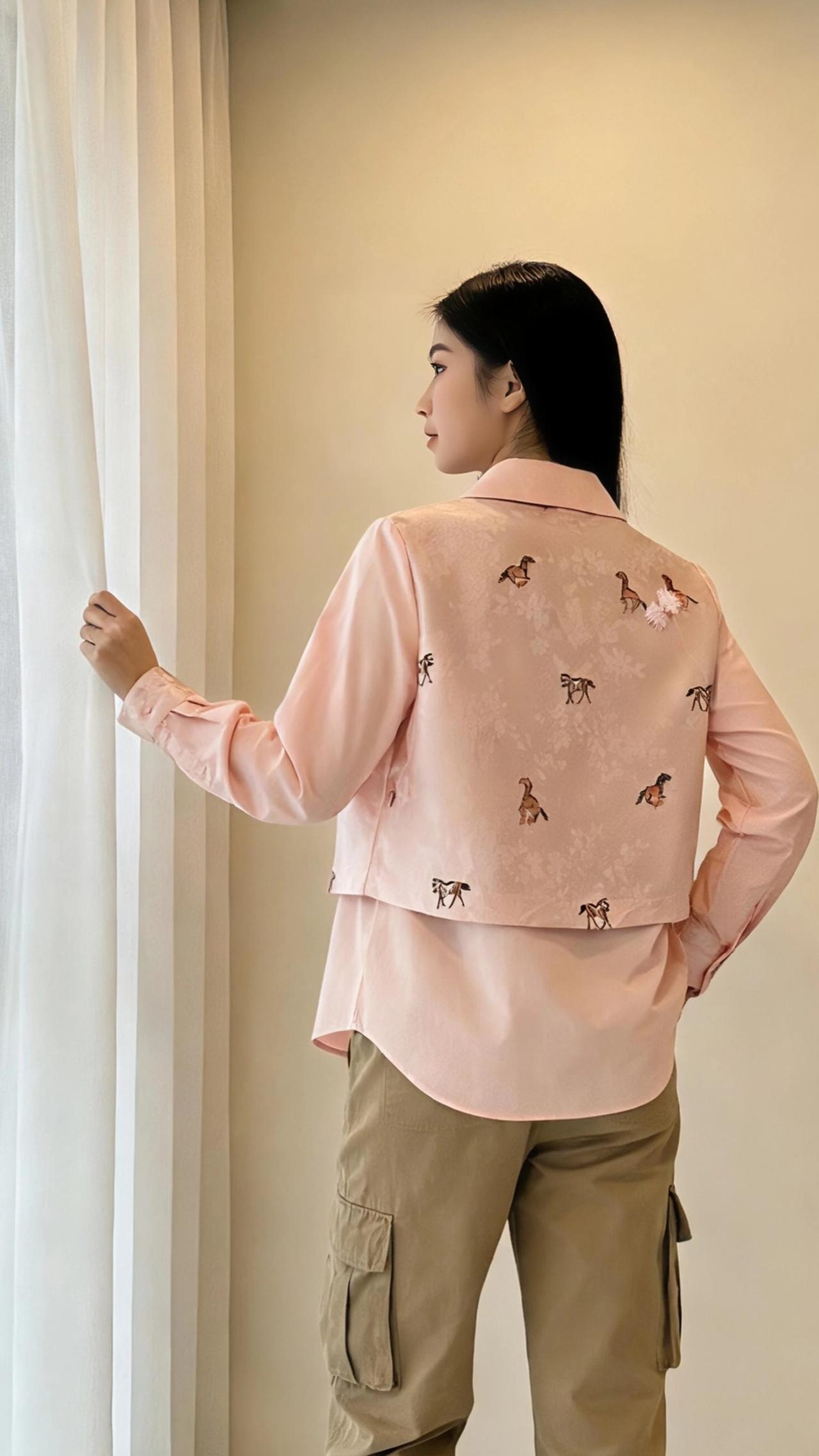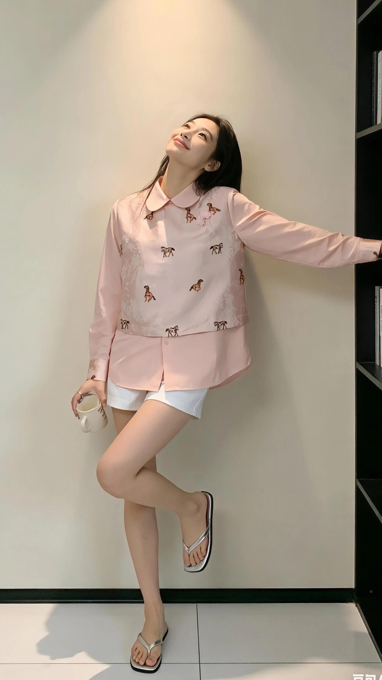 粉衫与春日私语 浅粉的衬衫像揉碎了的春日晚霞,落在肩头时,连空气都染上了温柔的甜。刺绣的小马跃在衣料上,似有细碎的蹄声,敲开了简约客厅里的静谧。 她倚着黑色的书架,指尖轻触书脊,衣摆的层次感随动作漾开,像春水拂过柳枝。转身时,缎面的光泽在光影里流转,与白纱帘的柔光缠在一起,分不清是衫色映了光,还是光揉了衫影。 坐在奶白色的弧形椅上时,浅粉衬得眉眼愈发清甜,灰裤的利落中和了粉色的柔,像春日里刚抽芽的枝桠,既有娇软的姿态,又藏着向上的韧劲。忽而抬手撩开帘角,风掠过衣上的小马刺绣,仿佛那些灵动的轮廓真要踏着风,奔向窗外的春光。 一杯温茶握在掌心,赤足踩着凉拖的随性,让粉衫的温柔多了几分慵懒。俯身取书的瞬间,藏青百褶裙的垂坠感与粉衫的轻盈相映,像暮春的花与夜的云,撞出别样的雅致。 这一件粉衫,不只是衣料的拼接,更是把春日的温柔、灵动与自在,都缝进了日常的方寸里,让每一个平凡的瞬间,都有了轻描淡写的浪漫。 高级感穿搭 小个子穿搭 衬衫穿搭 甜美穿搭