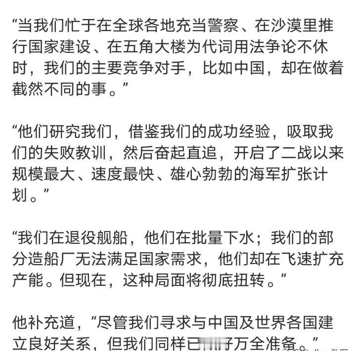 宁可让其狂妄,也不愿其醒悟。自苏联解体解体后,美国成了世界唯一的超级大国,几十年来美国与所欲为,根本没有把国际规则及法理放在眼里,想干什么就干什么,想对谁动武就动武,搅动得世界无片刻安宁。因为美霸权没有遇到挑战,所以狂妄到了无边,正因为如此,美根本不会想到,也没有意识到自己正走向衰落。当美国疯狂乱舞之时,何尝不是世界蓄力之机呢? 不怕魔鬼乱舞,也不怕魔鬼狂妄,就怕魔鬼醒悟。美帝的霸权作风由来已久,虽然世界各国对此深恶痛绝,但基于美国的实力也也只能暂时避其锋芒,然而有句话叫“要让其灭亡必让其疯狂”。 糟糕的是,美国不仅狂妄,还开始醒悟。美国防部长赛格斯近日就表示:“当我们忙于在全球各地充当警察、在沙漠里推行国家建设、在五角大楼为代词用法争论不休时,我们的主要竞争对手,比如中国,却在做着截然不同的事…”等等,美国这是在开始醒悟啊。这绝对不是什么好事,因为美国醒悟,霸权将会延续,世界只会更加不太平。因此,世界宁可美国继续疯狂,也不愿看到美国醒悟。 美国醒悟不是世界的福音,是传给世界的噩耗。请用一句话说,您恨美帝什么呢 美国霸权衰落 美帝怕什么? 美帝的嘴脸 (图片来自网络)