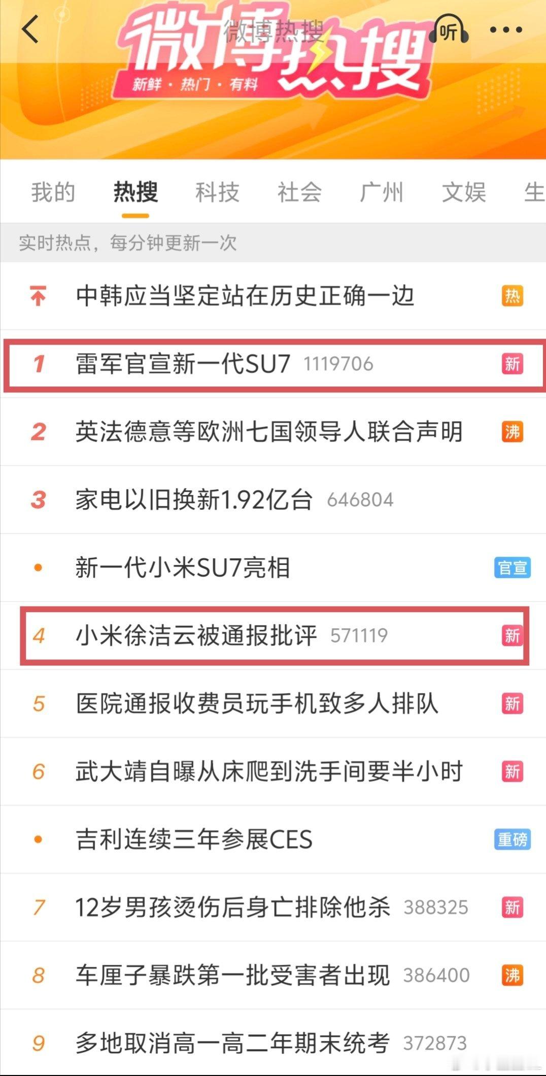 雷军官宣新一代SU7雷总这波官宣热度可以呀!!小米热搜前四占两个。科技榜整个基本