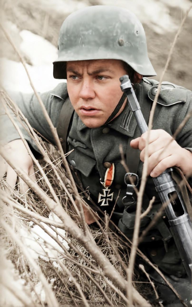 东线战场,一名德军士兵手持MP40冲锋枪,制服上佩戴着二级铁十字勋章,时间大约是1944年1—2月。 德军老照片 历史 二战 德国 军事 军事发烧友