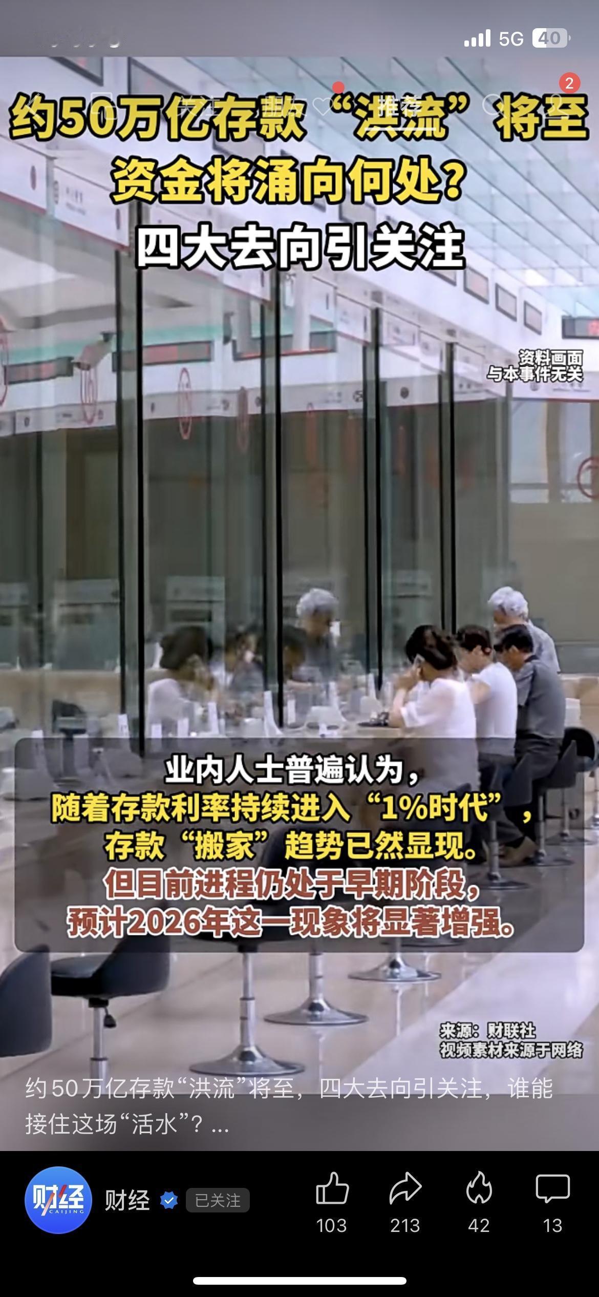 50万亿存款要“搬家”!2026年你的钱该放哪? 民生理财 银行理财窗口排起长队,张大爷吐槽10万定存一年利息1500,不够买年货!” 财联社数据显示,2026年国内一年期以上定存到期规模达50万亿,同比增10万亿,这笔钱主要有四大去向:还房贷、进股市、买理财、继续转存。 银行经理说,上周支行2000多万到期存款,一半客户选提前还房贷,三成买理财。 财经分析师建议:提前还房贷先算违约金,闲钱要分散配置,老人以稳健为主。 你家有到期存款吗?会选哪种处理方式?存款理财