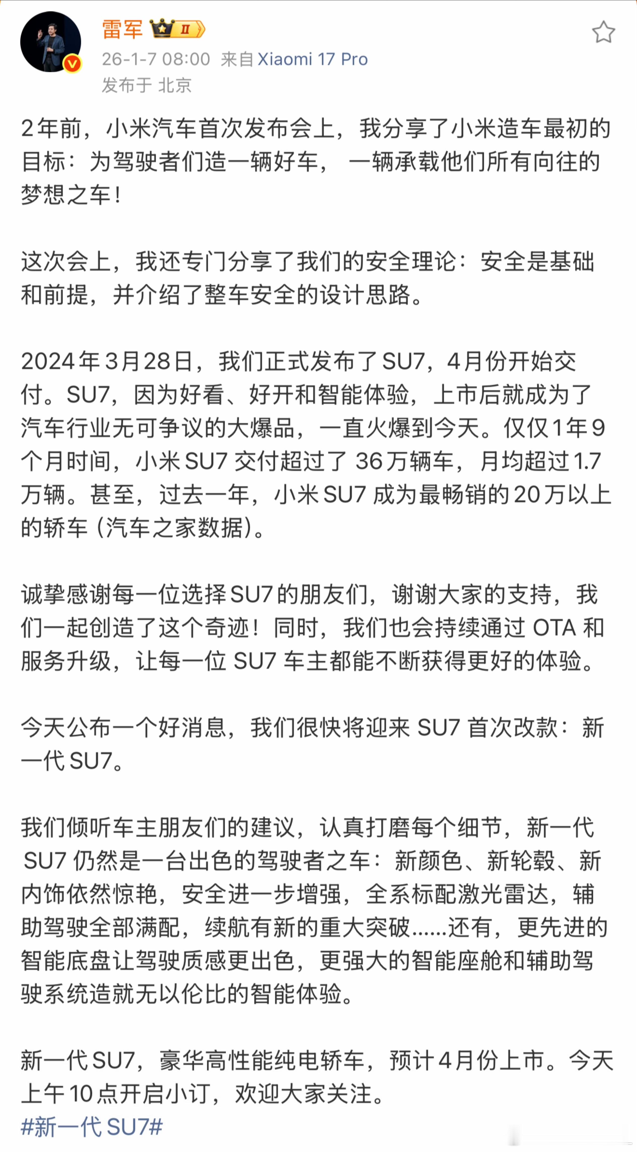 小米这次新一代 SU7 的卡布里蓝确实把自然美学与汽车设计的融合做得很到位,灵感来自意大利卡布里岛蓝洞,那种深邃纯净的蓝色,一眼高级。小米的审美一直在线,从霞光紫到鹦鹉绿,定制款的紫水晶,每一款颜色都火出圈,这次妥妥又要带起一波行业跟风潮!SU7造型确实经典,50万内最好看的轿车没毛病!就像MINI、大G 、911,好的设计不需要大改,那些能沉淀下来的设计,最后都会变成品牌的 “符号”,让人一看到就想起背后的质感和温度。新能源1-2年换代很正常,但别光看外观!新一代SU7的重点在"里子"——芯片、智驾、电气平台,这些才是硬实力。老款驾控HAD增强版已经很有口皆碑,这次必然只会更强。韩路老师早说过这款车预测要涨两万,换个角度想,只要是实打实的全面升级,涨价也完全能接受。从销量就已经说明一切!SU7已经是25年20万以上销量最高轿车,各种拆车实测证明品质可靠。买销冠肯定没错,Model 3的神话早就被SU7终结了,新一代登场,就这些焕新的强度,必然也能专治各种不服!最关键是诚意来了!小米 4 月新车即将登场,为了照顾老车主的心情,从商业角度来看,小米真是承担了不少压力啊。着急用车就选现款,早买早香;不着急的话不妨等等新车,到时候惊喜绝对少不了!新一代小米SU7亮相雷军官宣新一代SU7新一代su7小米汽车小米汽车小米su7