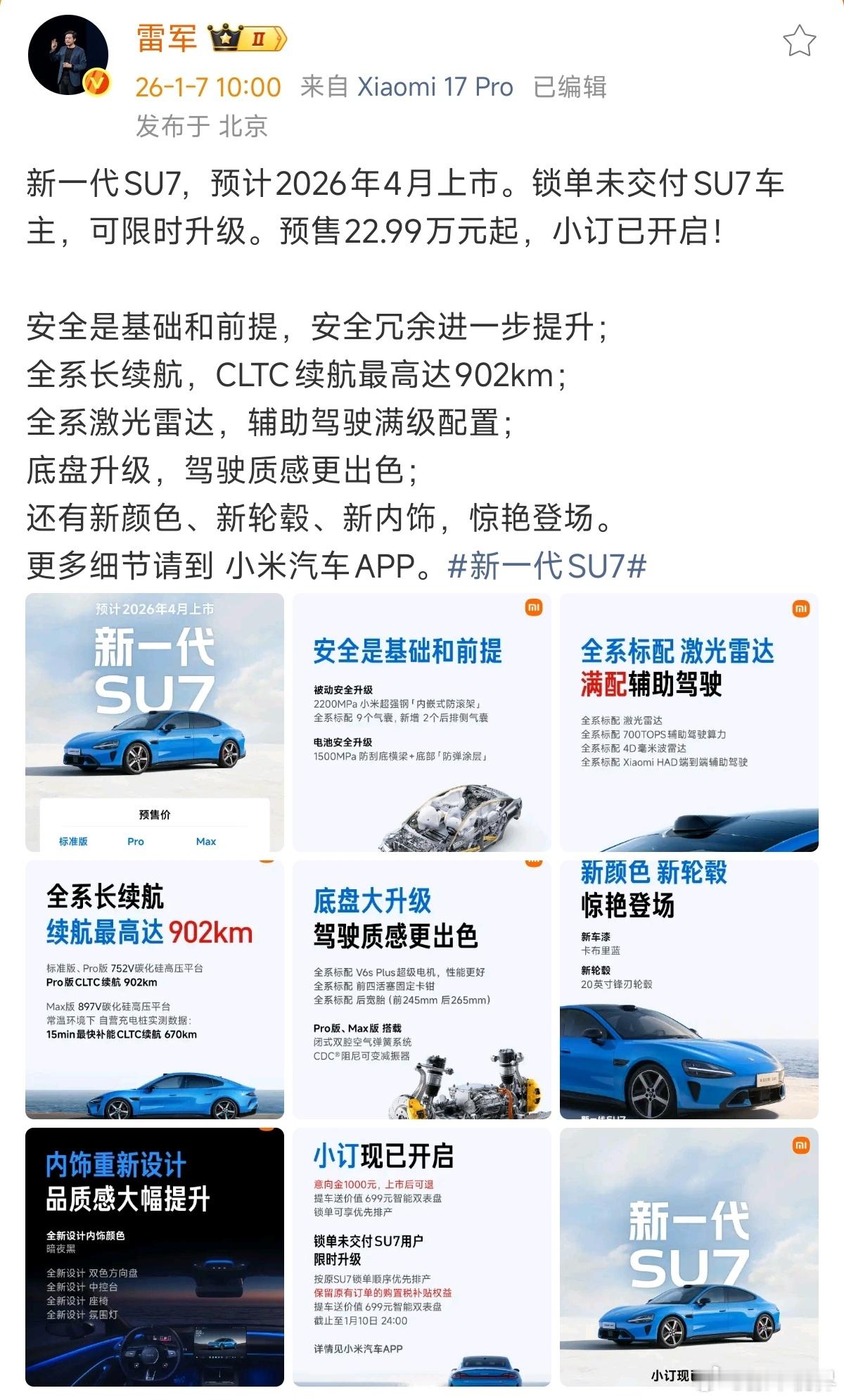 新一代SU7价格 正式售价低1.5万以上,小米是留着空间的。「新一代」SU7的核心变化,752V平台是一个(现款是400V),续航最长超过900km。标配V6S电机,前245mm、后265mm宽胎,除了标准版还有双腔空悬+CDC。新能源汽车撩妹不如撩车