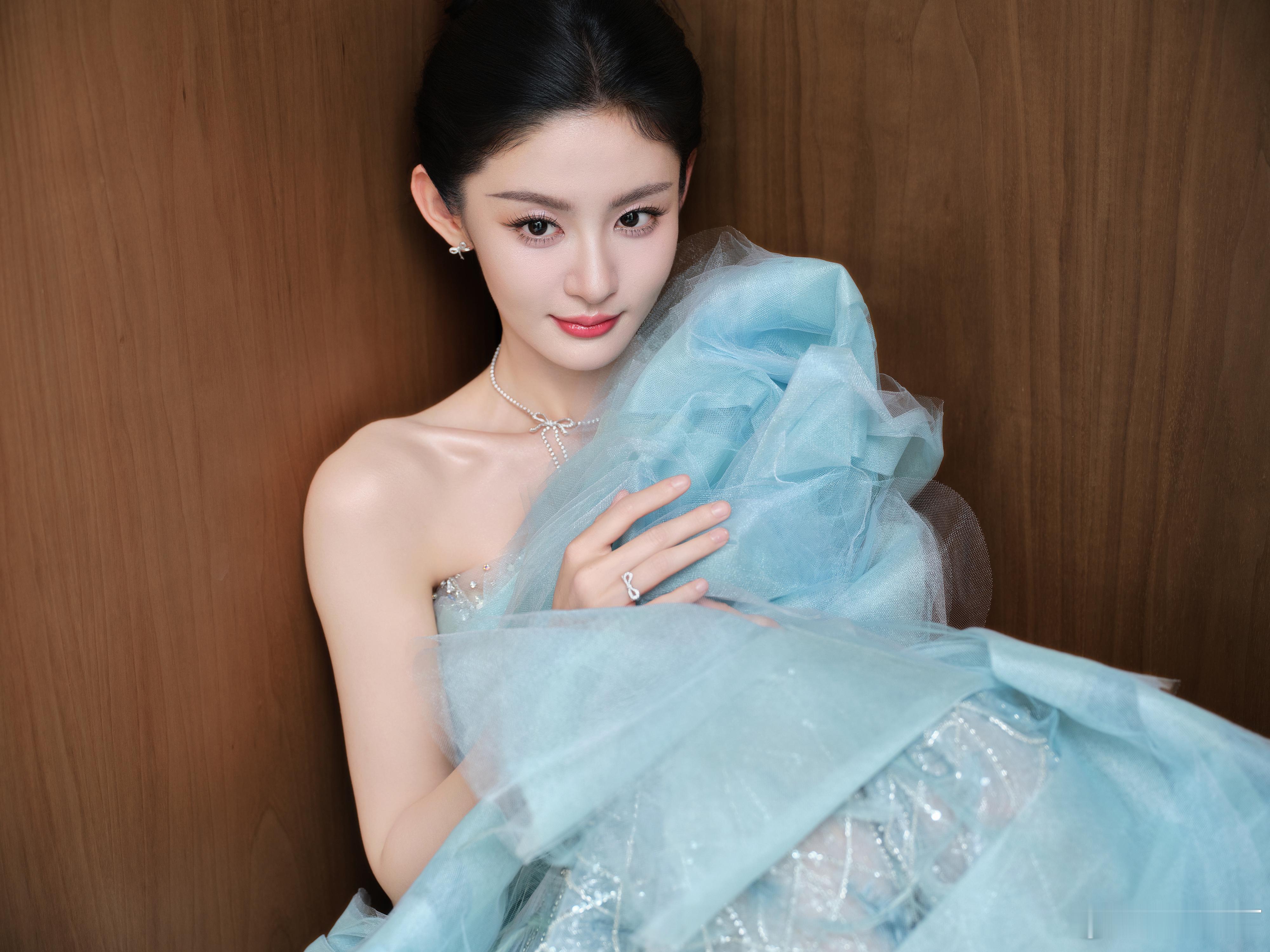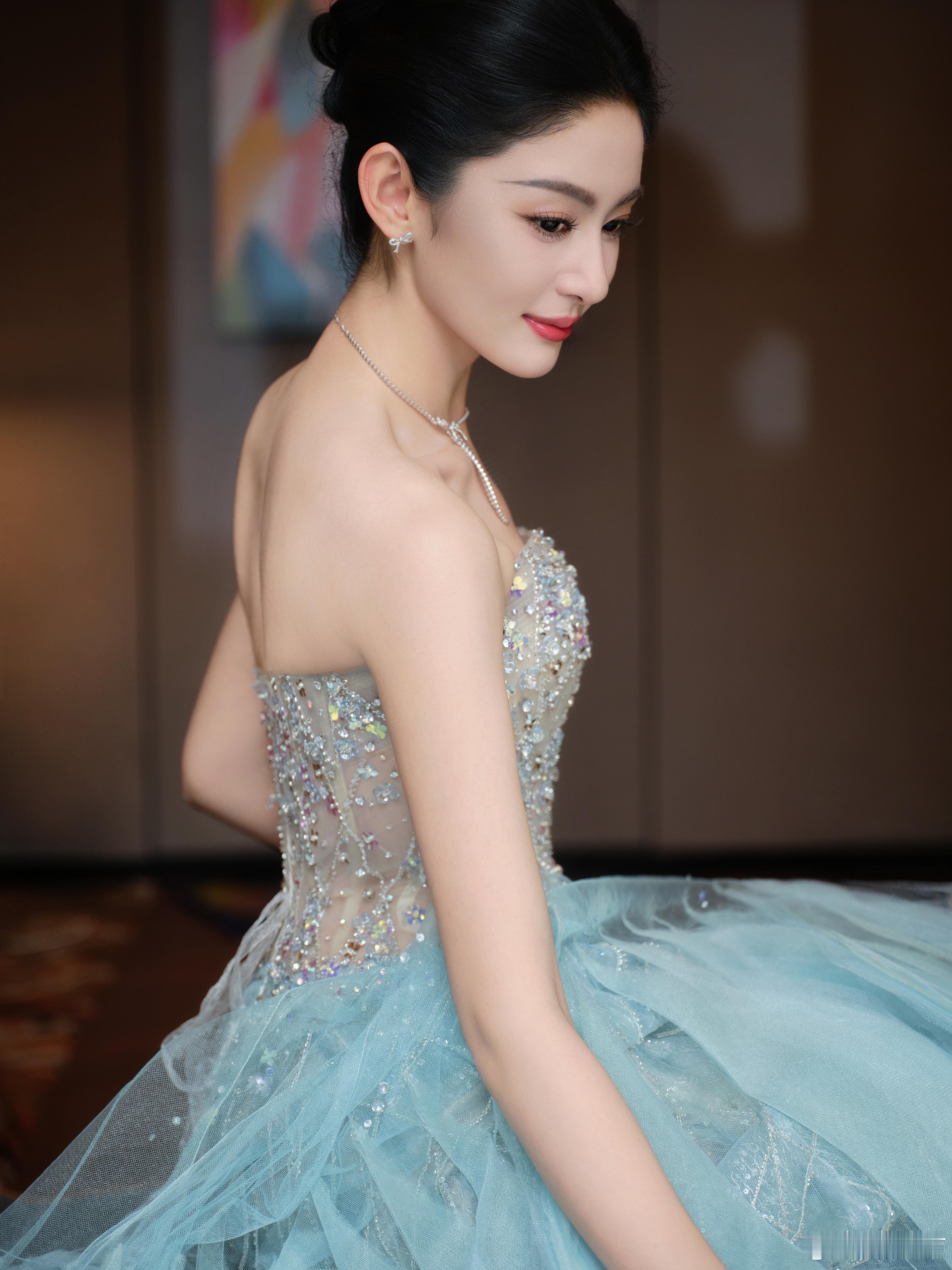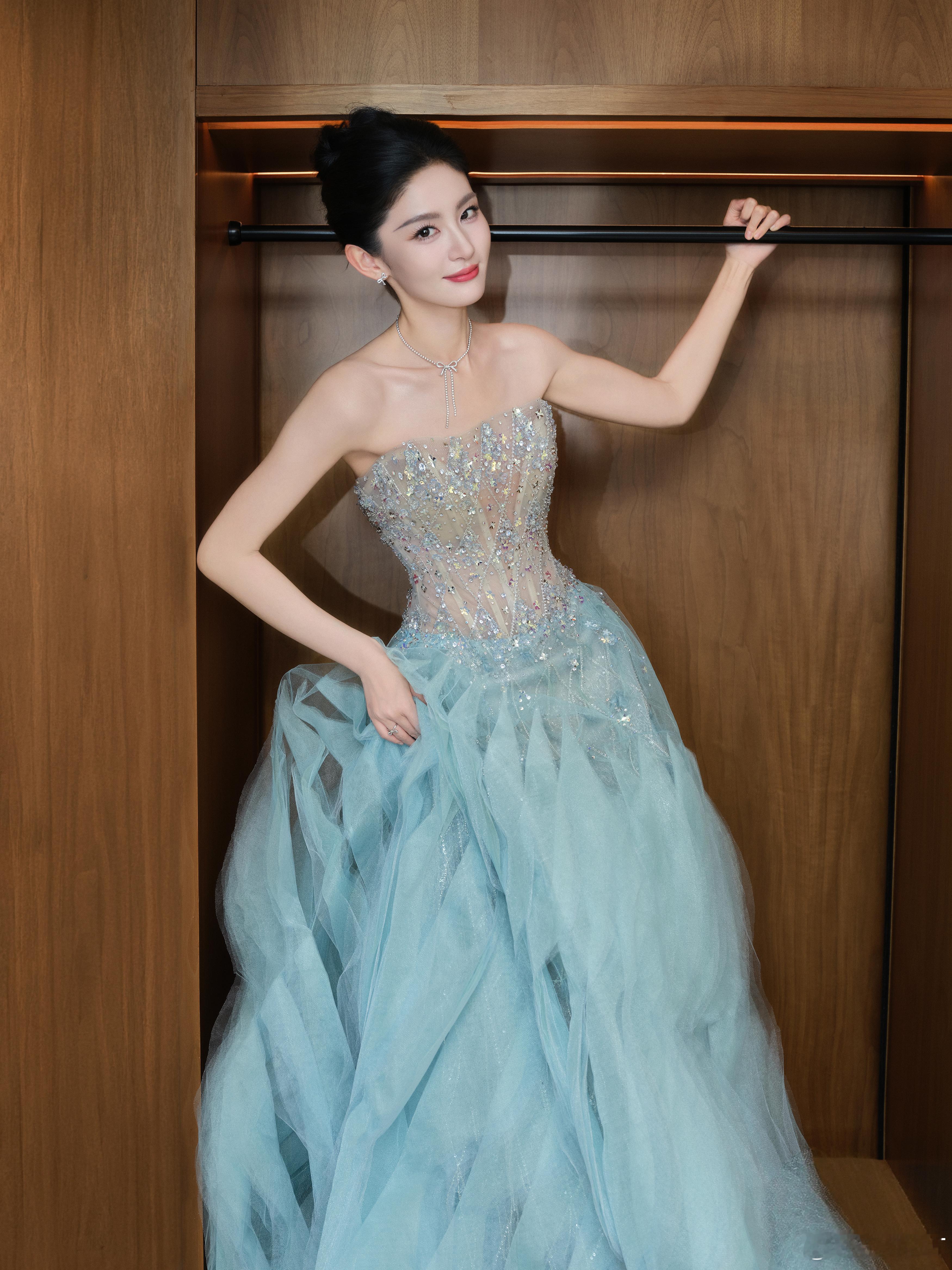 赵晴 裸肩缀钻,玉腿缠纱,红唇轻扬的刹那,湖蓝裙摆都成了勾魂的网。