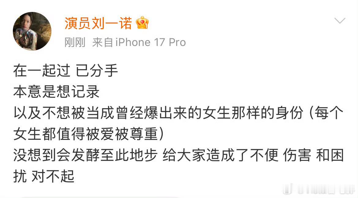 刘一诺在一起过已分手女方回应恋情状态,曾经在一起过但已经分手