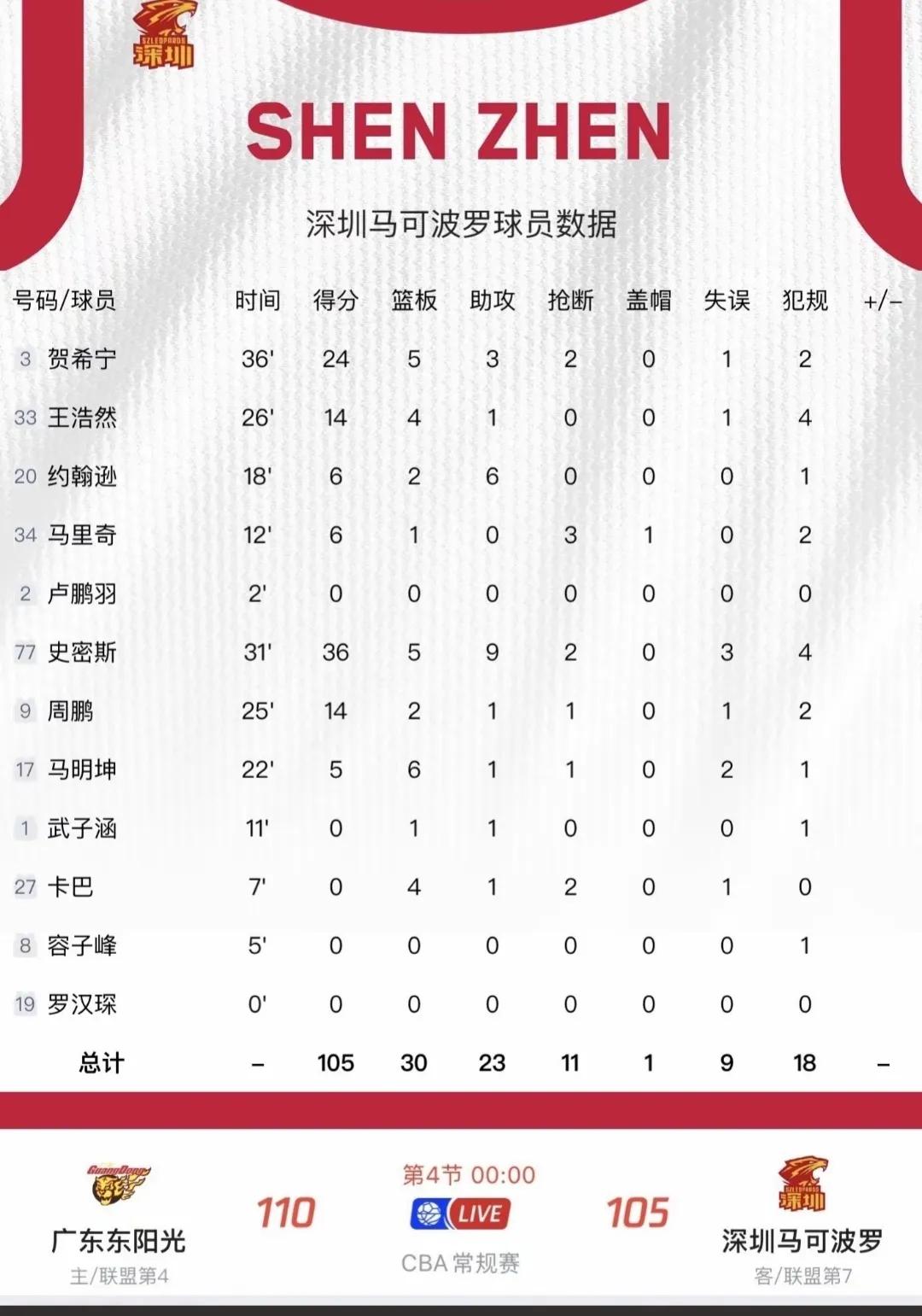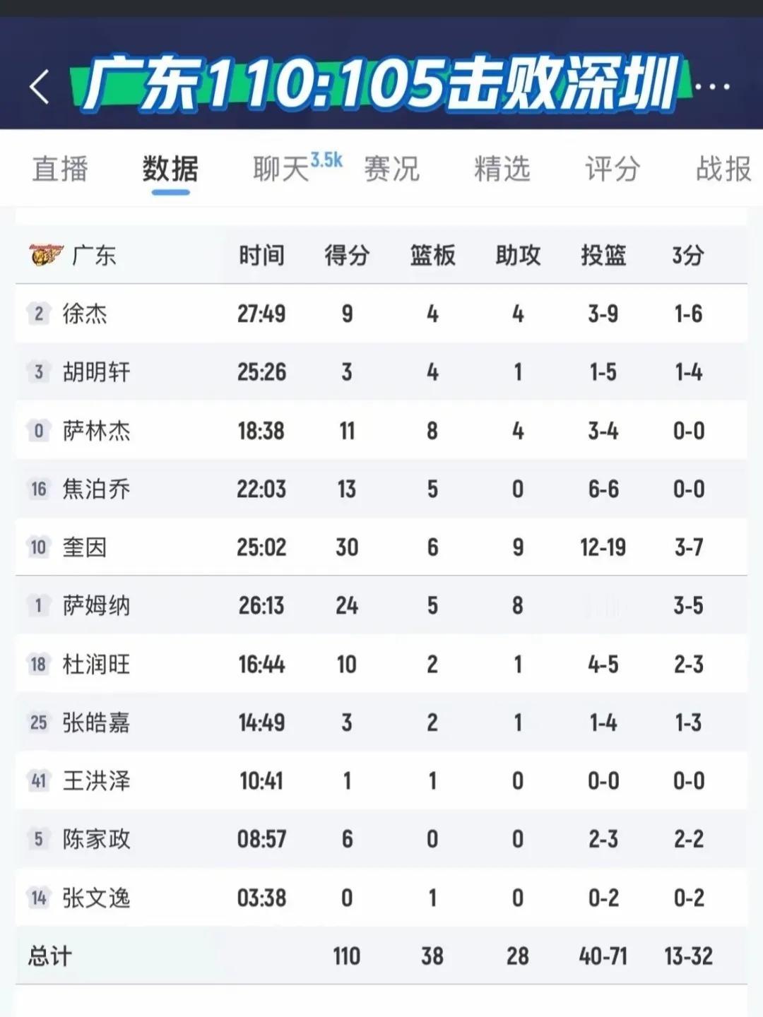 广东110-105战胜深圳,这场比赛很好看,一场对攻大战,特别是第二,第三节,深圳队虽然输了,但可以昂首离开,因为打得很棒,特别得为周鹏,贺希宁,王浩然喝彩,做为国内球员,他们表现可圈可点。 赞完客队,也得夸主队球员们,首先三个外援非常出色,焦泊乔打出最佳一场,杜润旺归来无缝连接,射手本质名不虚传,陈家政关键两个三分不愧未来之星,当然还得说徐杰了,最后一投让深圳队好友们晚安。