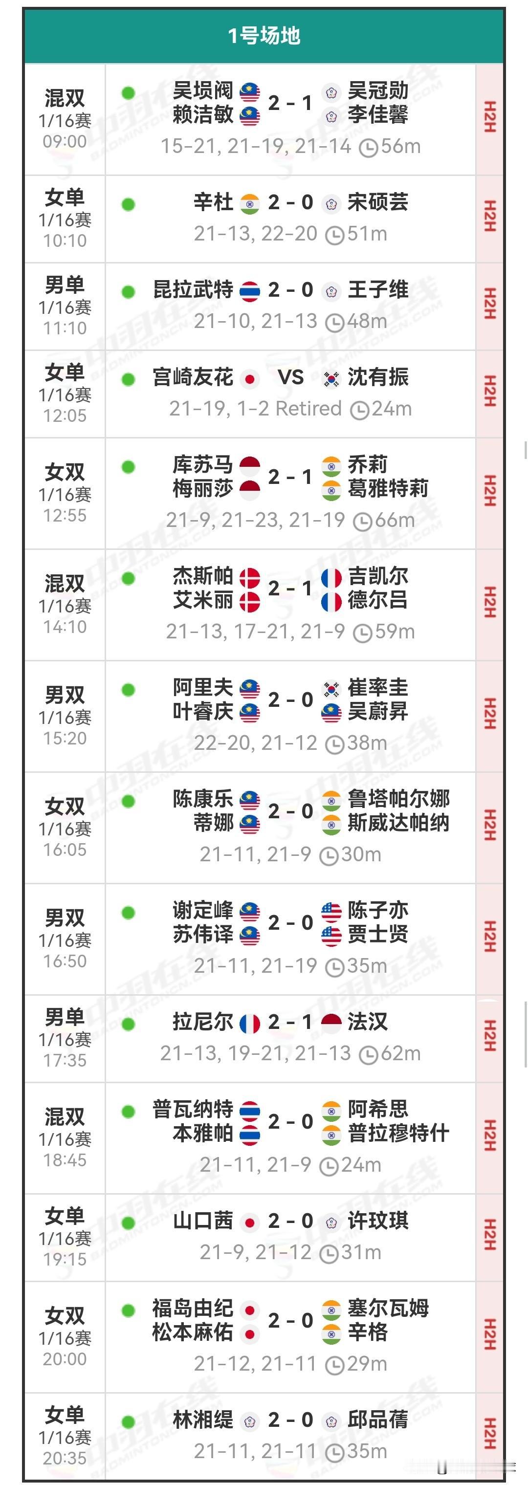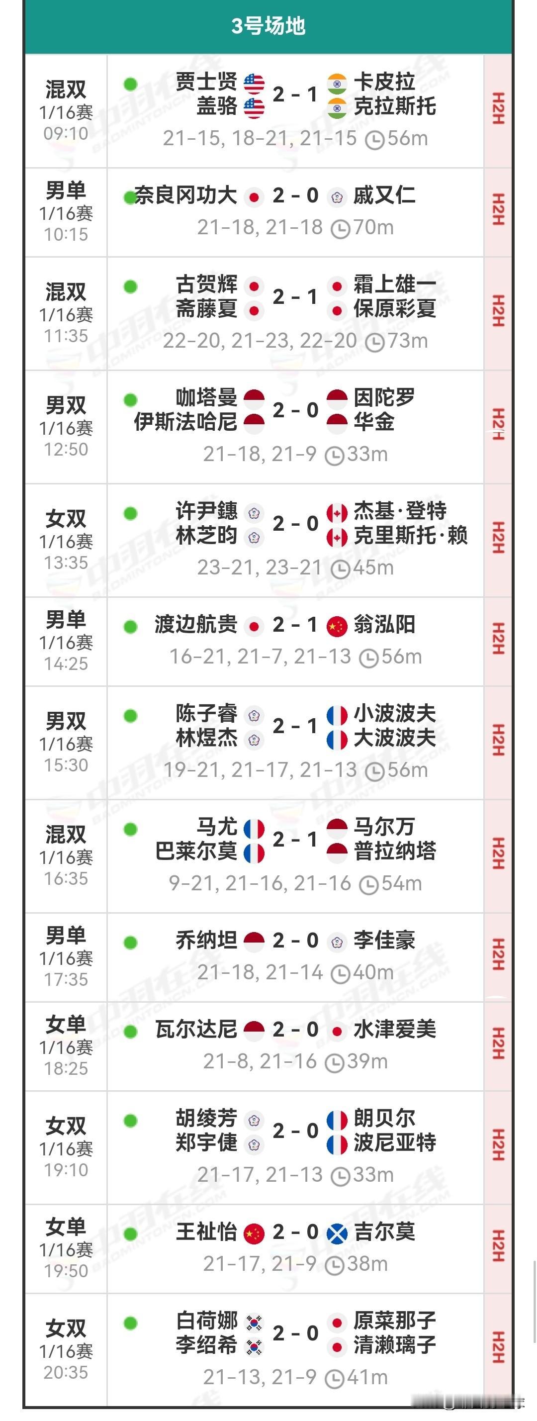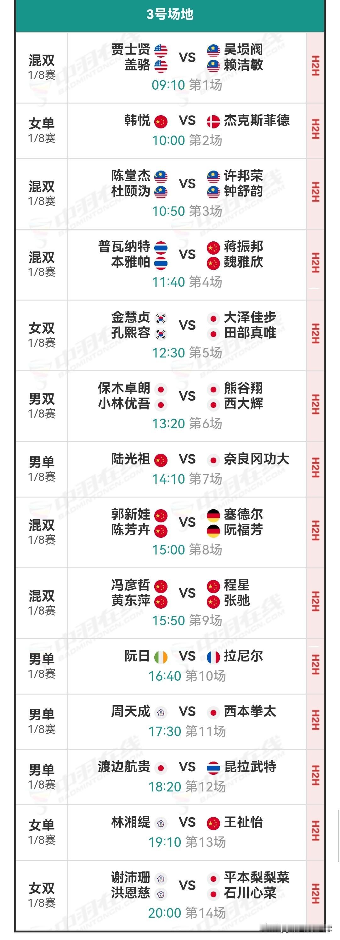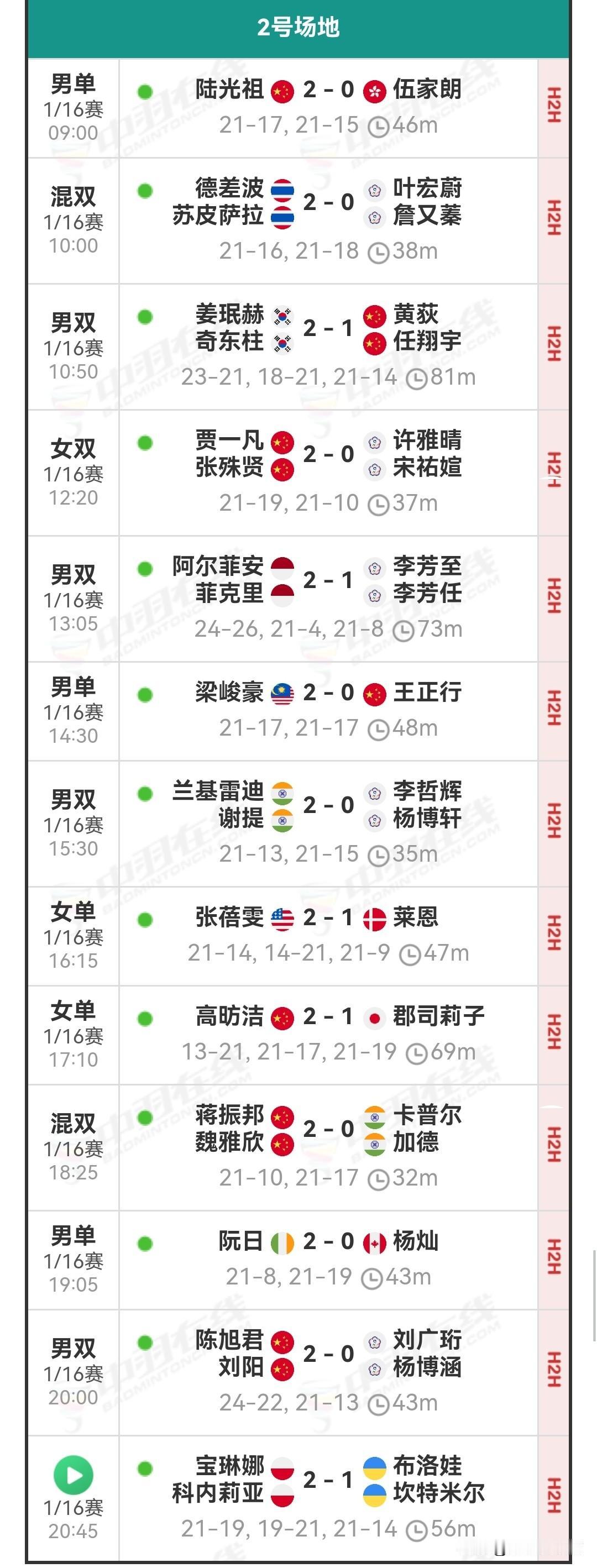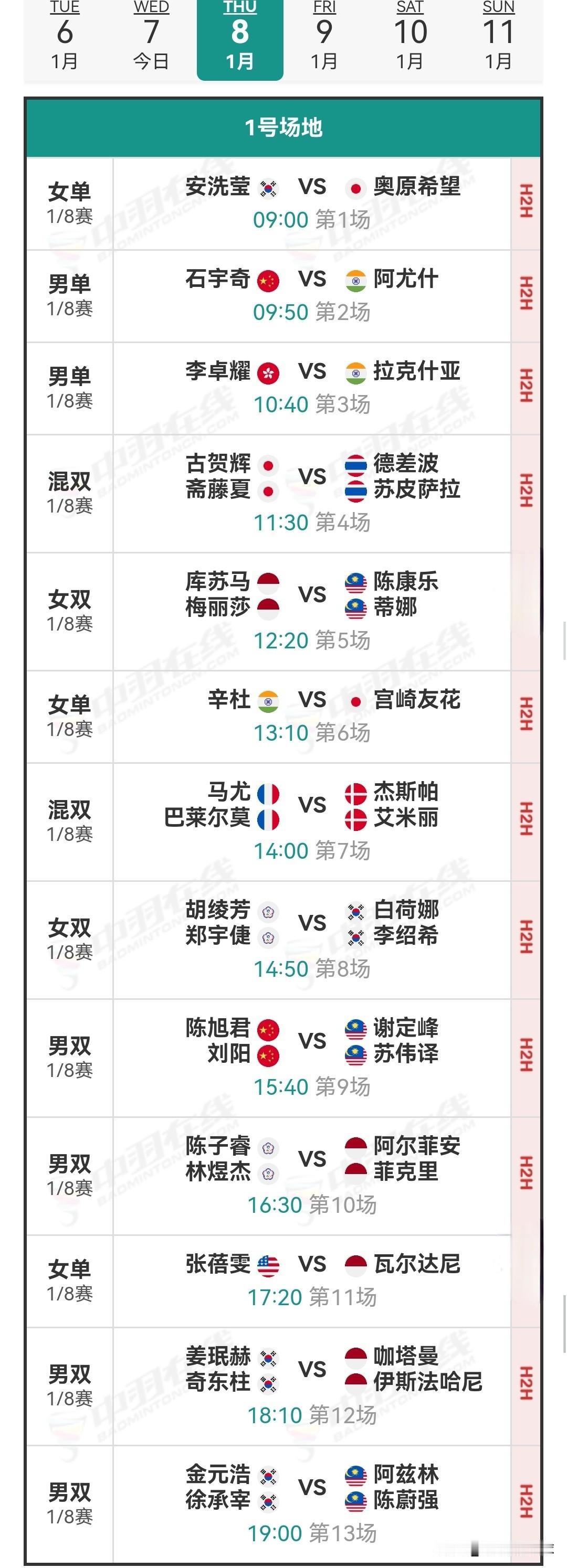1月8日马来西亚羽毛球公开赛1/8决赛安排 今日国羽赛果为6胜3负。陆光祖、凡贤组合、王祉怡、高昉洁、酱板鸭组合、陈旭君/刘阳皆击败各自对手,顺利晋级下一轮。 黄荻/任翔宇历经三局苦战,不敌姜珉赫/奇东柱;王正行连输两局,败于梁峻豪,连续六站一轮游;翁泓阳大战三局,被渡边航贵逆转淘汰。他们均在首轮折戟。 经过两日的激烈角逐,首轮1/16决赛全部落幕,国羽共斩获13胜5负的战绩。 明日的1/8决赛将于北京时间09:00开启,共有三块场地同时进行赛事。明日对阵为石宇奇vs阿尤什,陆光祖vs奈良冈功大,高昉洁vs山口茜,还有混双内战。明日详细对阵安排和今日详细战报如下: 羽毛球 羽毛球爱好者 羽毛球比赛 羽毛球公开赛 羽毛球赛程 羽毛球赛事 石宇奇 陈雨菲