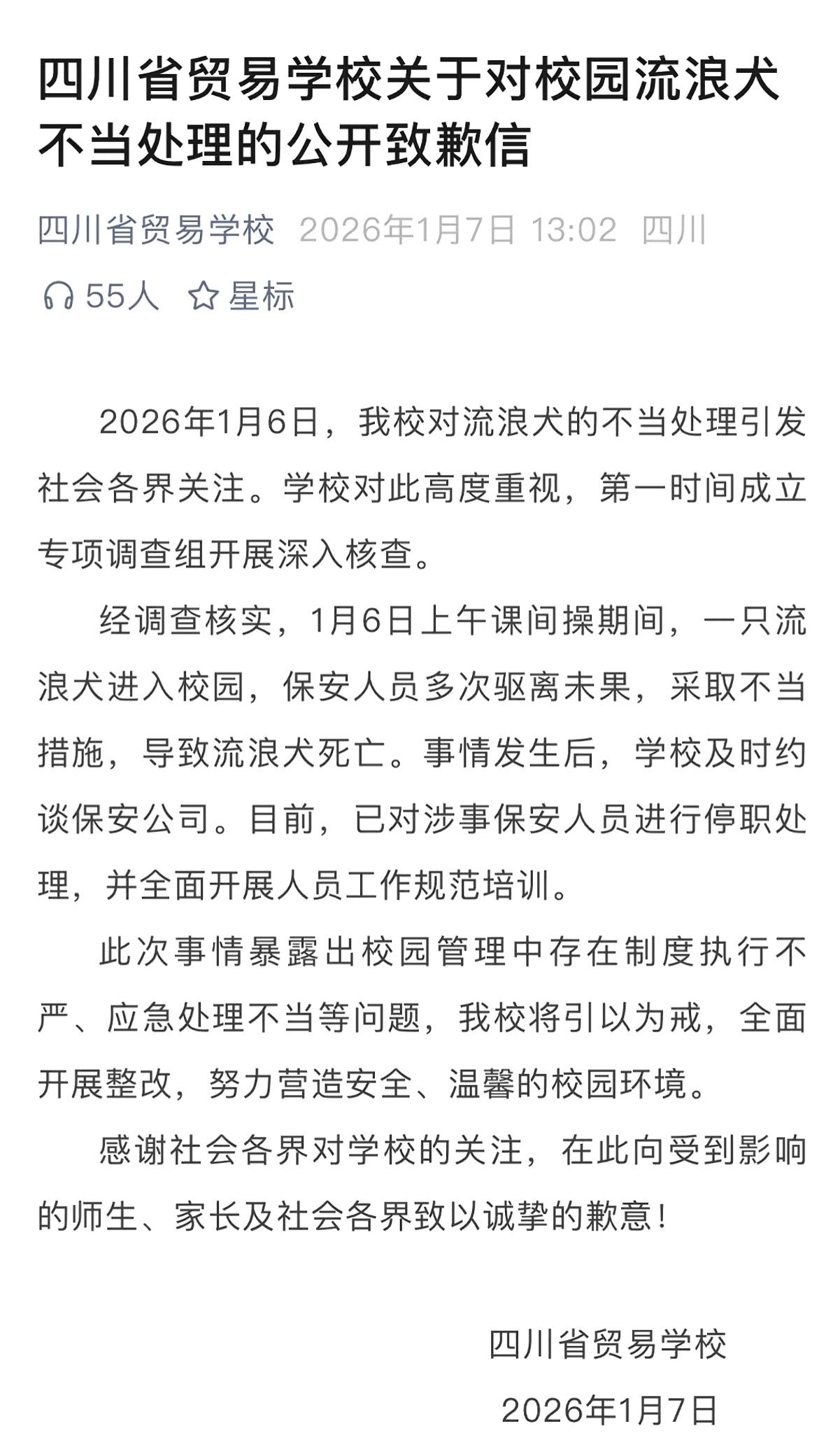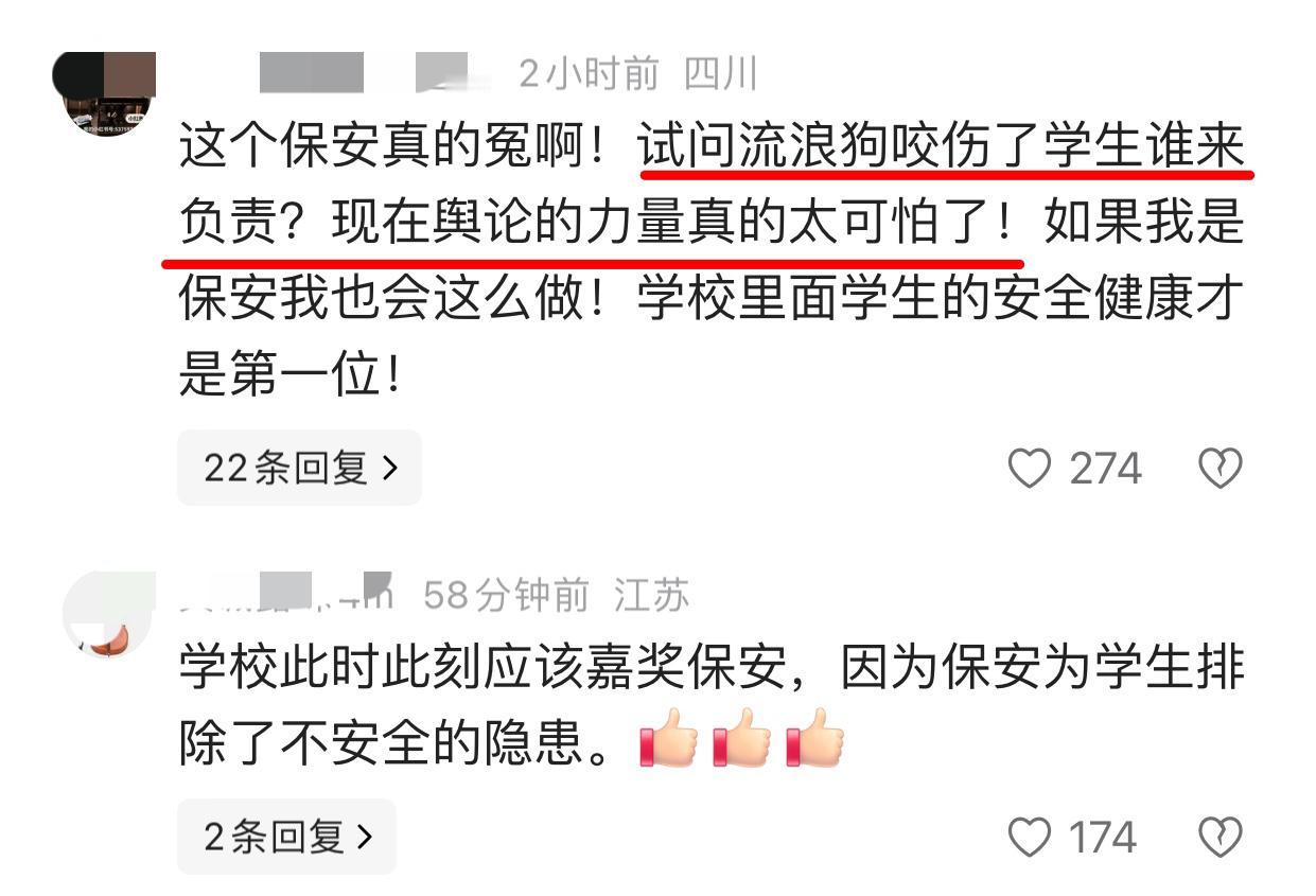 处理一只流浪犬=学校道歉+保安停职 四川省贸易学校处理流浪狗,隔壁的雅安职业技术学院又是给狗献花又是弄遗像,就因为这是他们学校的“团宠”,于是就有一个疑惑,这么受宠爱的小动物为什么让它流浪而不是好心人领养,如果不是走到隔壁被当成流浪犬,也不至于被处理掉。最委屈的还是贸易学校的保安,赶也赶不走,校领导还有要求,不打是工作没做好,打了就停职反省……好在评论区越来越理智,支持学校和保安的占一大部分。