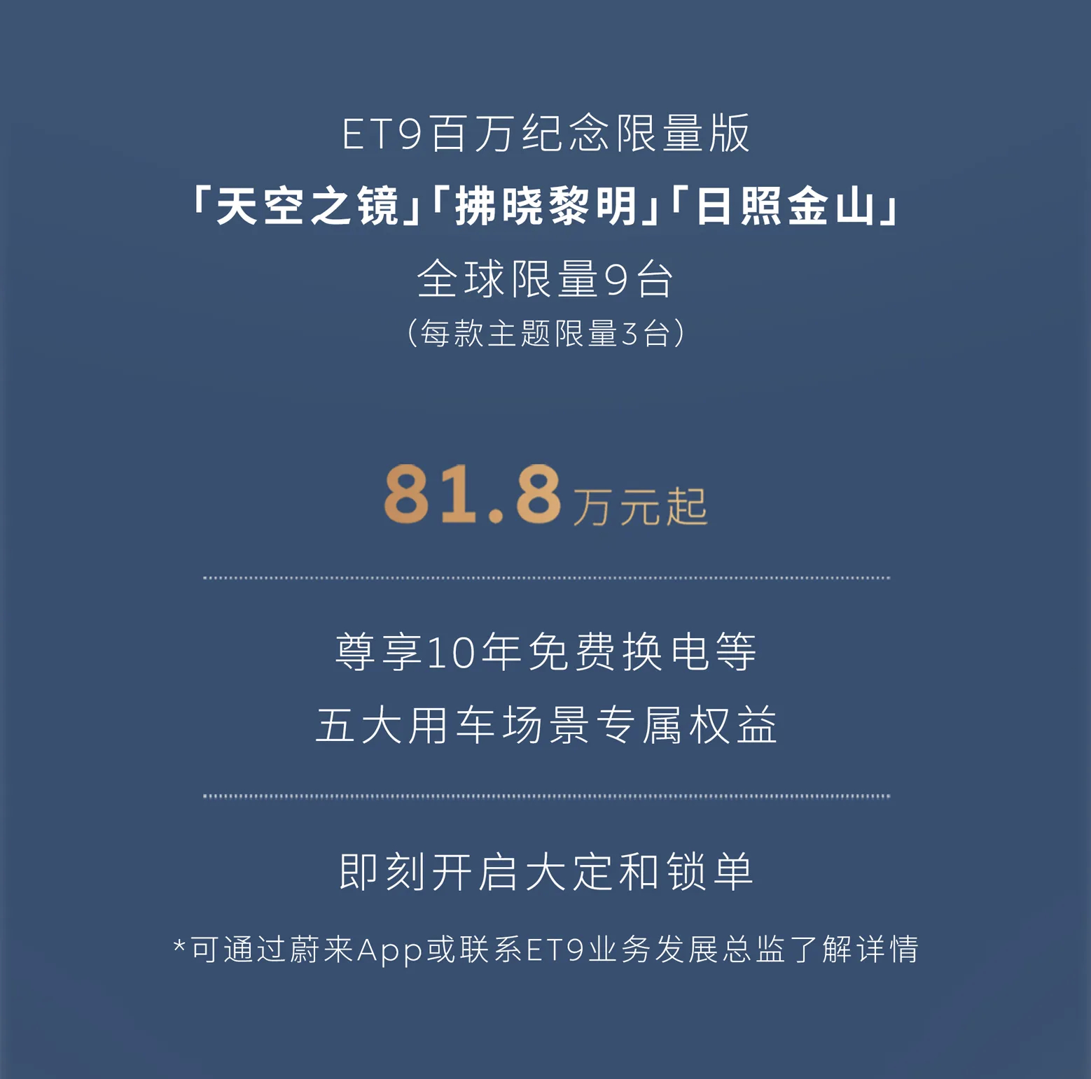 百万纪念款蔚来ET9,81.8万起,全球限量9台。车身上标注了不少1000000字样