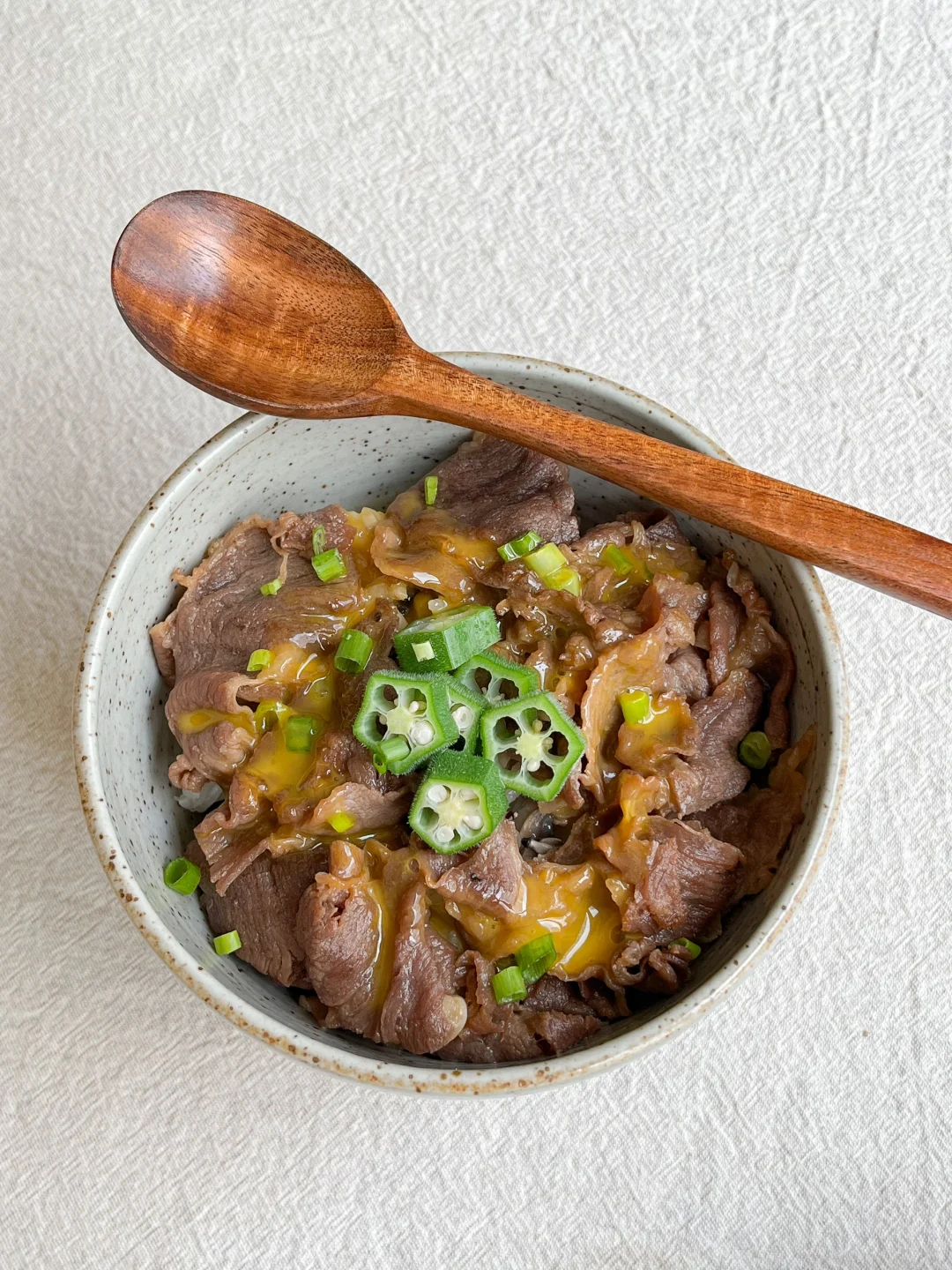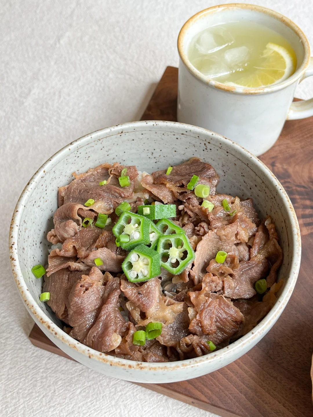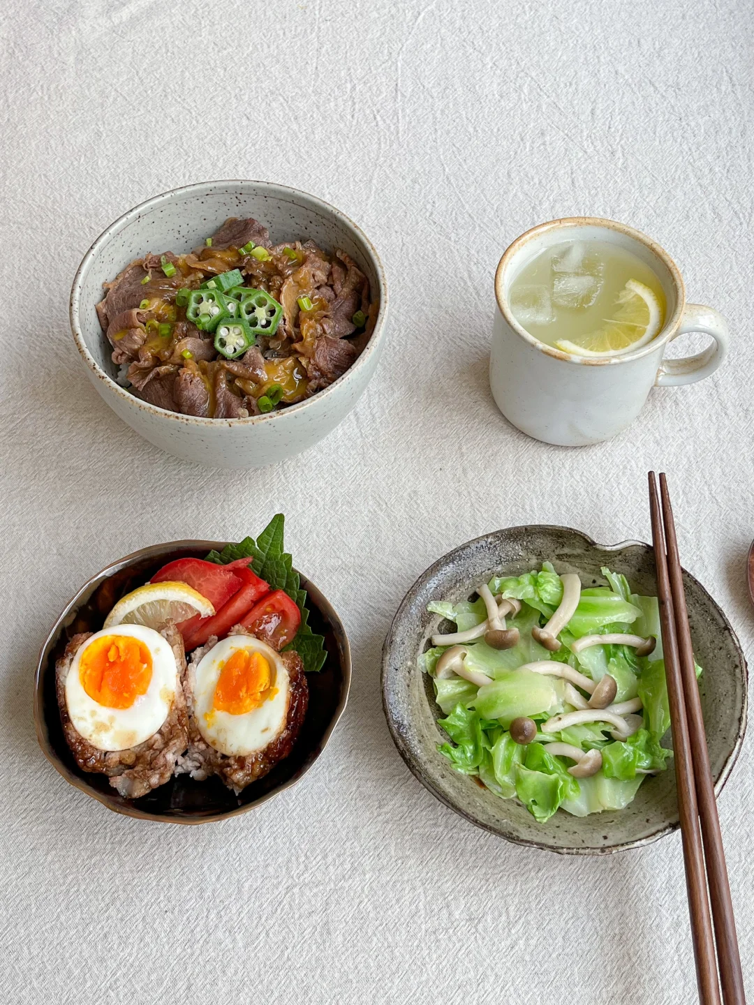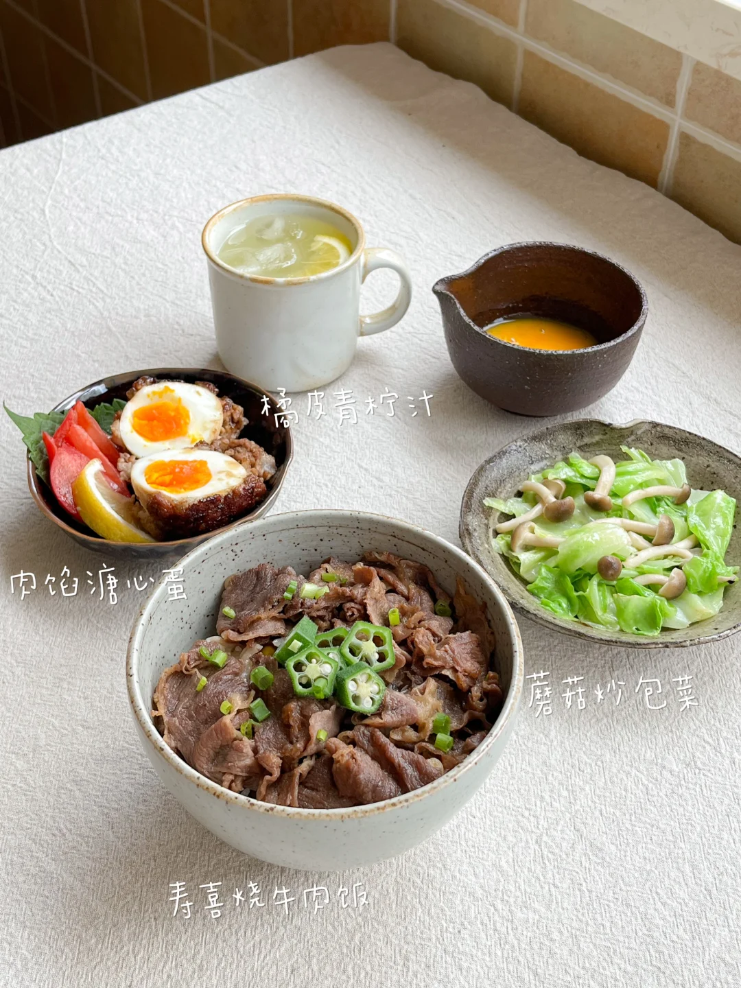 今日午餐: 秋葵寿喜烧牛肉饭🥩 肉馅溏心蛋🍳 蘑菇炒包菜🥬 橘皮青柠果汁🧃 早上逛菜场 很多都是自己家小菜园里的菜 卖相一般 但味道好 也没有打药 很健康 我还发现 很多菜都是2.5一斤 hhhh 夏天买蔬菜真是物美价廉 买完菜就回家做饭