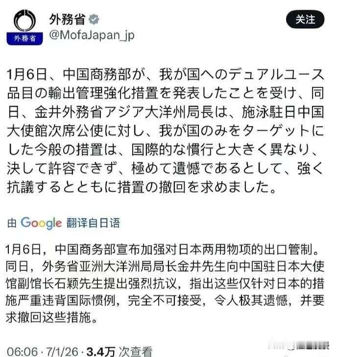 日本那边终于坐不住了, 憋了一宿,早上就跳出来喊冤 他们的外务省发话,对我们加强那些军民两用东西的出口管制造成强烈不满,说我们不按套路出牌,要求我们赶紧撤销。 早干嘛去了?给了两个月时间,不但不反思,还在那疯狂输出,现在知道急了?他们的抗议完全是在倒打一耙,根本不提自己领导人在台湾问题上说了什么过分的话,那是直接踩了我们的红线。我们这么做,就是为了维护自己的核心利益,完全合法合规。他们想一边破坏关系一边啥事没有,哪有那么好的事?这只是一个开始,后面还有更多“惊喜”等着他们慢慢消化。 各位读者你们怎么看?欢迎在评论区讨论。