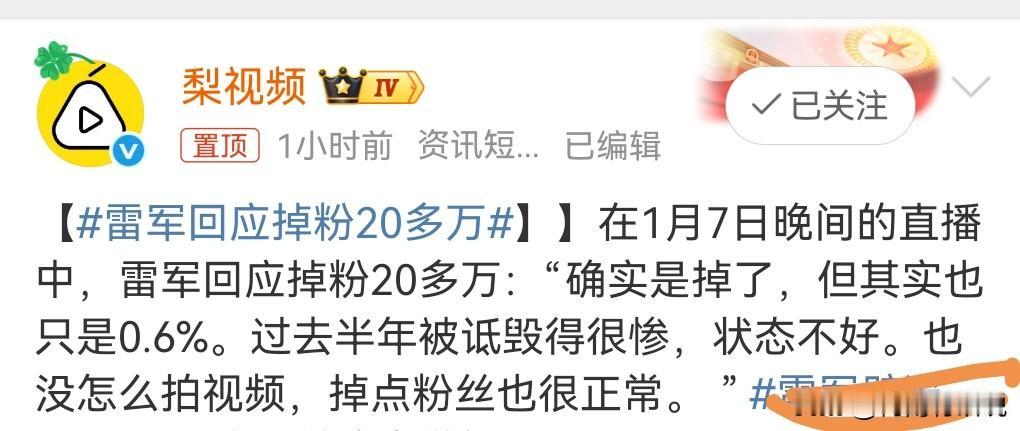 雷军的心态还是非常棒的。 面对掉粉那也是泰然处之啊。 雷军回应掉粉20多万,说确实是掉了一点。他说才掉0.6%。这很正常。 毕竟他某账号有4000多万粉丝啊。 那绝对是王者级别了。