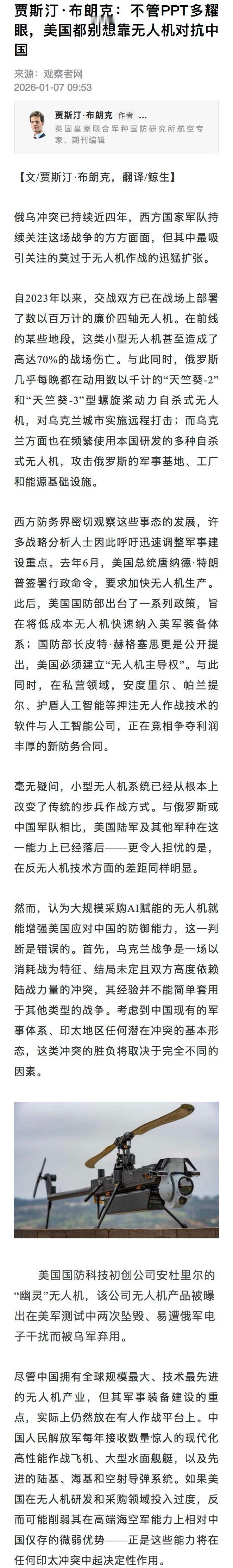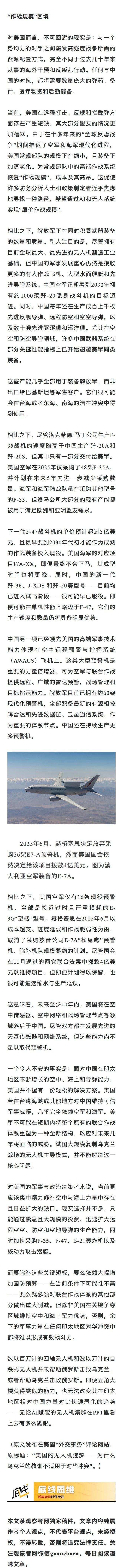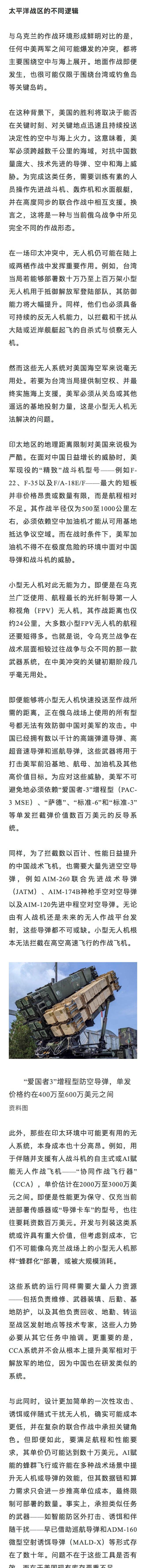 【不管PPT多耀眼,美国都别想靠无人机对抗中国】贾斯汀·布朗克:面对中国在印太地区不断增长的空中、海上和导弹能力,美国并不握有一份轻松的解决方案。试图大规模复制乌克兰战场的无人机主导模式,并不能解决这一核心问题。