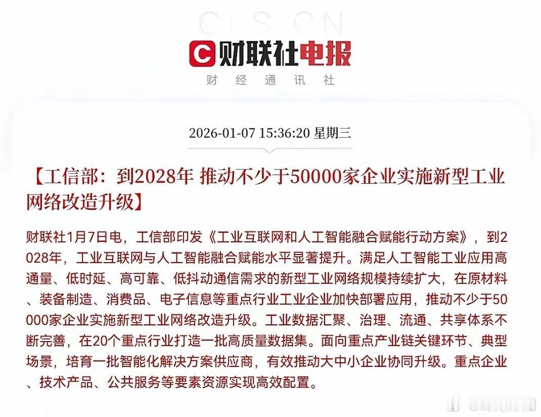 重磅利好突袭!工信部发文引爆算力赛道,明日这些方向或迎爆发15时36分,工信部重磅印发《工业互联网和人工智能融合赋能行动方案》,政策红利强势落地,算力工程及新型工业化赛道迎来强劲催化,核心受益企业有望乘风而起。《行动方案》明确提出关键目标:到2028年,推动不少于5万家企业完成新型工业互联网络改造升级;同时着重强调强化工业智能算力供给,引导工业企业加速部署边缘一体机、智能网关等核心设备。这一政策堪称火上浇油,瞬间点燃市场热情。其核心抓手在于“网络升级+算力下沉+设备部署”三位一体,本质是推动中国工业实现从“单纯联网”到“智能应用”的跨越升级。这不仅为算力工程开辟出万亿级的工业市场蓝海,更给新型工业化注入了智能内核。方案落地后,中国工业将逐步构建起“数据驱动决策、算力赋能生产”的新质生产力体系,助力我国在全球智能制造的竞争中抢占先机,无疑是提振产业发展的重大利好。股民朋友们务必坐稳扶好!受此重磅政策刺激,预计明日算力、存储芯片、AI应用等核心细分领域将迎来全面爆发,提前布局这些方向的投资者,有望在新一轮行情中收获满满。风险提示:以上内容基于公开信息整理,不构成投资建议。