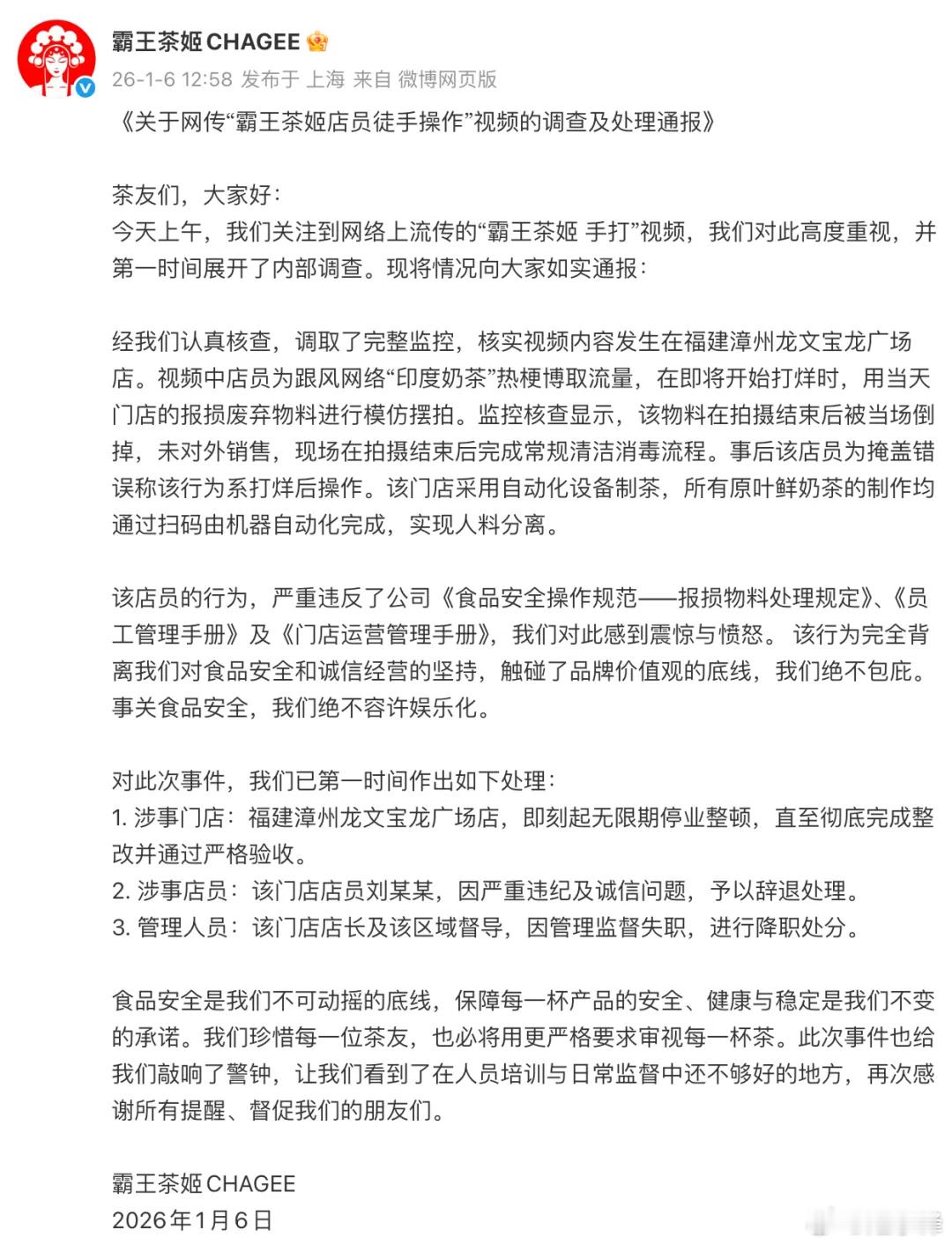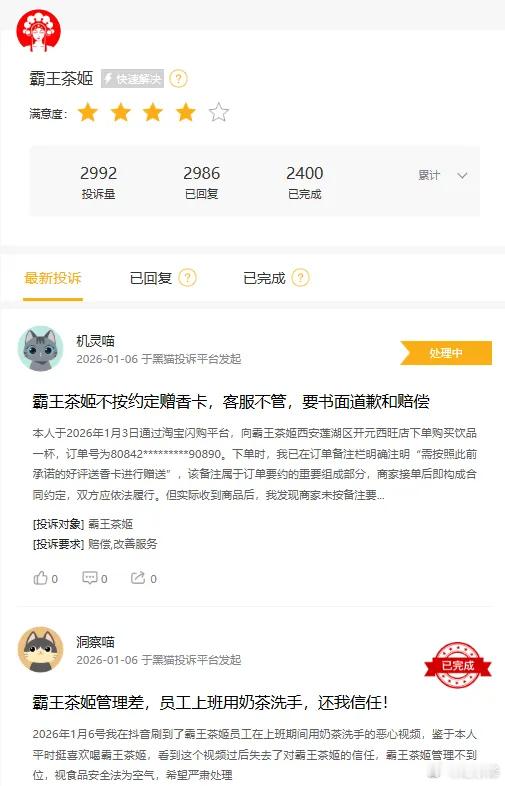 股价跌去近70%!霸王茶姬,咋了?摘自老六 观点如何走出一条新路?霸榜热搜霸王茶姬快成热搜常客了。仅最近一个多月,霸王茶姬就三次成为舆论焦点。其一,“手打奶茶”事件。就在1月6日,霸王茶姬 手打 登上微博热搜。原因是有网友晒出,一女子身着霸王茶姬工服,徒手制作奶茶的视频。视频画面显示,该女子并未佩戴手套,徒手捏挤柠檬片或橙片后,直接用手在奶茶杯内搅拌饮品。该视频还配文:“还好我没有洗手”。这番操作直接让网友破防了,尤其是那些经常喝霸王茶姬的网友。有人直言“再也不喝了”“恶心”。眼看着舆论不断发酵,霸王茶姬连忙发布《关于网传“霸王茶姬店员徒手操作”视频的调查及处理通报》称,经认真核查,调取了完整监控,核实视频内容发生在福建漳州龙文宝龙广场店。视频中店员为跟风网络“印度奶茶”热梗博取流量,在即将开始打烊时,用当天门店的报损废弃物料进行模仿摆拍。在通报中,霸王茶姬表示“震惊与愤怒”,并对涉事门店、涉事店员和管理人员进行了处理。霸王茶姬的动作非常快,但该事件带来的信任危机还在蔓延。在餐饮行业,食品安全是底线,摆拍不是借口,没卖出去不等于可以不守规矩。这至少暴露出门店在员工培训、日常监督方面存在漏洞。其二,咖啡因事件。时间回到2025年12月26日,霸王茶姬美股盘间一度跌近16%,霸王茶姬大跌话题在次日早间冲上了微博热搜第一位。这背后是一则传言。知乎上一位博主发文质疑霸王茶姬新品奶茶的咖啡因含量过高,并指控“高浓度咖啡因蹭准毒品擦边球”、“奶茶里添加高咖啡因是为了让人上瘾”。霸王茶姬可能都懵了:我就卖个奶茶,咋变成“卖毒品”了?很快,霸王茶姬给出了“定性为恶意造谣,法务介入启动法律程序”的回应,并给出数据“按100ml计,产品咖啡因含量与拿铁相当、显著低于美式”。可能网友的言论过于离奇,连上海禁毒办都出来辟谣,说茶叶里天然含有咖啡因,和提纯后的“毒品”完全是两回事。虽然奶茶的确不太健康,但称之为“毒品”就有点过了。其三,创始人结婚事件。据媒体报道,2025年12月15日,霸王茶姬创始人张俊杰与光伏龙头天合光能创始人高纪凡之女高海纯举办婚礼。婚礼现场部分视频及图片流出,给宾客准备的饮品是霸王茶姬奶茶。其实早在11月,他们俩结婚的消息就传遍了互联网,张俊杰本人通过朋友圈证实了这一婚讯,还出面辟谣:“在我遇见我妻子(高海纯)前,从未有过婚姻,也从未发生‘茶叶富商残疾女儿’的任何故事。”一个是逆袭成功的霸道总裁,一个是顶级“光二代”,这不仅是童话照进现实,更是两家大企业的强强联合。热搜不断,风波不断,围绕在霸王茶姬身边的担忧也没有停歇。“2992条投诉”霸王茶姬不是第一次面临这些风波。2025年“3·15”前夕,宝鸡市场监督管理局联合华商报-二三里资讯开展“315·现场查”发现,霸王茶姬宝鸡银泰店存在食品添加剂没有专人专管、计量用秤不准、物品混放等问题。2025年1月,测评博主“老爸评测”发布视频称,检测了包括蜜雪冰城、古茗、茶百道、喜茶、霸王茶姬等12家头部奶茶品牌的产品,发现其普遍使用一种名为“冰勃朗”的基底乳。视频指出:冰勃朗成分与植脂末(氢化植物油制品)高度相似,脱水后脂肪含量甚至更高,并称其为“科技乳”。霸王茶姬和供应链赶忙做出回应,强调冰勃朗与植脂末本质不同,冰勃朗前三成分为饮用水、非氢化植物油、浓缩乳(生牛乳),而植脂末为淀粉糖、氢化植物油、乳清粉。霸王茶姬更是发布《每一杯茶的安全透明,都是我们坚守的承诺》,详细公开产品配方。关于咖啡因含量的质疑更是早已有之。此前有网友发帖称,喝完“万里木兰”后出现心悸疼痛,连夜去医院测心电图。帖子一出,引发众多网友共鸣。有网友称,自己喝了“万里木兰”奶茶后出现心慌的症状,还有网友表示喝完之后心率达到105次/分;还有网友称,“中午喝完没多久,到下午开始心慌手抖,呼吸困难,拉肚子,去医院检查也不是细菌感染,怀疑是过敏导致的。”“万里木兰”是霸王茶姬那时候推出的年度重磅新品,主打“清爽低负担健康饮品”的概念。舆论出现后,霸王茶姬客服给出的回应是:“万里木兰”使用的是红茶底,可能是顾客对茶多酚过敏了。如有不适症状,请立即暂停饮用,并建议去医院检查。但根据中国消费者报的文章,科信食品与健康信息交流中心主任钟凯则认为,上述网友出现的一些症状与茶多酚无关,而是因为奶茶中的咖啡因:咖啡因个人耐受差异大,敏感的人会出现心慌心悸等不适症状,有的还会头晕眼花,像民间说的“茶醉”也是咖啡因所致。有记者曾在霸王茶姬小程序查询发现,“万里木兰”的茶多酚含量为62.3mg/100ml,咖啡因含量为31.8mg/100ml。一杯中杯470ml的“万里木兰”饮品咖啡因含量约为150mg。还有人做了对比,星巴克咖啡的中杯美式中含有两份浓缩咖啡,咖啡因含量在150毫克。换句话说,一杯中杯“万里木兰”的咖啡因含量等同于两份浓缩咖啡的咖啡因含量。此前,也有网友发帖称下午喝霸王茶姬“伯牙绝弦”结果失眠了,凌晨四点依旧毫无睡意。咖啡因过量摄入可能导致一系列健康问题。网友质疑,主打“健康”的霸王茶姬,难道不知道这个常识?在消费者服务平台“黑猫投诉”上,霸王茶姬累计有2992条投诉,聚焦在产品质量、退款纠纷、服务态度等问