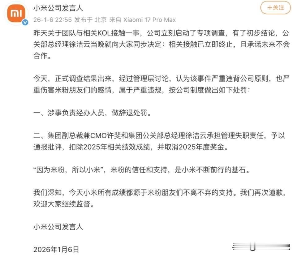 2026年1月6日晚上,小米公司发布一份处理通报,这件事的起因是他们之前和一位网名叫做“万能的大熊”的博主有过合作,而这位博主长期被小米粉丝称为专门批评小米的人,消息一出来,粉丝们反应很大,直接在评论区里刷屏表示反对,小米公司行动很快,马上停止了这次合作,还把负责这项工作的相关人员给辞退了。