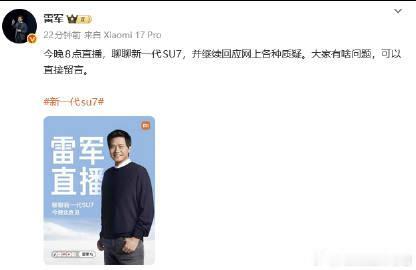雷军晚上要继续直播回应质疑,估计也要宣传一波新SU7 不知道会不会回应最近风口浪尖的KOL事件