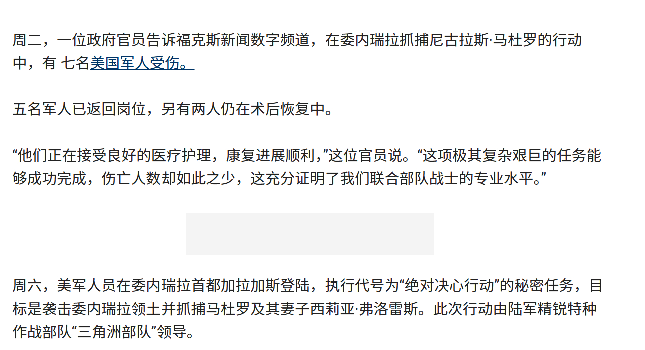 🔻福克斯新闻报道,美军在突袭委内瑞拉的“绝对决心”行动中,有7名美军受伤,其中
