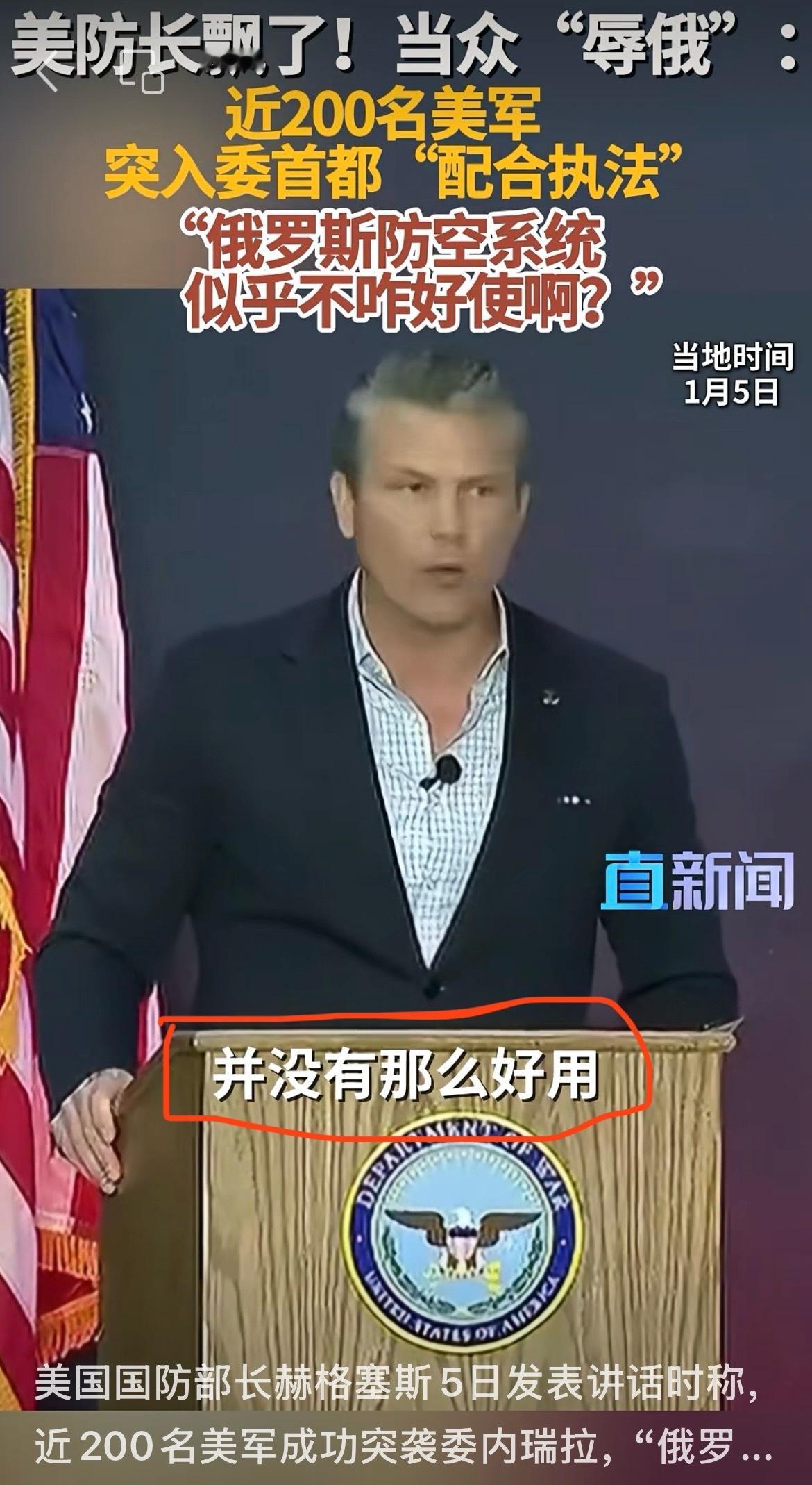 俄制防空系统被嘲笑?!美防长:俄罗斯的防空系统没能发挥作用美国 昨天,美国战争部长海格塞斯在直播中调侃俄罗斯人说:“三天前,在委内瑞拉首都加拉加斯市中心,近200名我们最优秀的美国士兵被派往那里。“看来俄罗斯的防空系统没能发挥作用,是吧?”有关视频说美防长飘了。我觉得他没有飘,美国的军力目前已经对俄罗斯构成了碾压式的优势。俄罗斯海军在美国海军面前可以算归零了,除了潜艇就没有几艘象样的军舰了。空军更是落后美国空军几代了。号称强大的陆军在乌克兰战场已经颜面尽失。俄罗斯只是运气好,遇到了软弱的拜登和亲俄的特朗普。来源:冬雷闲谈