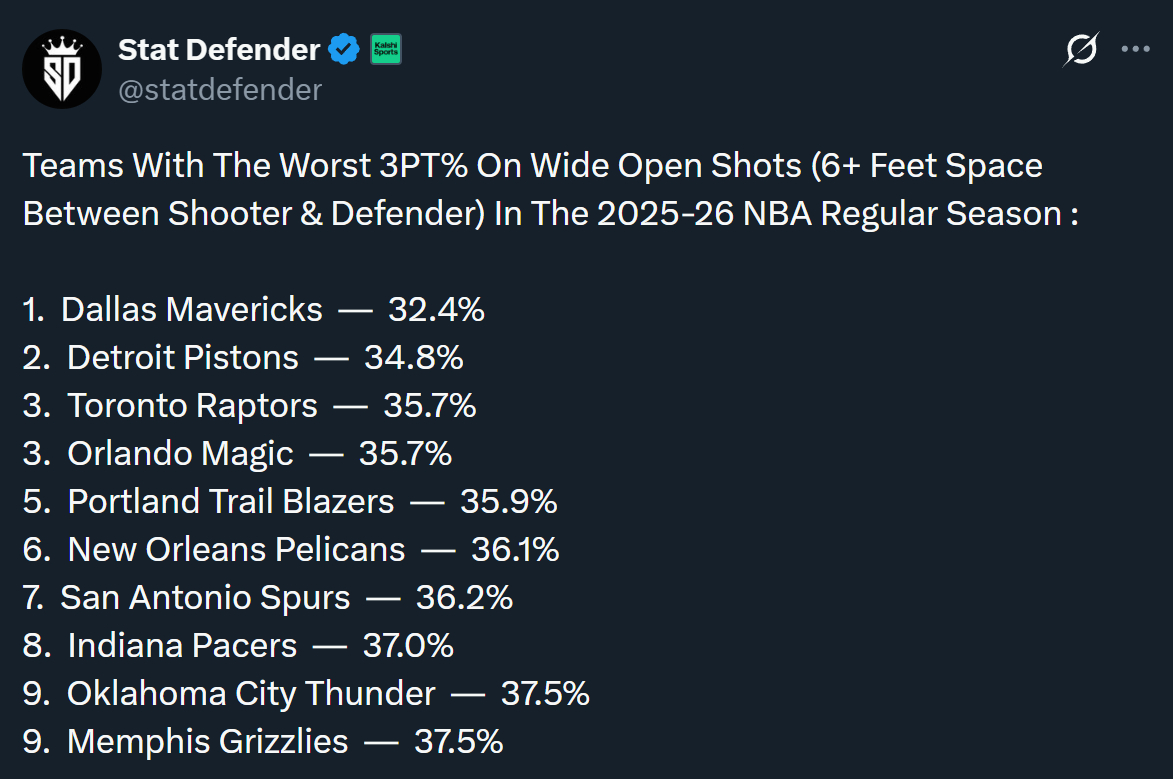 还有高手?全联盟最差大空位三分命中率排行榜(防守人和出手人间隔至少6英尺),独行侠32.4%领跑,雷霆37.5%排名第九。爵士vs雷霆雷霆2026nba全明星投票