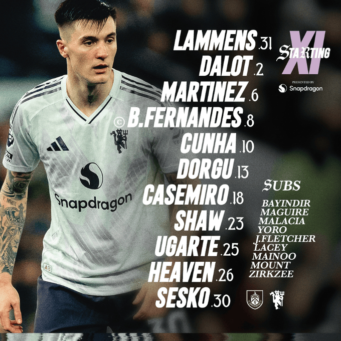 曼联首发:31-拉门斯、6-利桑德罗-马丁内斯、26-艾登-海文、13-多古、23-卢克-肖、25-乌加特、18-卡塞米罗、2-达洛特、8-布鲁诺-费尔南德斯、10-马特乌斯-库尼亚、30-谢什科替补:1-巴因迪尔、5-马奎尔、12-马拉西亚、15-约罗、38-杰克-弗莱彻、61-谢伊-莱西、37-梅努、7-芒特、11-齐尔克泽伯恩利vs曼联英超联赛