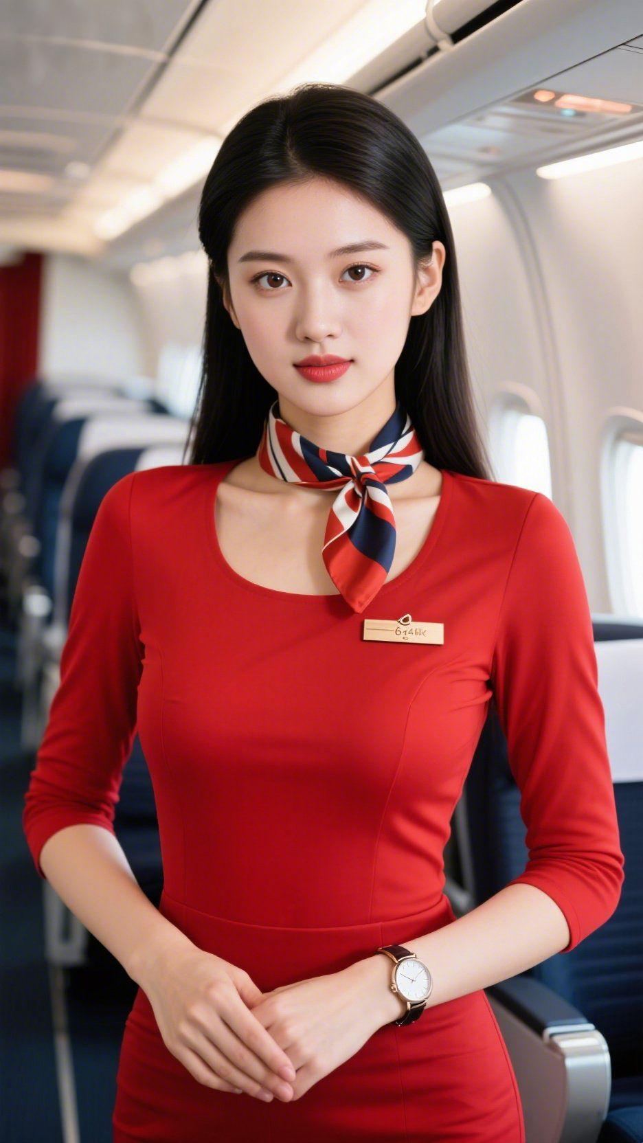 舱间暖红柔 机舱的浅光裹着整洁座椅,她身上的正红制服像浸了日光的暖,领间丝巾的纹络漫着轻缓的韵,铭牌的微光落在衣料上,是妥帖的规整。 双手轻叠的姿态里,藏着旅途独有的温和——不是刻意的周全,是春风裹云般的舒展,连腕间表针,都跟着这抹红慢了半分节奏。 无需多余装饰,只这抹红、一身舒展,便把旅途柔意揉进气息里,像云间漫过的光,稳稳落在视线中,让人念起飞行里那些从容的温柔时刻。 舱间暖意 旅途柔韵
