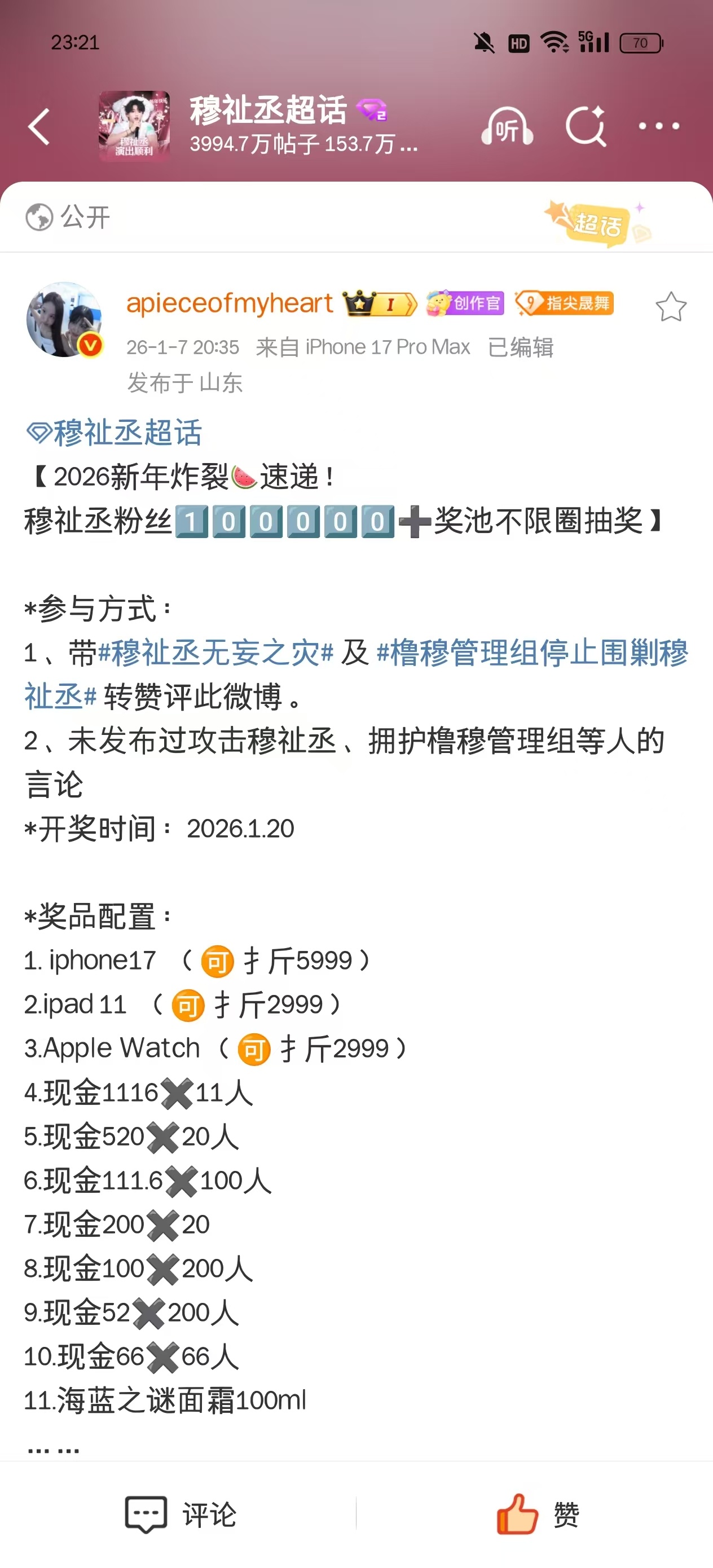 mzc穆祉丞家的抽奖博被举掉了,在申诉