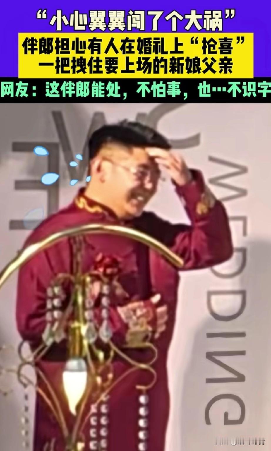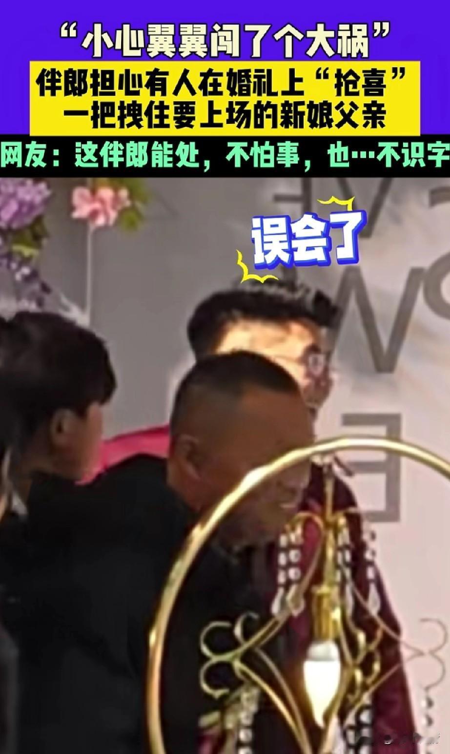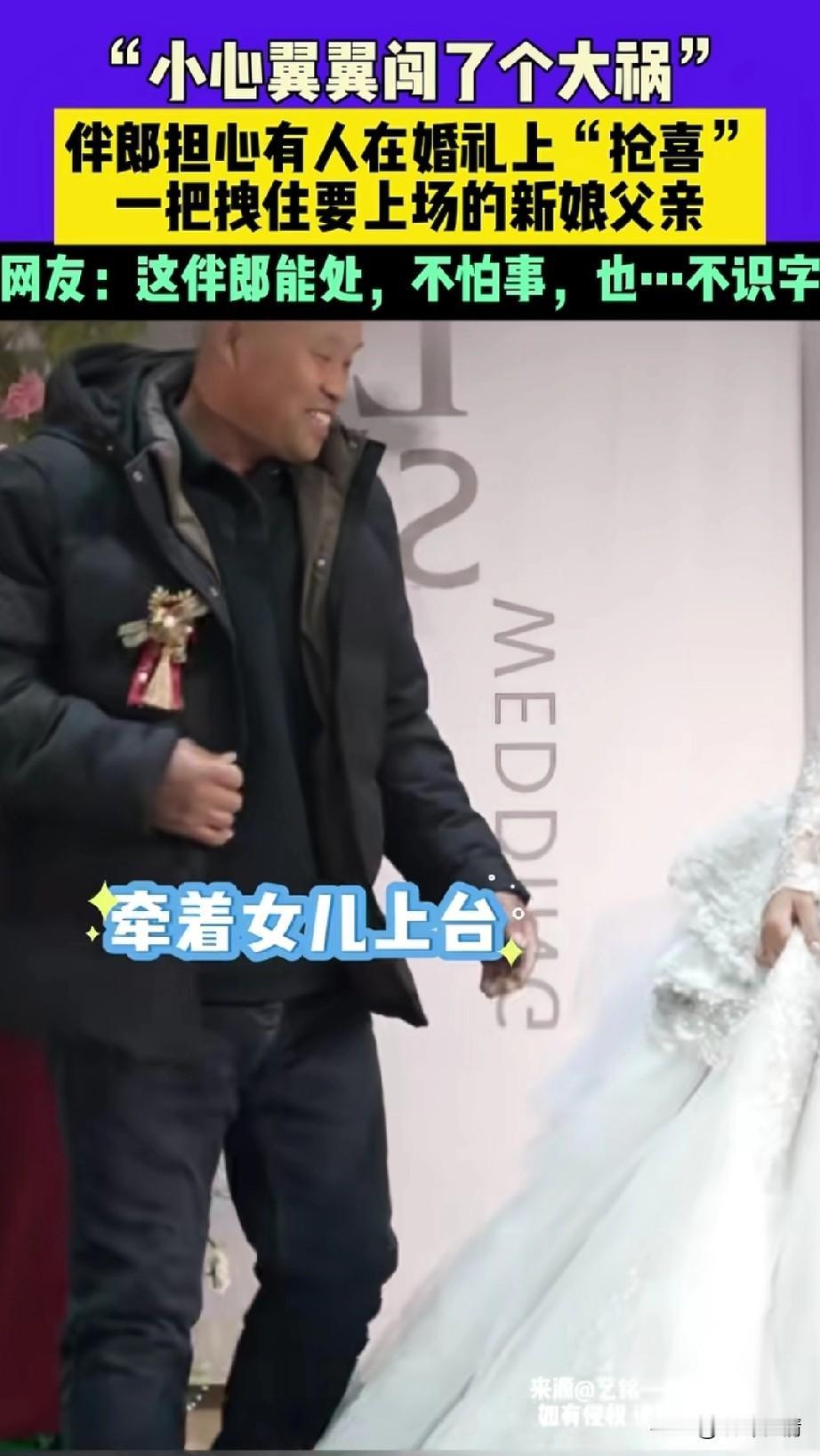 山东婚礼上的伴郎火了, 由于山东婚礼上总有人抢喜, 这个伴郎作为新郎的好兄弟, 势必要守护自己兄弟的婚礼, 他在婚礼上小心翼翼, 突然司仪张口有请新娘父亲, 站在旁边的一位老大哥, 就准备上台牵女儿的手, 刚迈出一只脚, 就被旁边的伴郎用手拽住了, 而且还怒目而视, 仿佛在说有我在,谁也别想抢喜, 被他拽住的新娘父亲也是一愣, 旁边的亲戚也是被吓了一跳, 随后伴郎旁边的人提醒他, 你在干什么?这是新娘的父亲! 伴郎这才反应过来, 张开嘴,做出了嗷的动作, 直接把被拽住的新娘父亲逗笑了, 新娘父亲这才顺利的上台去牵新娘的手,留下了抹着额头汗水的伴郎, 婚礼上的这一小插曲, 让原本欢快的气氛更加欢乐了, 网友纷纷表示这哥们能处, 还有网友表示又不是你结婚,你紧张个啥?更有网友表示,一看这小哥就是第一次当伴郎! 大家对于紧张的伴郎犯了如此大的错误怎么看? 晒出你梦中的婚礼 伴郎行为 伴郎接亲 伴娘伴郎仪式 中国最牛伴郎团