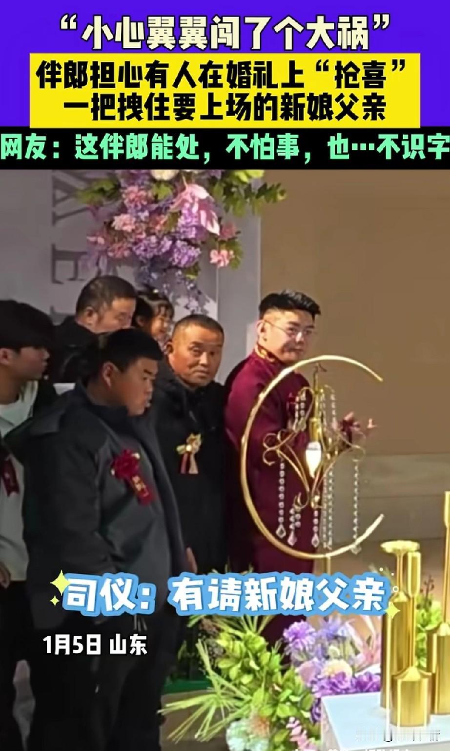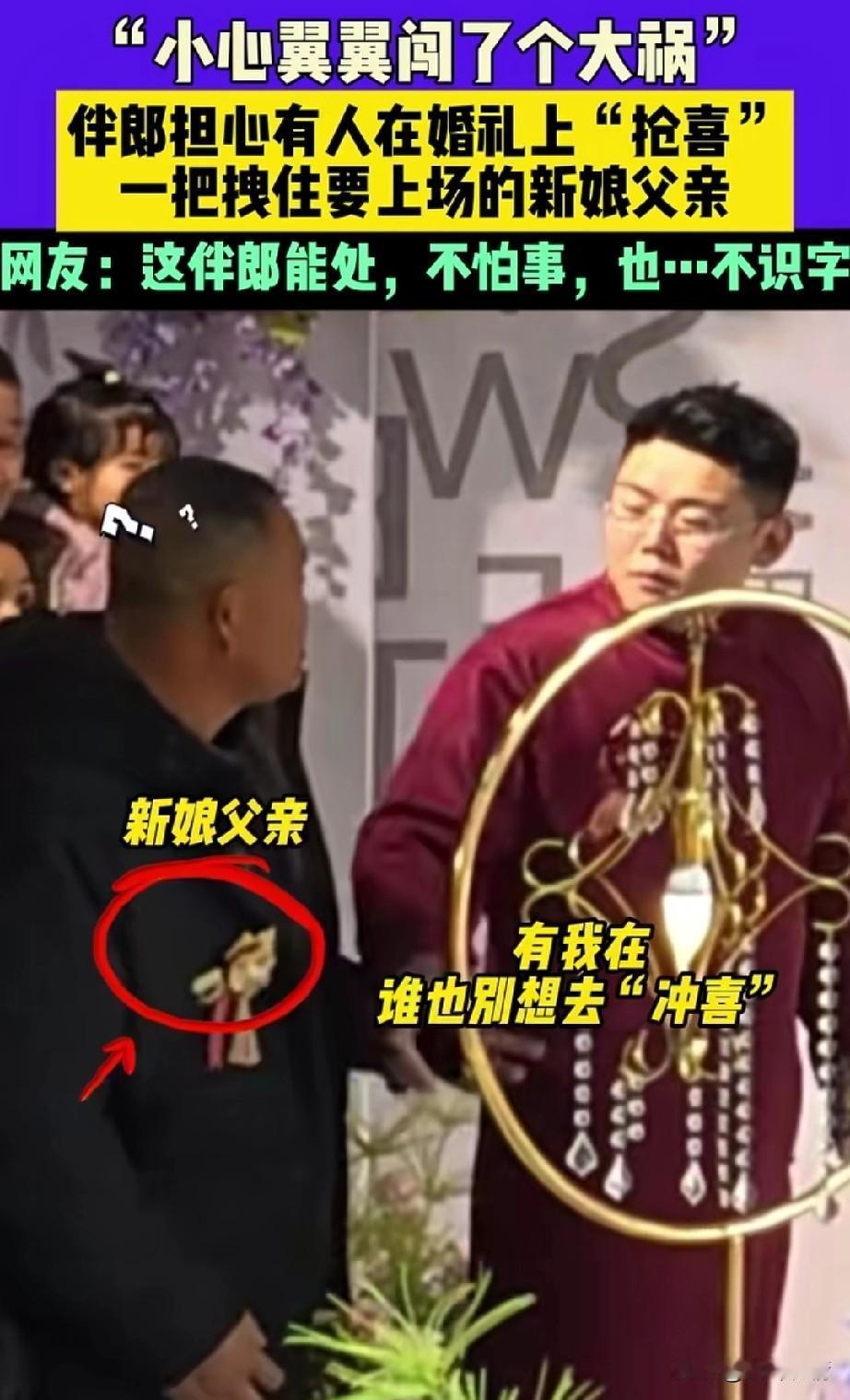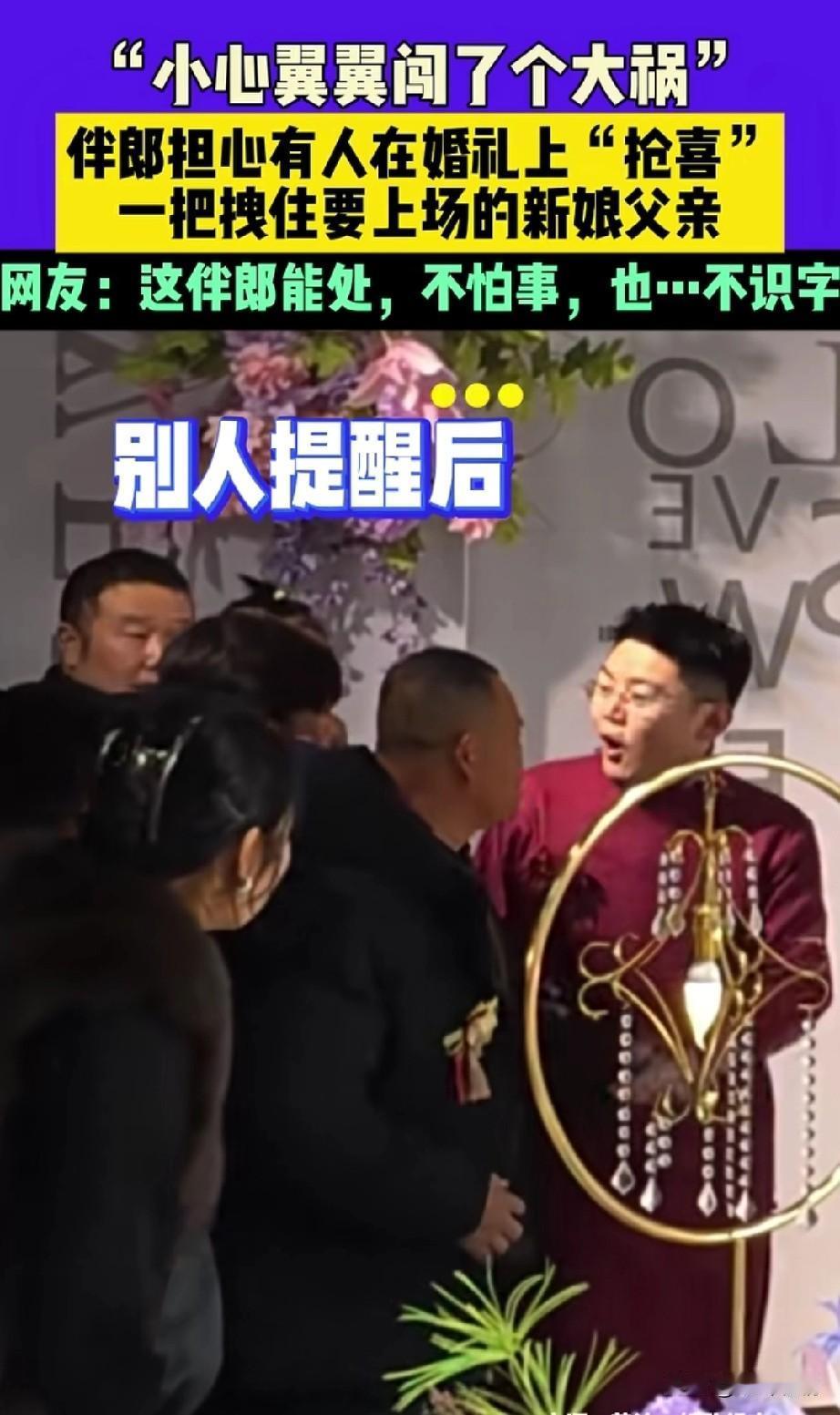 山东婚礼上的伴郎火了, 由于山东婚礼上总有人抢喜, 这个伴郎作为新郎的好兄弟, 势必要守护自己兄弟的婚礼, 他在婚礼上小心翼翼, 突然司仪张口有请新娘父亲, 站在旁边的一位老大哥, 就准备上台牵女儿的手, 刚迈出一只脚, 就被旁边的伴郎用手拽住了, 而且还怒目而视, 仿佛在说有我在,谁也别想抢喜, 被他拽住的新娘父亲也是一愣, 旁边的亲戚也是被吓了一跳, 随后伴郎旁边的人提醒他, 你在干什么?这是新娘的父亲! 伴郎这才反应过来, 张开嘴,做出了嗷的动作, 直接把被拽住的新娘父亲逗笑了, 新娘父亲这才顺利的上台去牵新娘的手,留下了抹着额头汗水的伴郎, 婚礼上的这一小插曲, 让原本欢快的气氛更加欢乐了, 网友纷纷表示这哥们能处, 还有网友表示又不是你结婚,你紧张个啥?更有网友表示,一看这小哥就是第一次当伴郎! 大家对于紧张的伴郎犯了如此大的错误怎么看? 晒出你梦中的婚礼 伴郎行为 伴郎接亲 伴娘伴郎仪式 中国最牛伴郎团