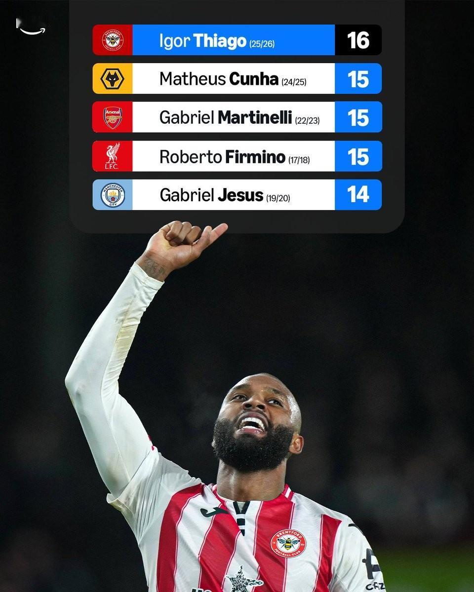 天啊!真没想到英超进球暂排第二是他! 这一轮英超比赛,小蜜蜂的锋线球员伊戈尔蒂亚戈又梅开二度布。 布伦特福德3-0桑德兰,伊戈尔-蒂亚戈双响 伊戈尔·蒂亚戈本赛季英超已打进16球,创单赛季巴西球员进球纪录。 是否有希望进巴西队了呢? 恭喜恭喜这几位名巴西球员也有进球。 乔林顿/吉马良斯/埃万尼尔松。 纽卡4-3利兹联,巴恩斯双响,阿伦森双响+送点,吉马良斯传射,乔林顿破门。