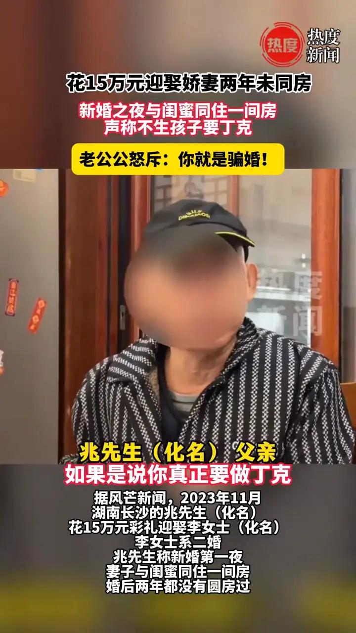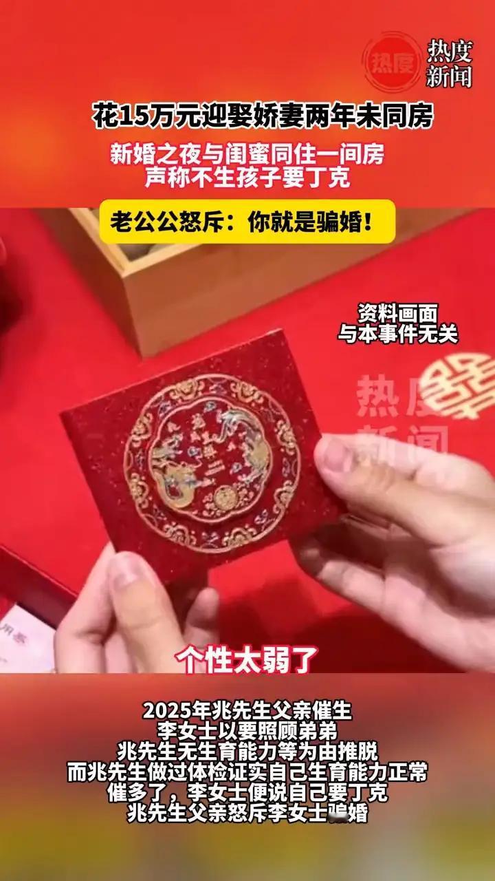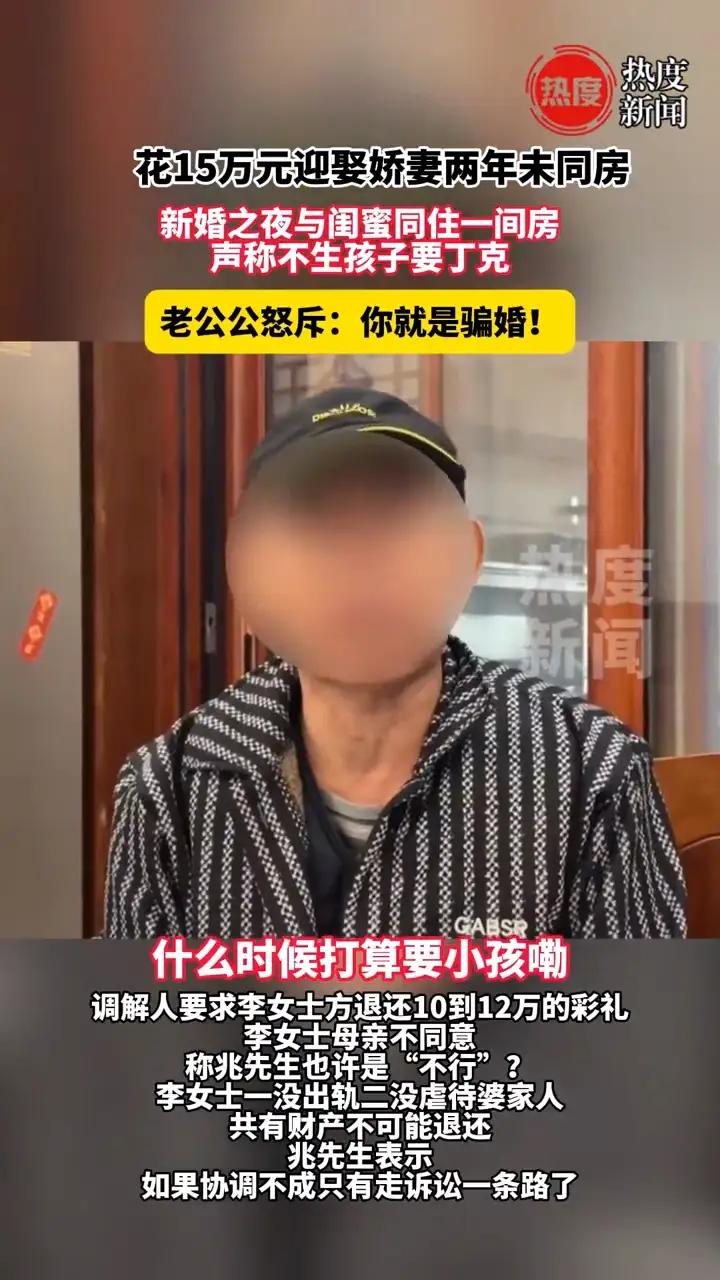 真憋屈!男子花15万娶二婚女人,老婆新婚夜和闺蜜住,2年没同房。 这个故事反映出一些令人深思的社会与婚姻问题,也让我们看到了婚姻中信任与责任的重要性。兆先生的遭遇令人痛心,也引发人们对婚姻真谛的反思。 首先,婚姻应建立在相互尊重、坦诚和信任之上。李女士隐瞒了自己不愿生育、不愿夫妻生活的事实,婚前没有与兆先生坦白,这种欺骗行为严重伤害了婚姻的基础。婚姻不是交易或隐藏真相的舞台,而是两个人共同生活、携手面对未来的承诺。 其次,李女士在婚礼当天就声称要陪闺蜜“秉烛夜谈”,并且之后多次拒绝与兆先生同房,这种行为明显表现出她对婚姻的漠视和逃避。正常的夫妻关系应包含亲密与沟通,而她的行为则让婚姻变得虚无缥缈,令人质疑她的初衷。 再次,关于生育问题,结婚前如果没有明确沟通,事后突然以“丁克”或“不能生育”来推脱责任,既不负责任,也伤害了伴侣的感情。夫妻之间应在重要问题上达成一致,而不是事后找借口。 此外,彩礼问题也是一个敏感且复杂的话题。彩礼本应是双方家庭的见面礼或一种传统,但如果一方在婚后反悔或不认可,拒绝归还,便容易引发矛盾。兆先生家退还部分彩礼是理性的,而李女士家拒绝退还,则显得不合理,尤其是在女方没有实质性损失的情况下。 最后,这个案例提醒我们:在婚姻中,诚信和责任同样重要。如果双方无法达成基本的信任和理解,婚姻很难长久。面对婚姻中的问题,理性的沟通和合法的途径才是解决矛盾的正确方式,而非单方面的逃避和利用。 希望所有正在或准备步入婚姻的人,都能以诚待人,以责任为重。只有这样,婚姻才能成为温暖而坚实的港湾,而不是充满纷争和伤害的战场。对兆先生而言,维护自己的权益,追求合理的解决方案,是应得的正义。愿每个人都能在爱情与婚姻中找到真正的幸福与尊重。